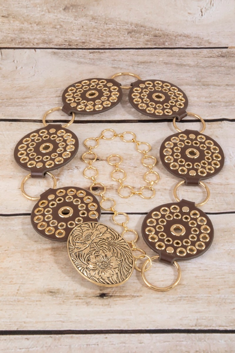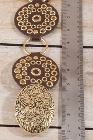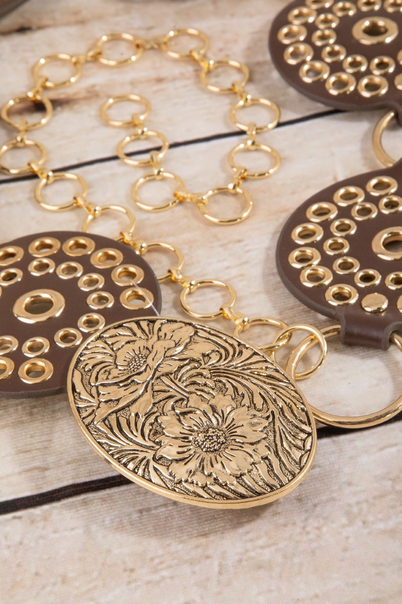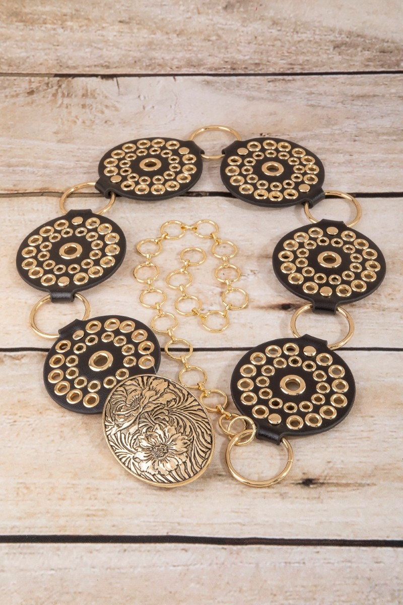 Vegan Leather Studded Disc Floral Concho Chain Belt