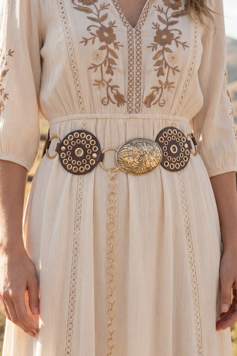 • This chain belt brings a stunning vegan leather studded disc floral medallion style. Savor the craftsmanship that goes beyond the ordinary, as this chain belt effortlessly captivates attention.