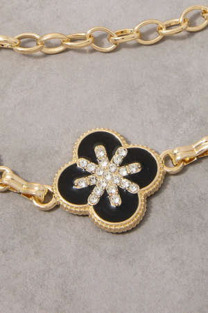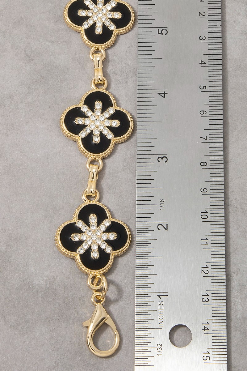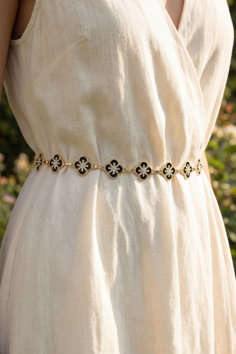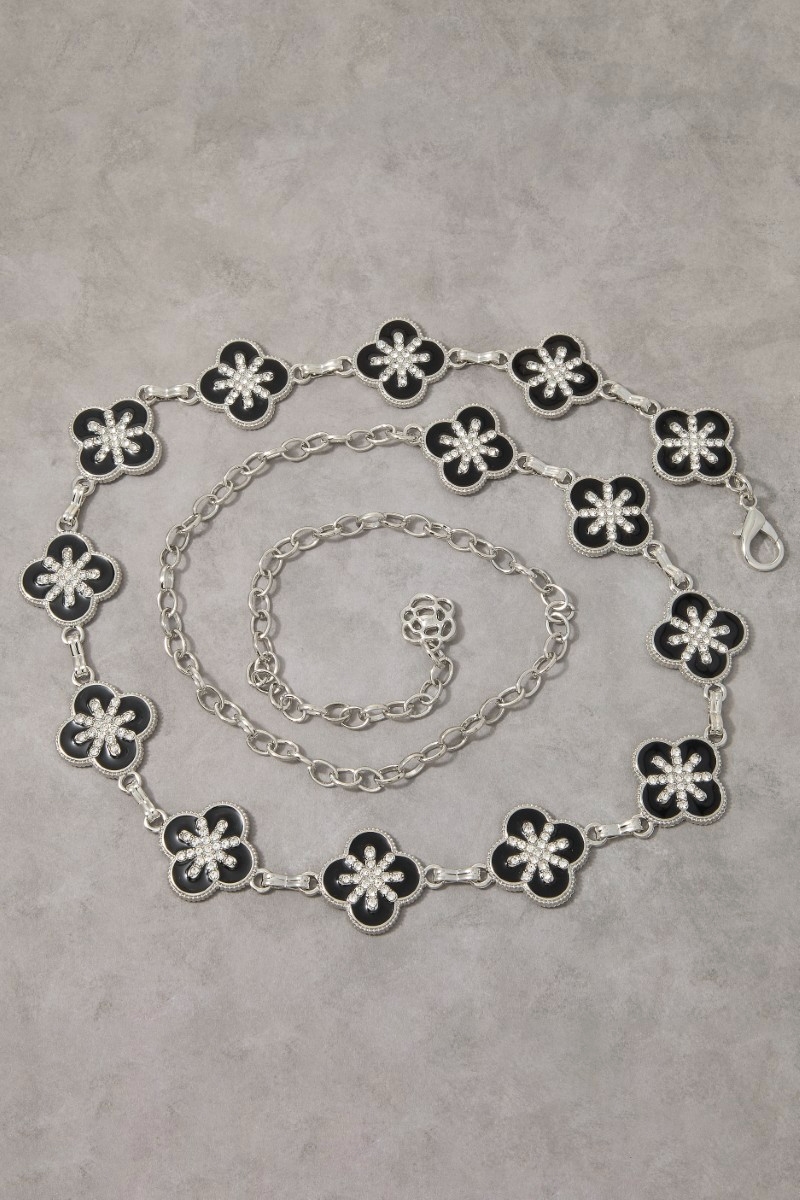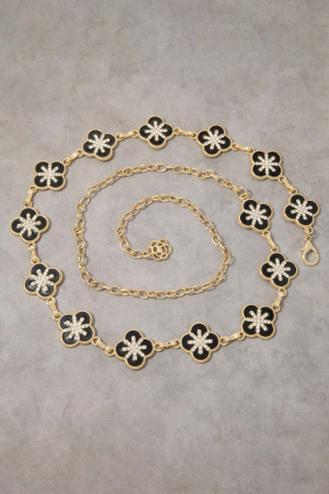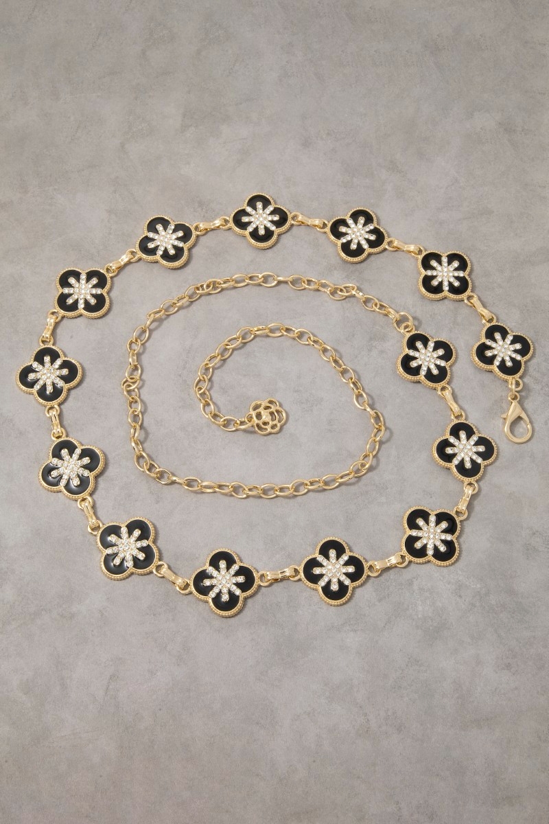 • This chain belt introduces a unique gold black enamel & cubic zirconia clover link style. Experience a burst of creativity in accessorizing as this piece effortlessly sets the tone for your unique style.