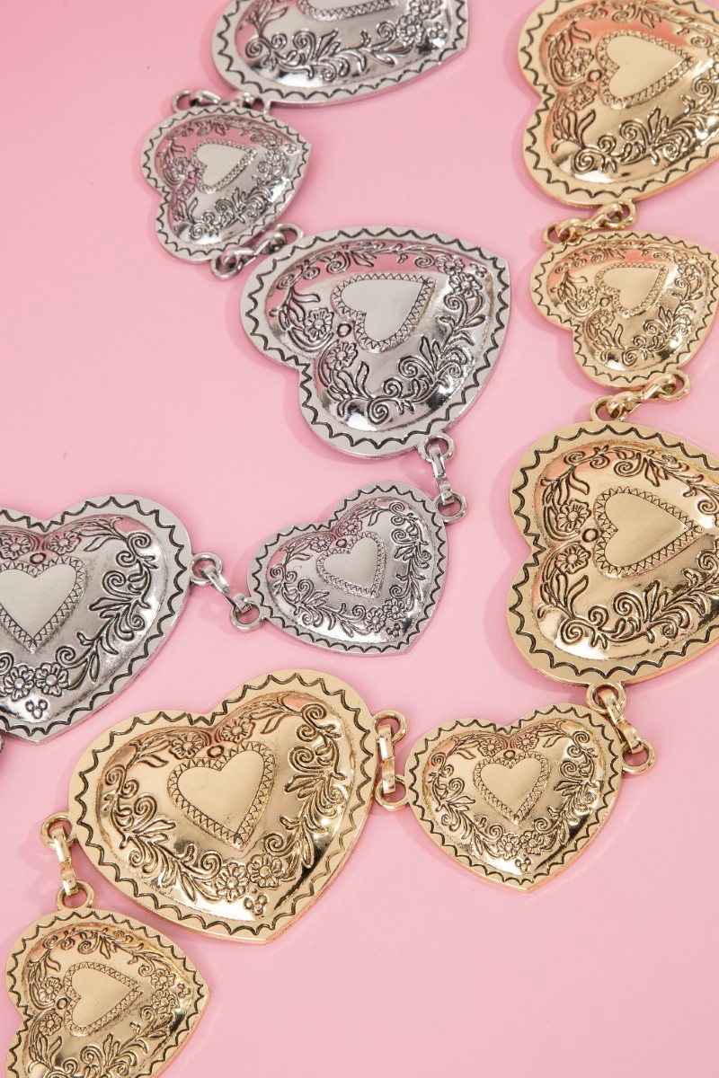 • This chain belt displays a vibrant engraved heart style. Embark on a journey of sartorial refinement as this chain belt effortlessly complements your fashion sense.