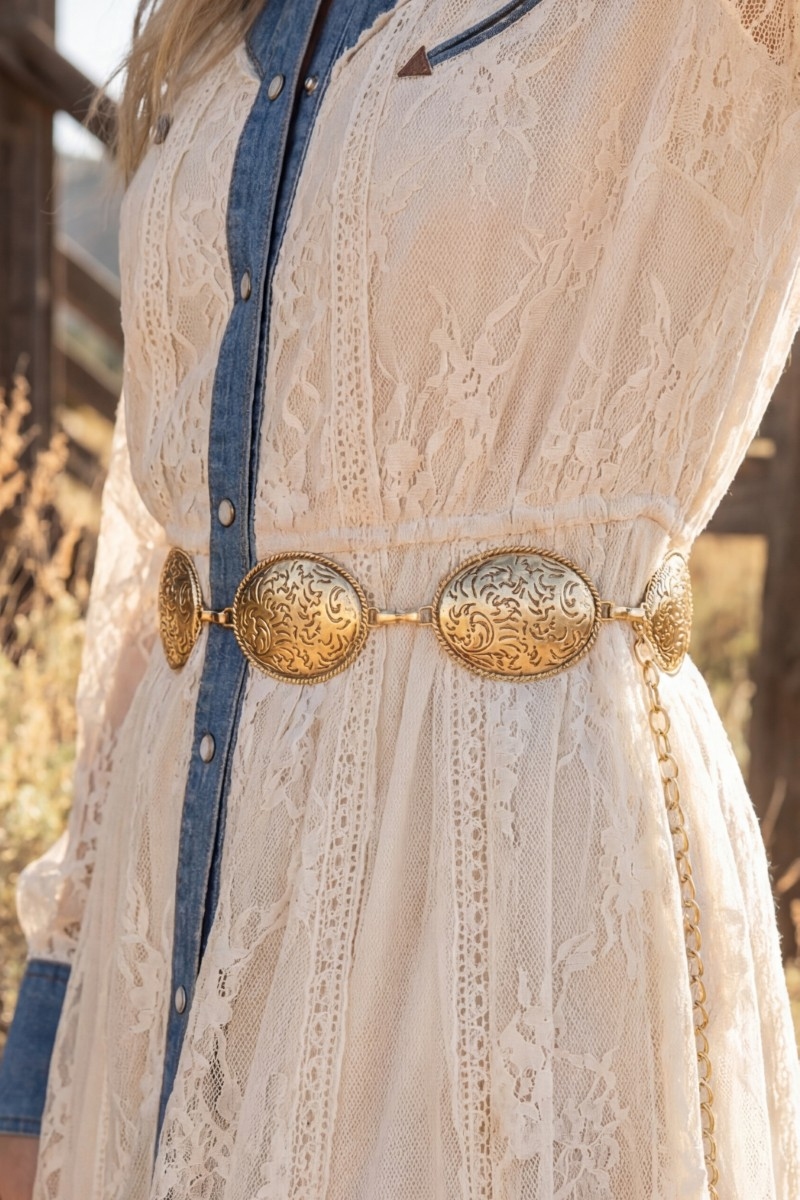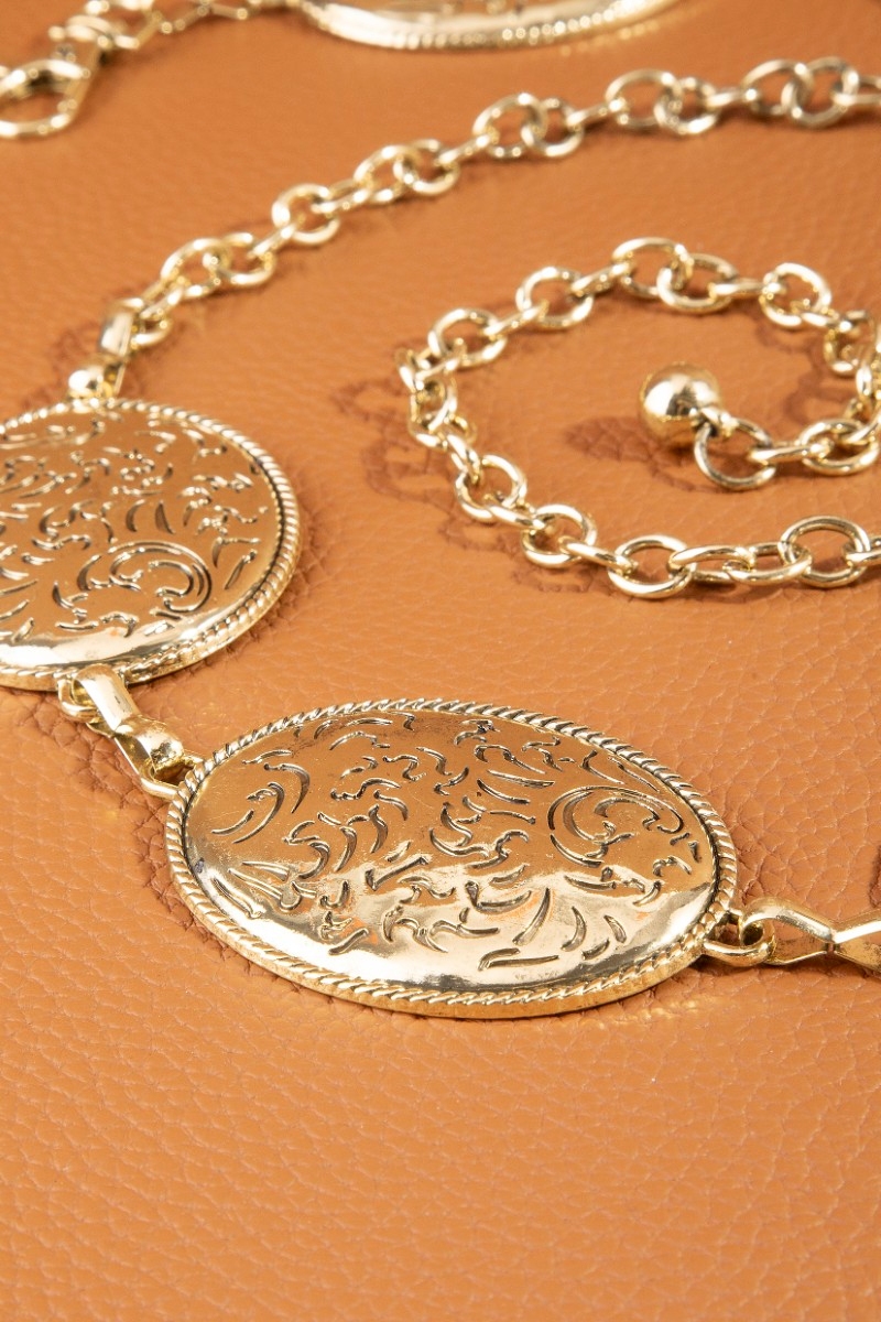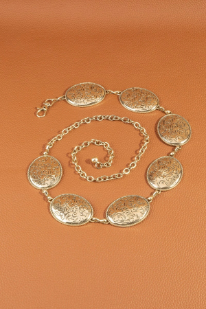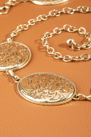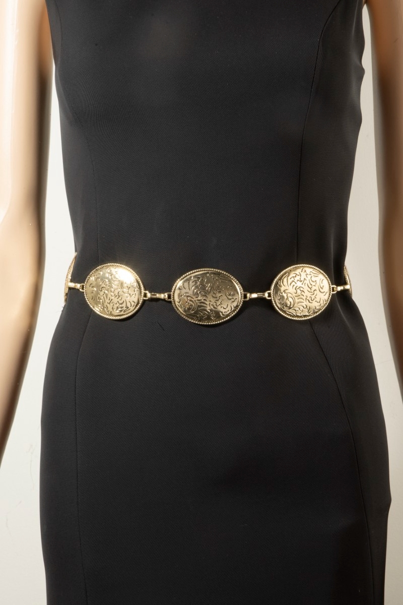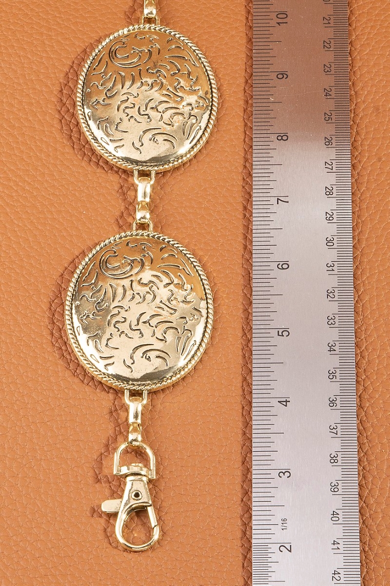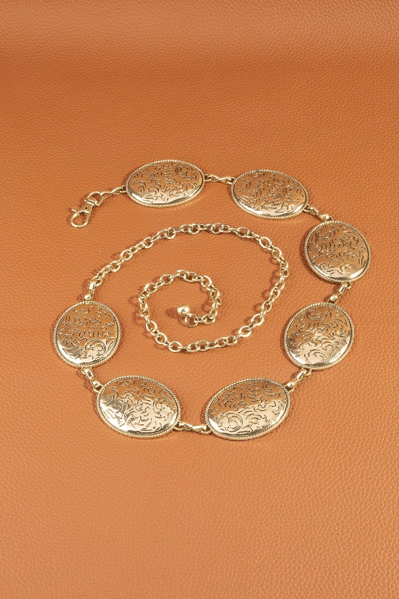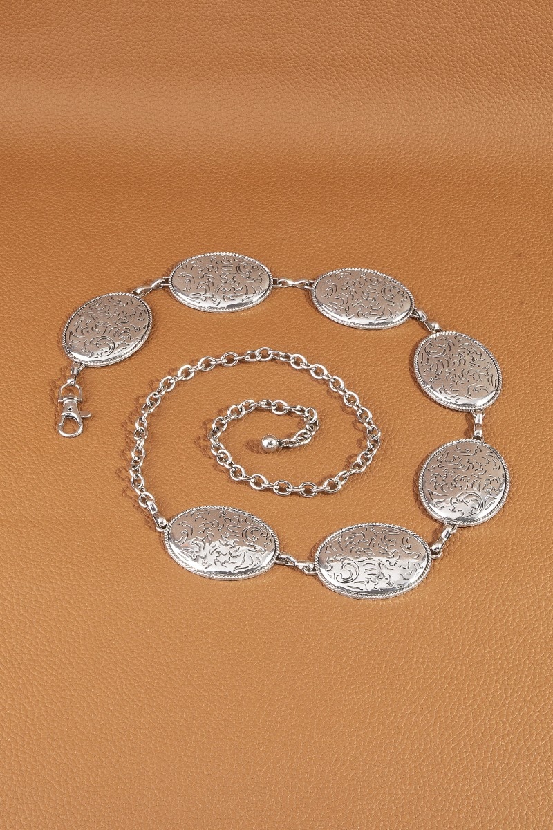 • This chain belt displays a fashionable oval floral etched concho style. Experience refined sophistication with this understated yet stylish piece.