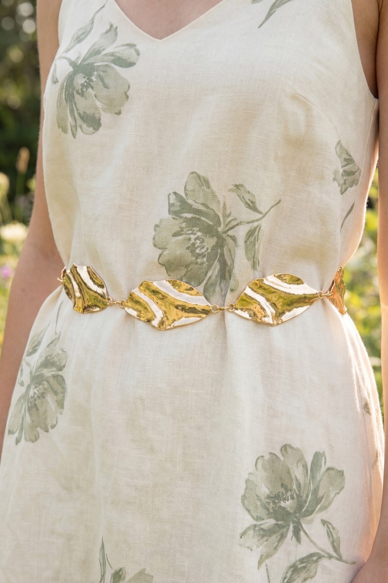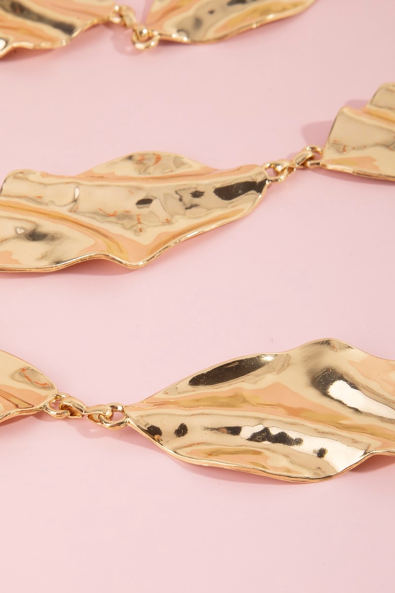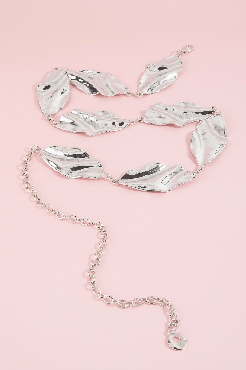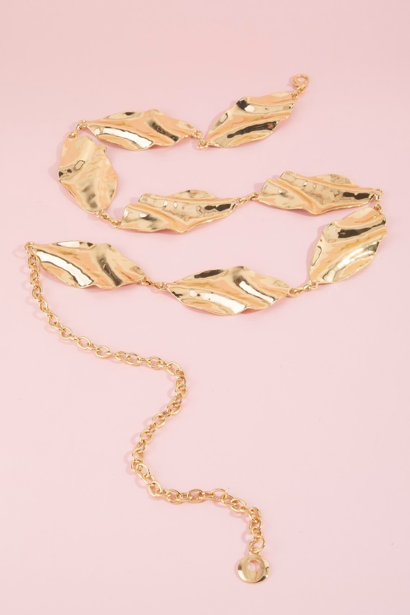 - This chain belt brings a stunning hammered leaf link style. Indulge in the artistry of accessorizing with this unique piece.