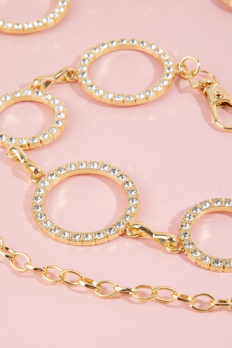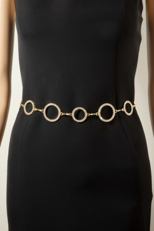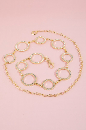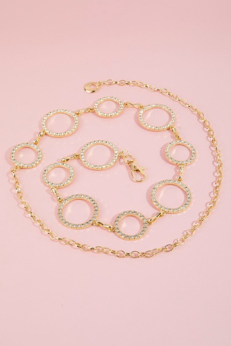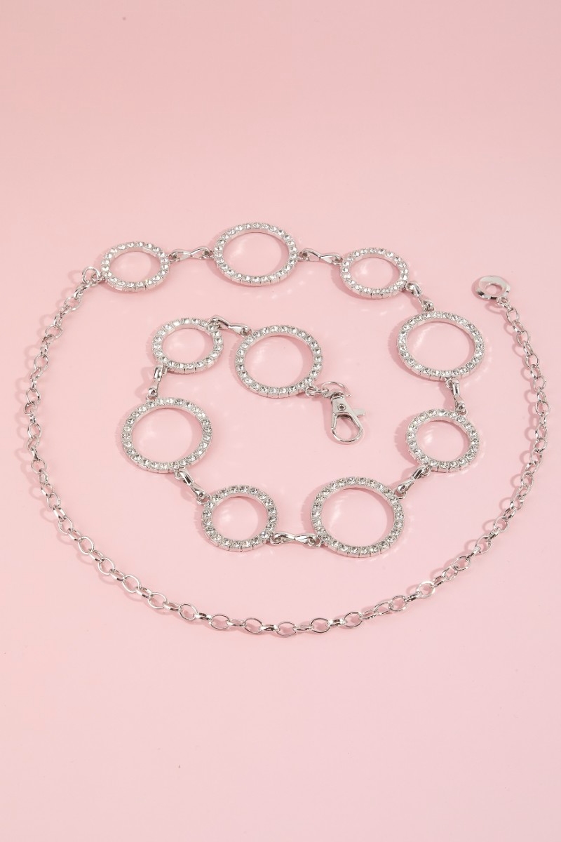 • This chain belt features a fashionable crystal rhinestone circle style. Experience a subtle blend of modernity and classic charm as this chain belt effortlessly adorns your ensemble.