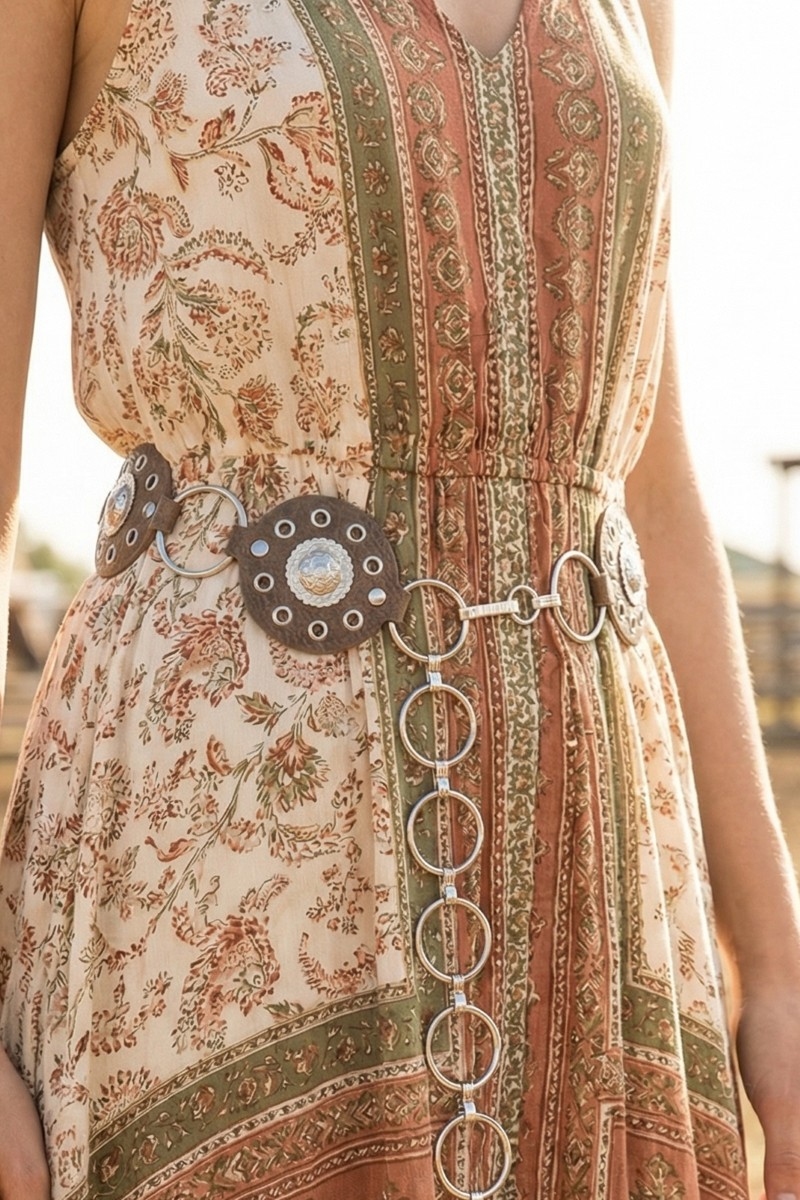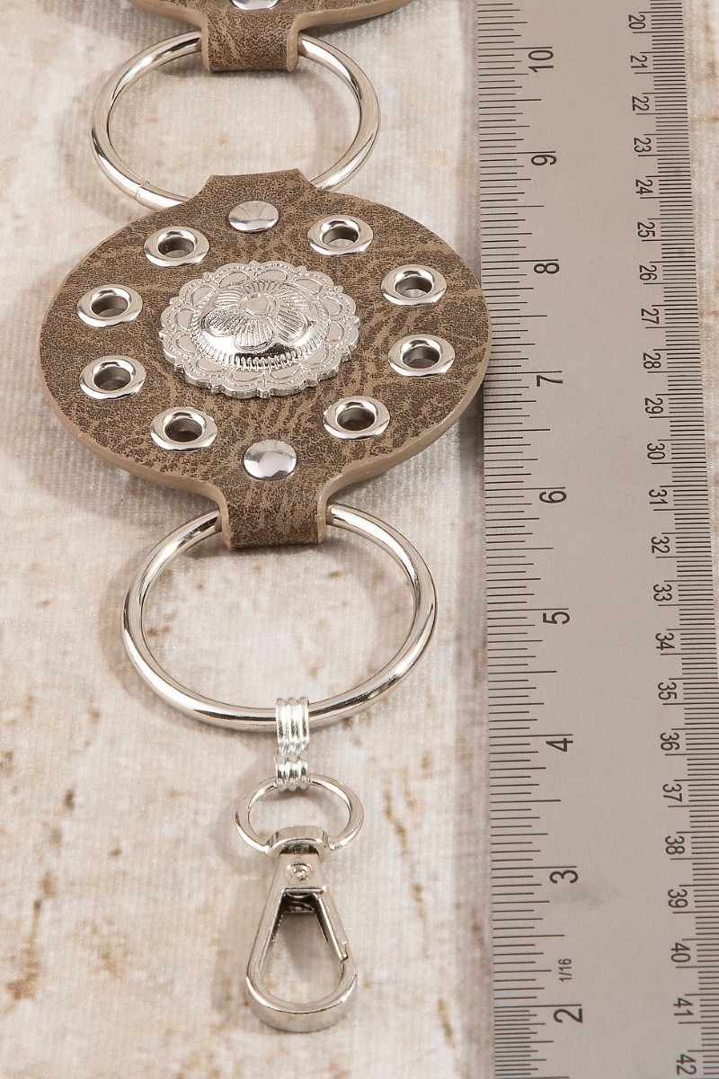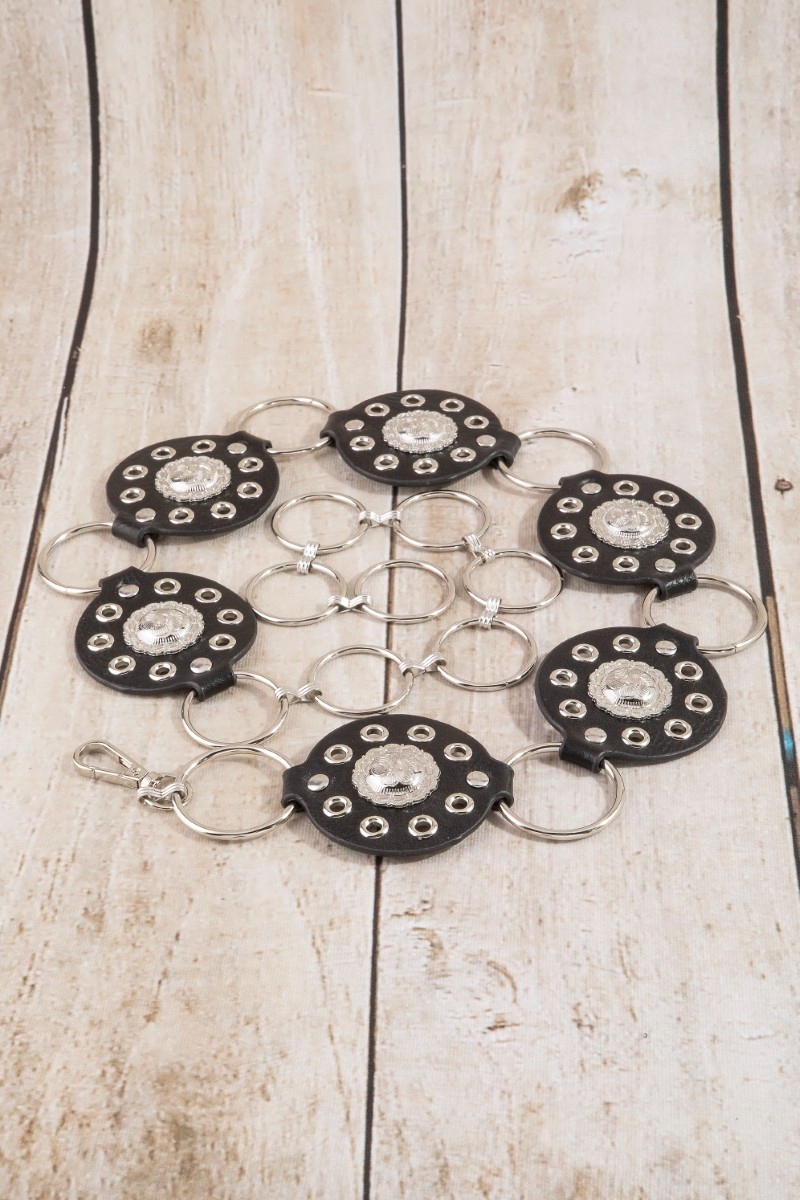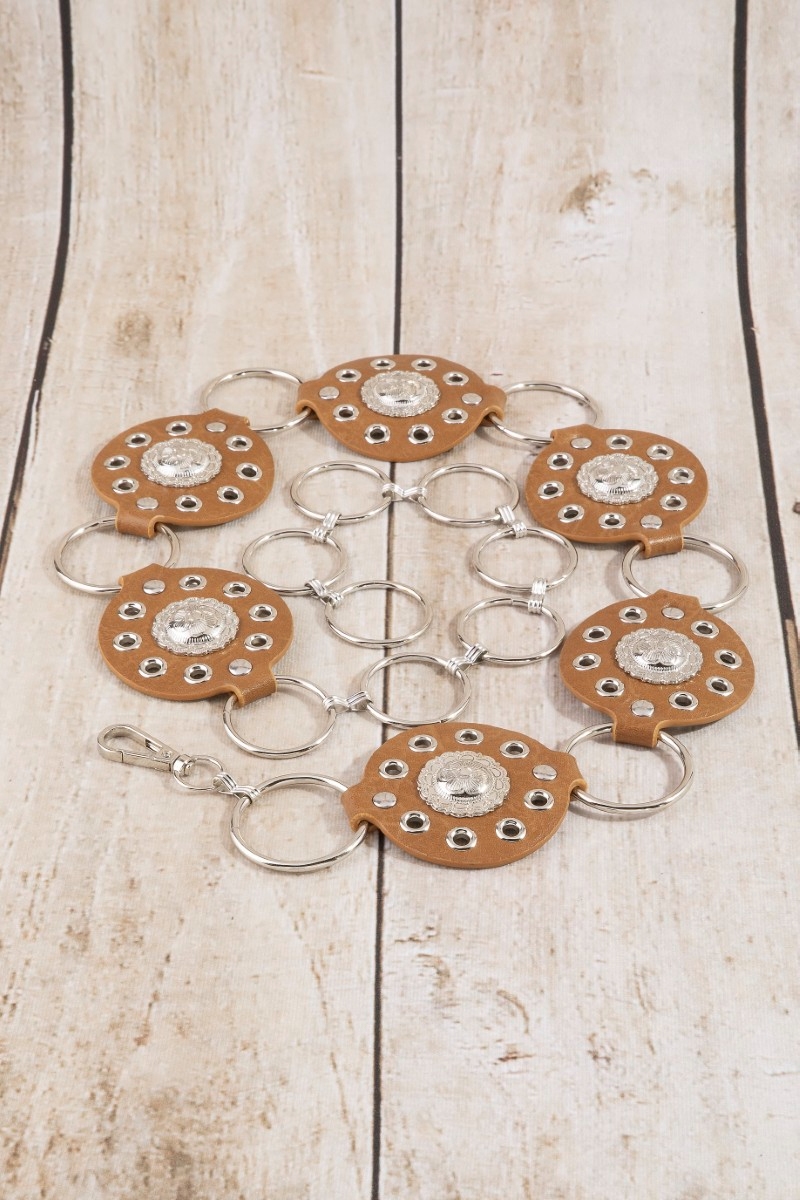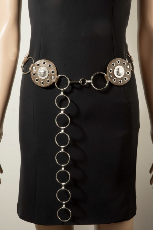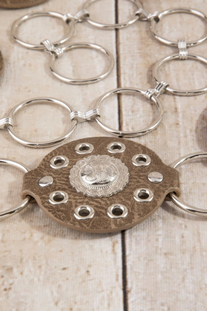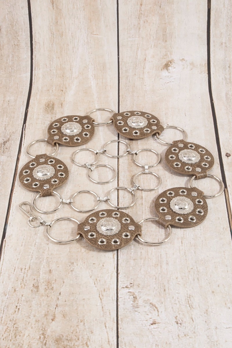 - This chain belt features a fashionable round concho ring style. Experience refined sophistication with this understated yet stylish piece.