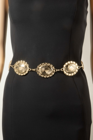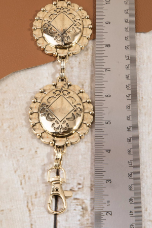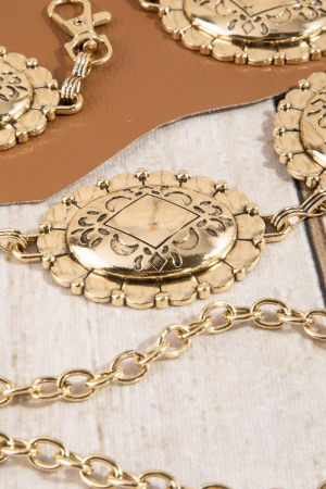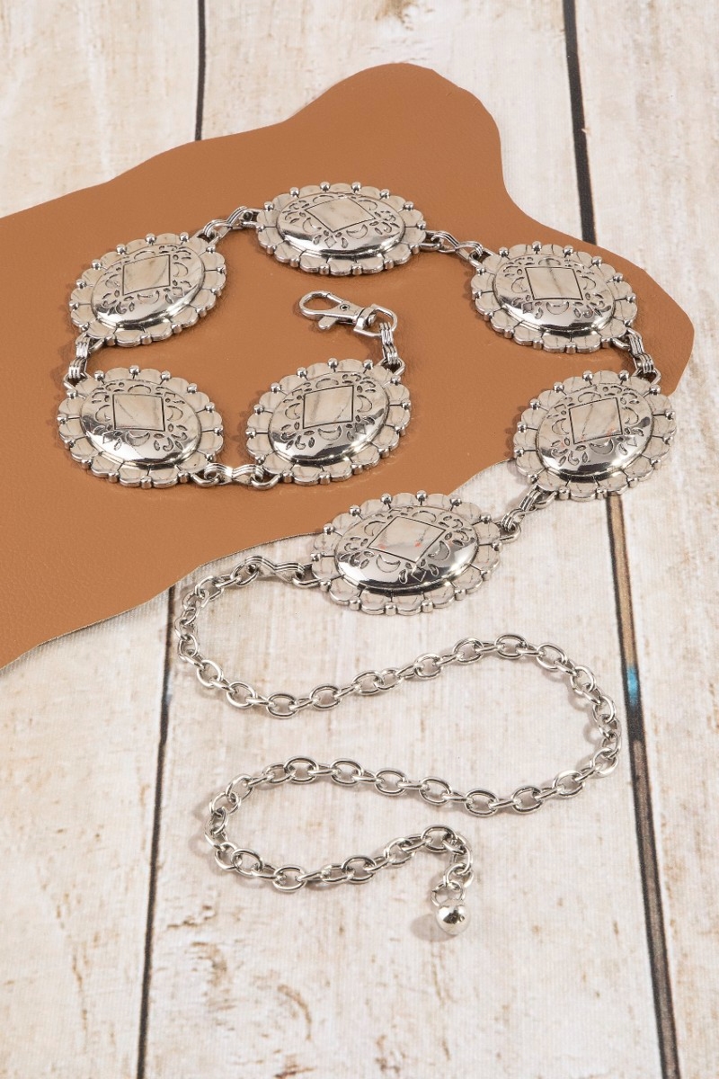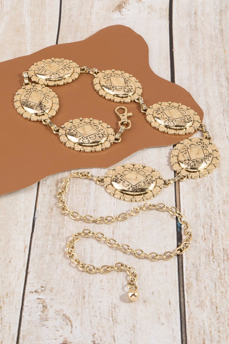 • This chain belt displays a vibrant round filigree concho style. Elevate your ensemble with this chic, timeless chain belt.