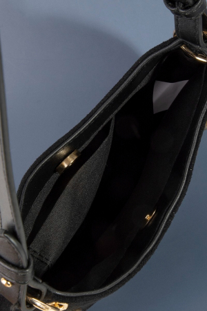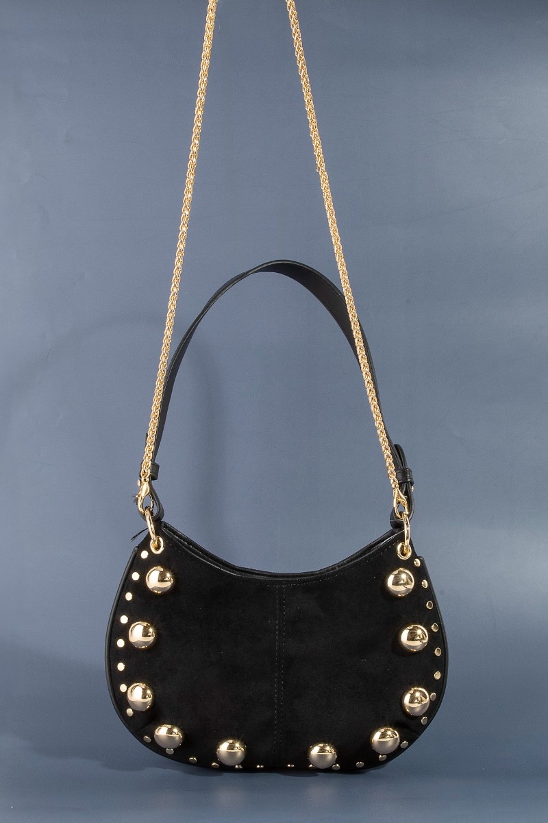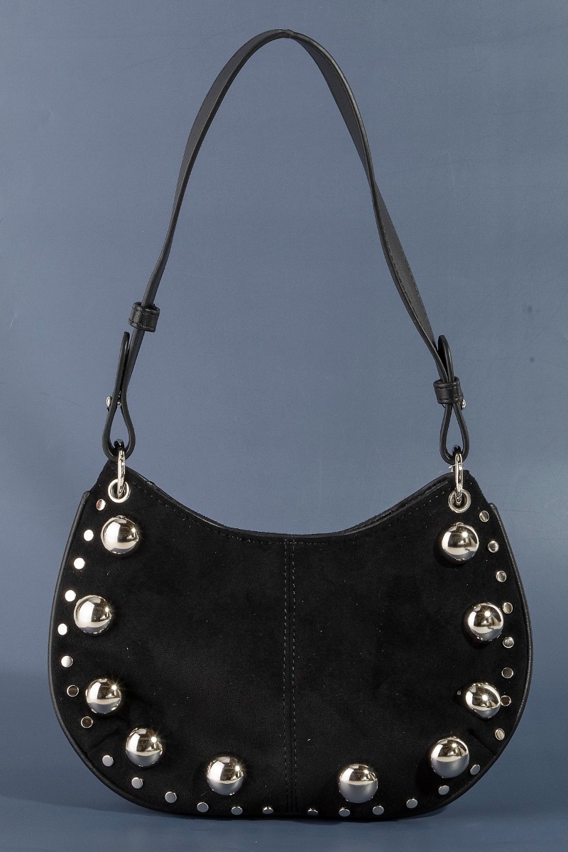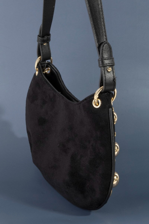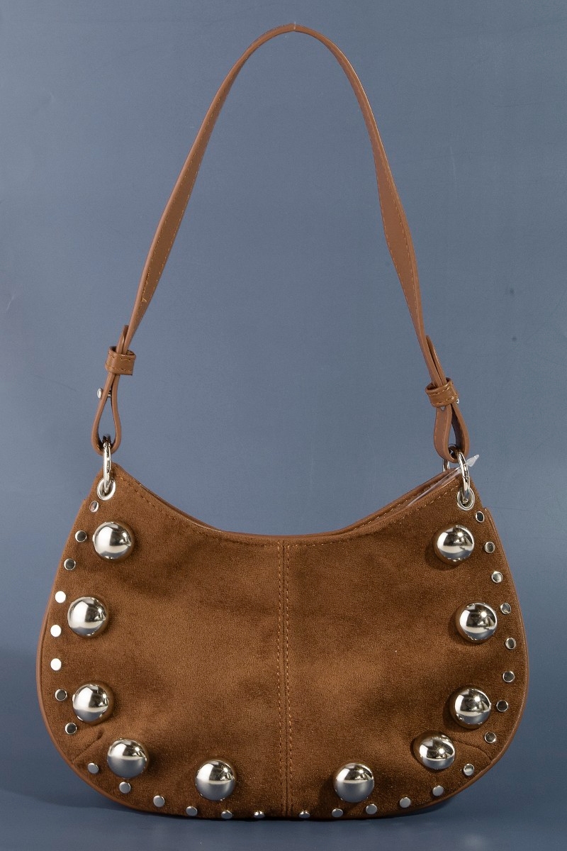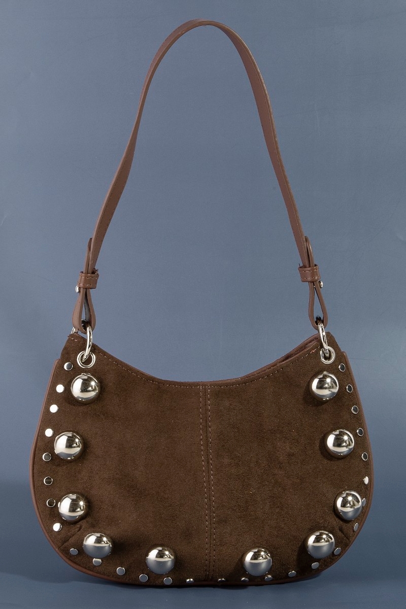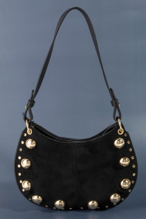 • This shoulder bag introduces a unique ball studded trim suede hobo s style. Indulge in the artistry of accessorizing with this unique piece.
