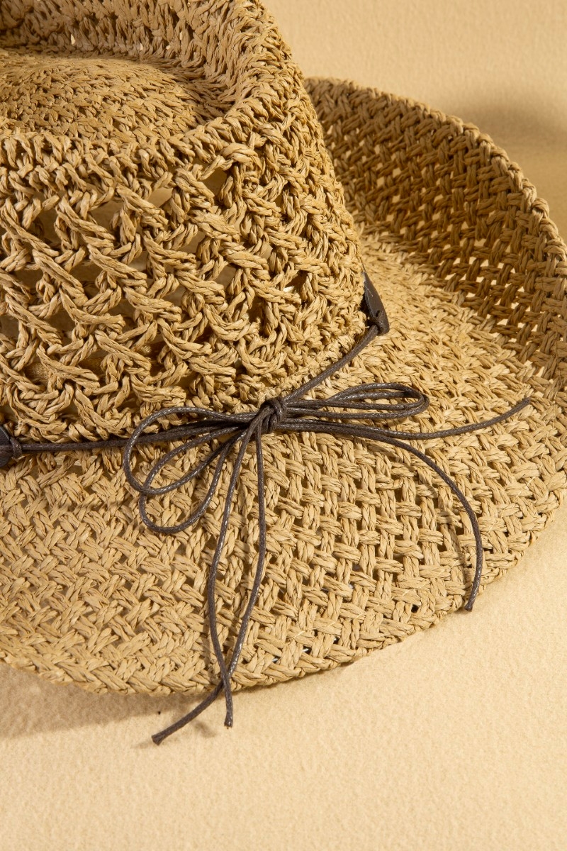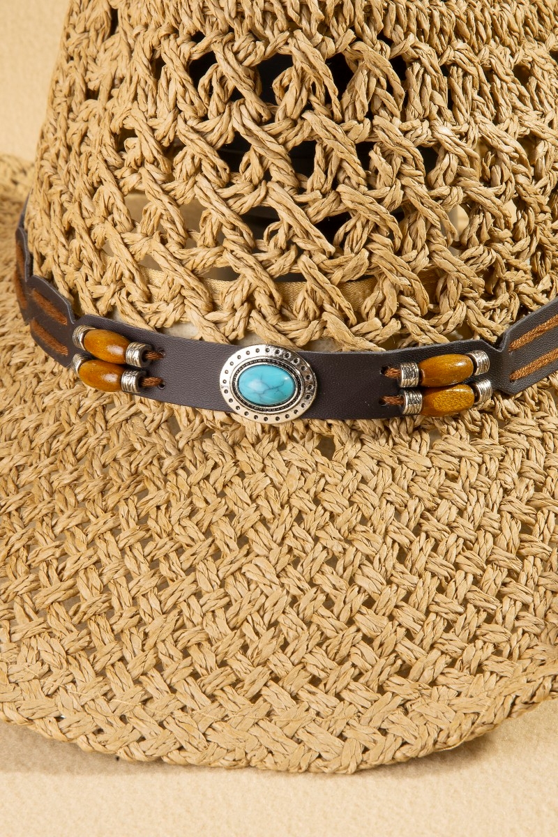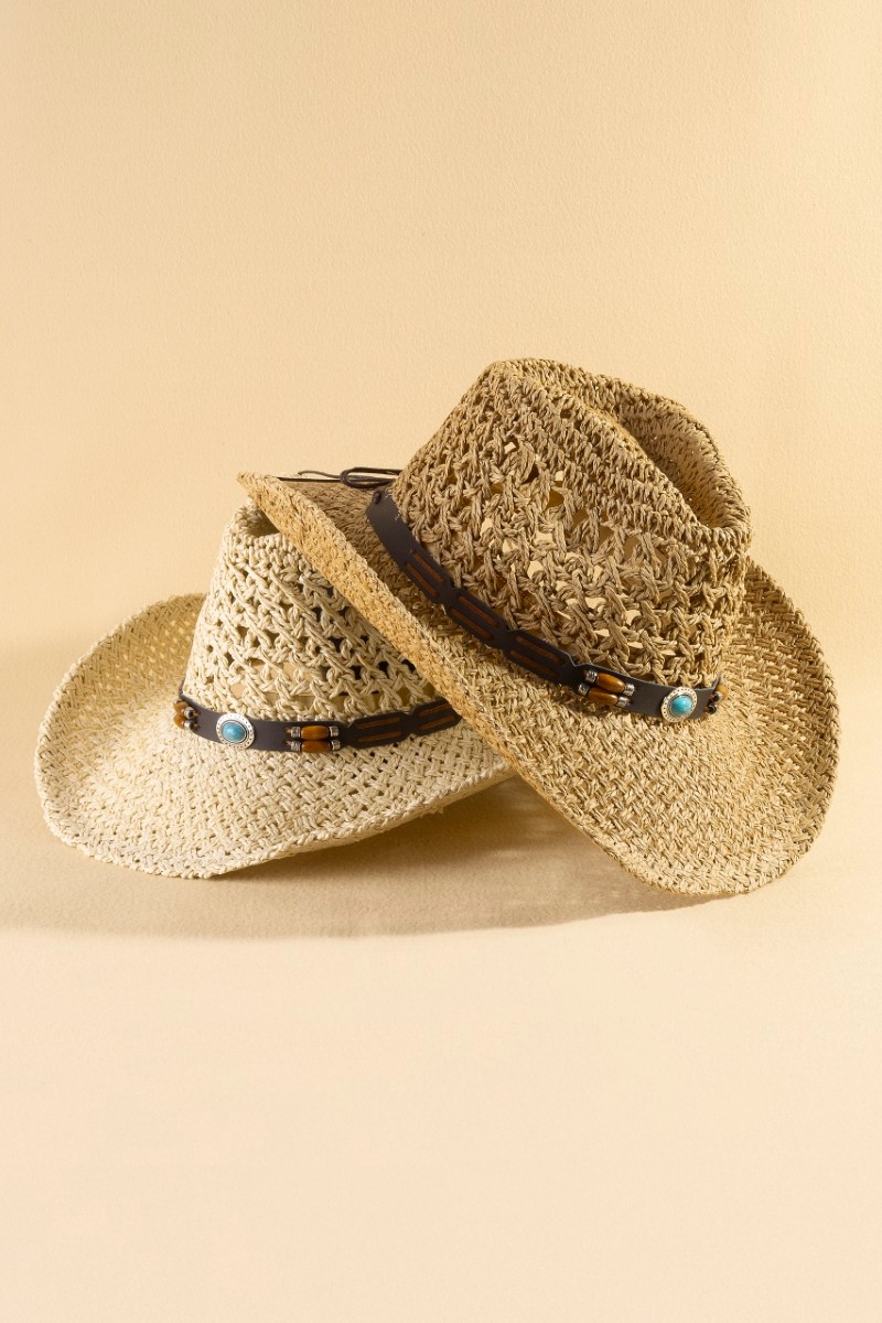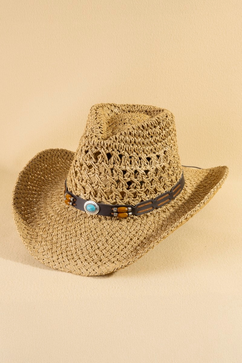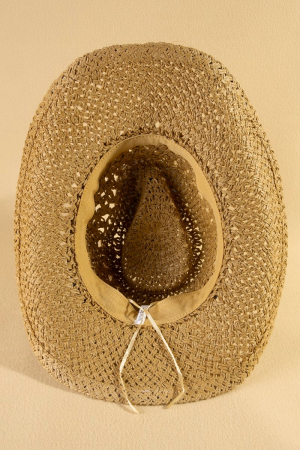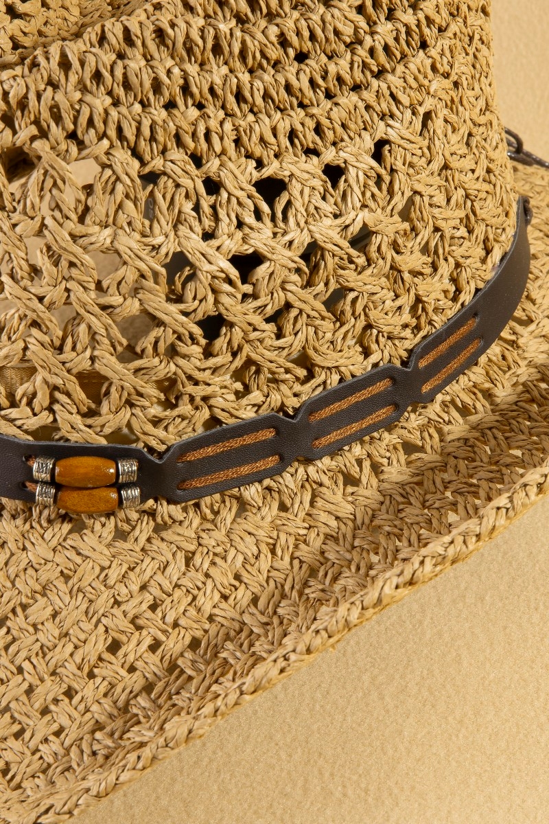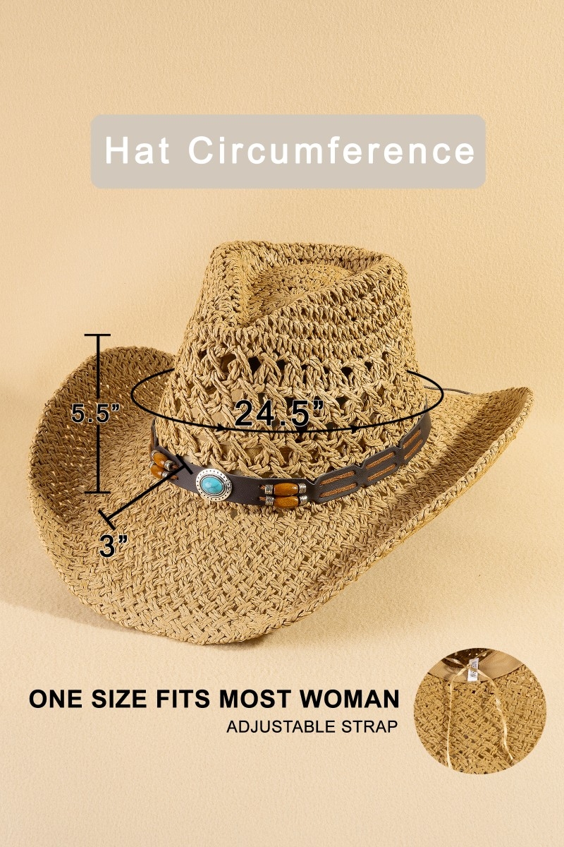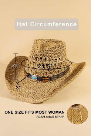 • This cowboy hat showcases a timeless straw weave leather strap style. Indulge in the artistry of accessorizing with this unique piece.