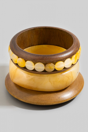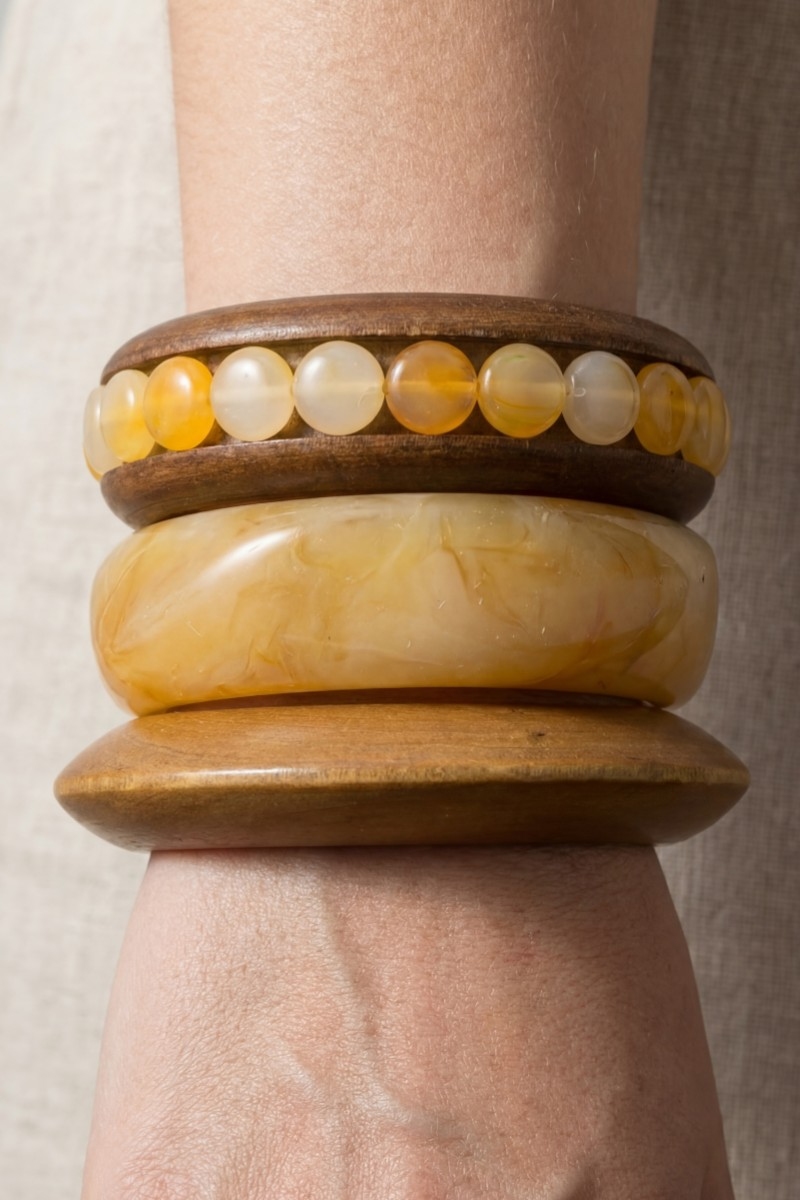 - This bangle bracelet introduces a unique wood and resin mixed set style. Step into a world of refined taste as this bangle bracelet effortlessly refines the details of your outfit.