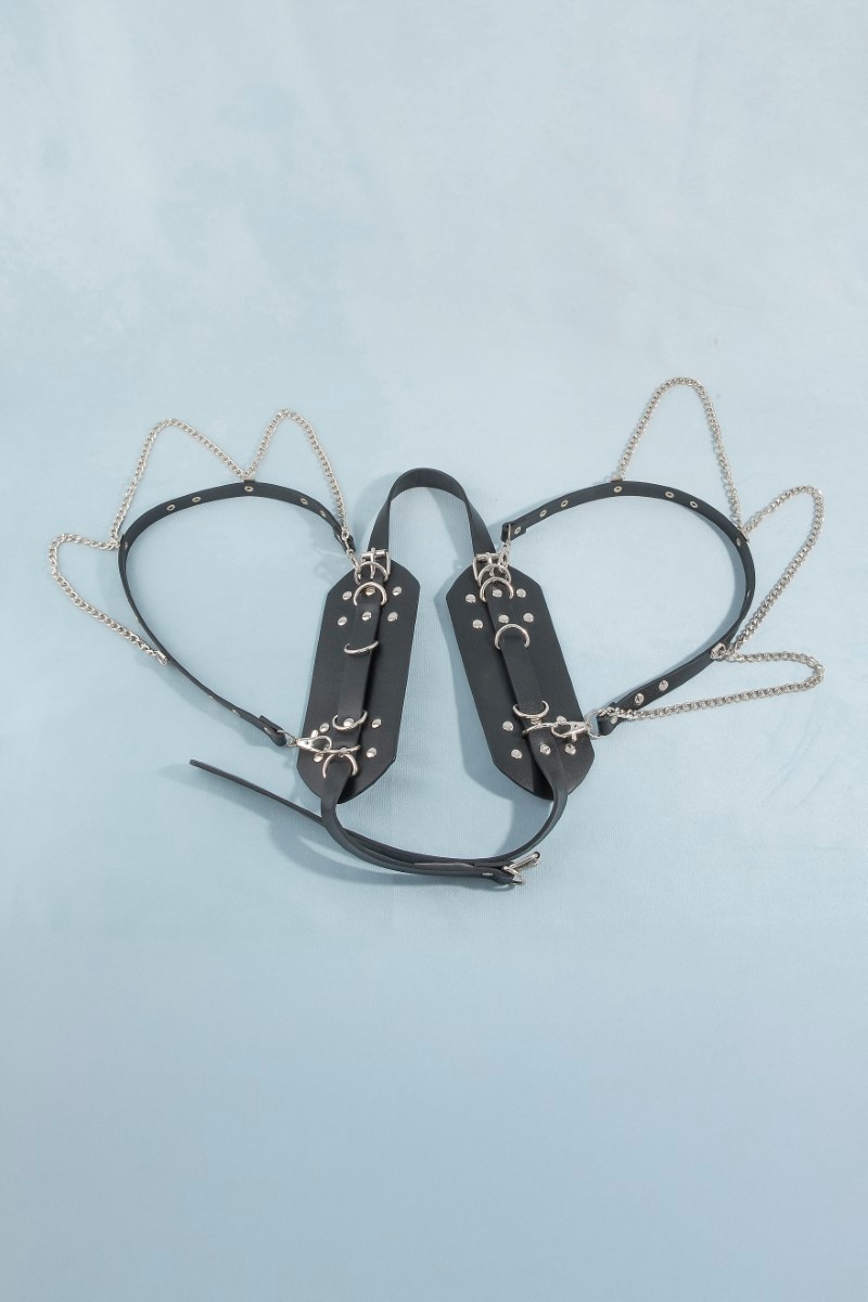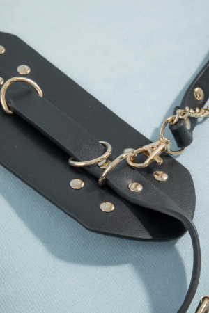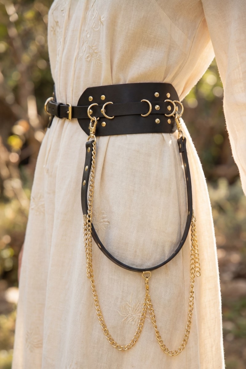 - This belt brings a luxurious wide studded vegan leather with chain drape style. Explore a refined sense of style with this belt, seamlessly elevating the chic factor of your look.