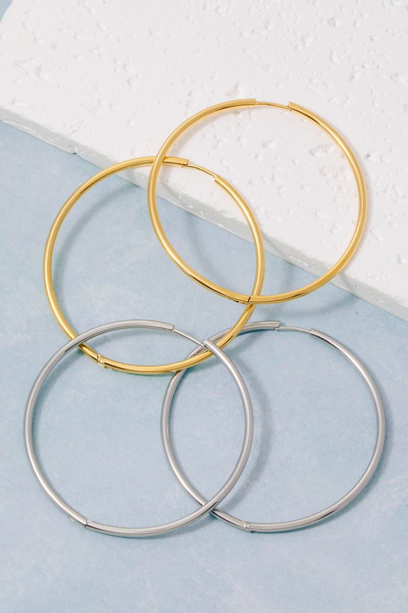 • This pair of hoop earrings showcases a timeless secret box stainless steel large thin hinge style. Experience a burst of creativity in accessorizing as this piece effortlessly sets the tone for your unique style.