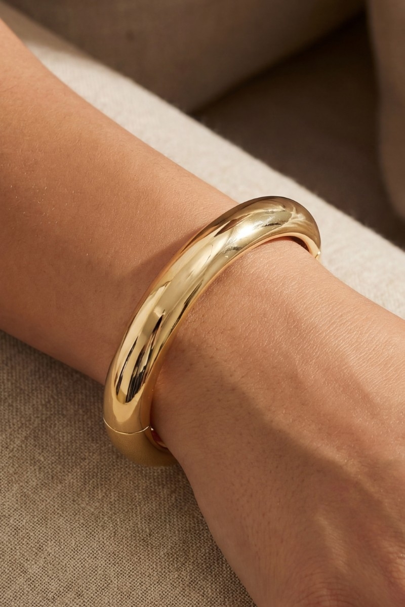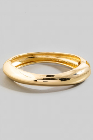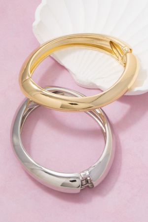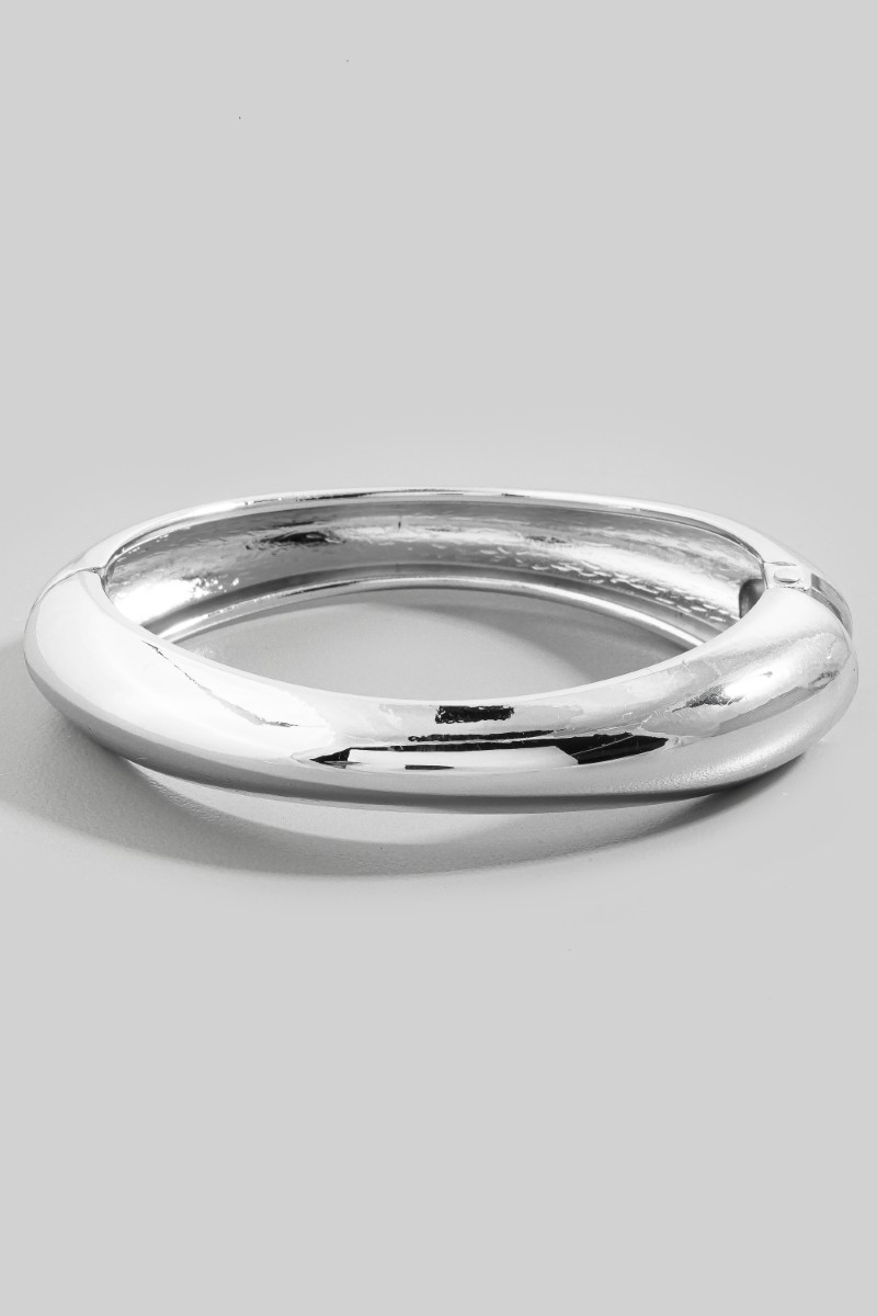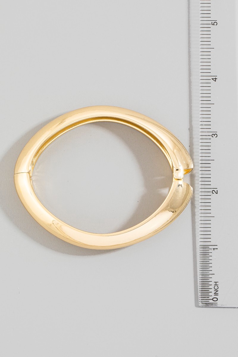 • This bangle bracelet introduces a unique polished metallic hinged style. Redefine your look effortlessly with this standout, on-trend piece.