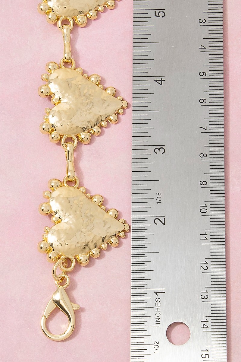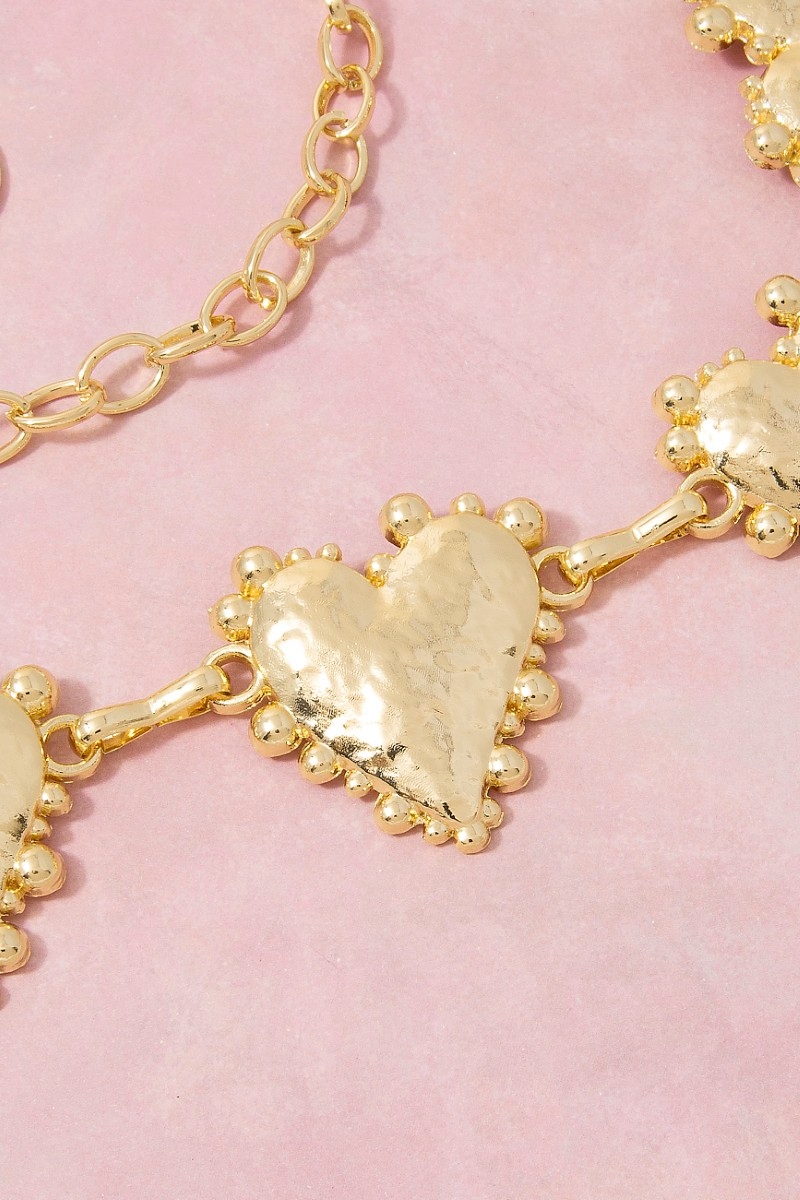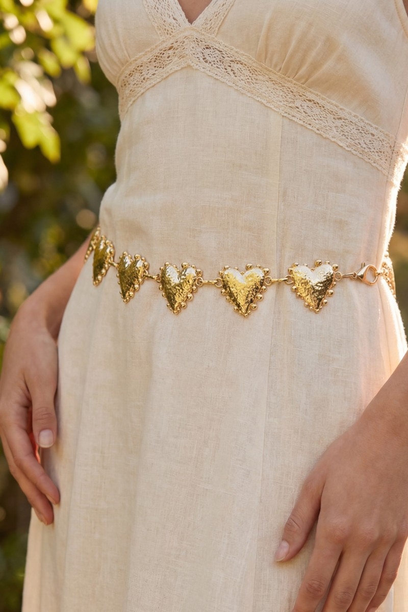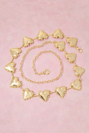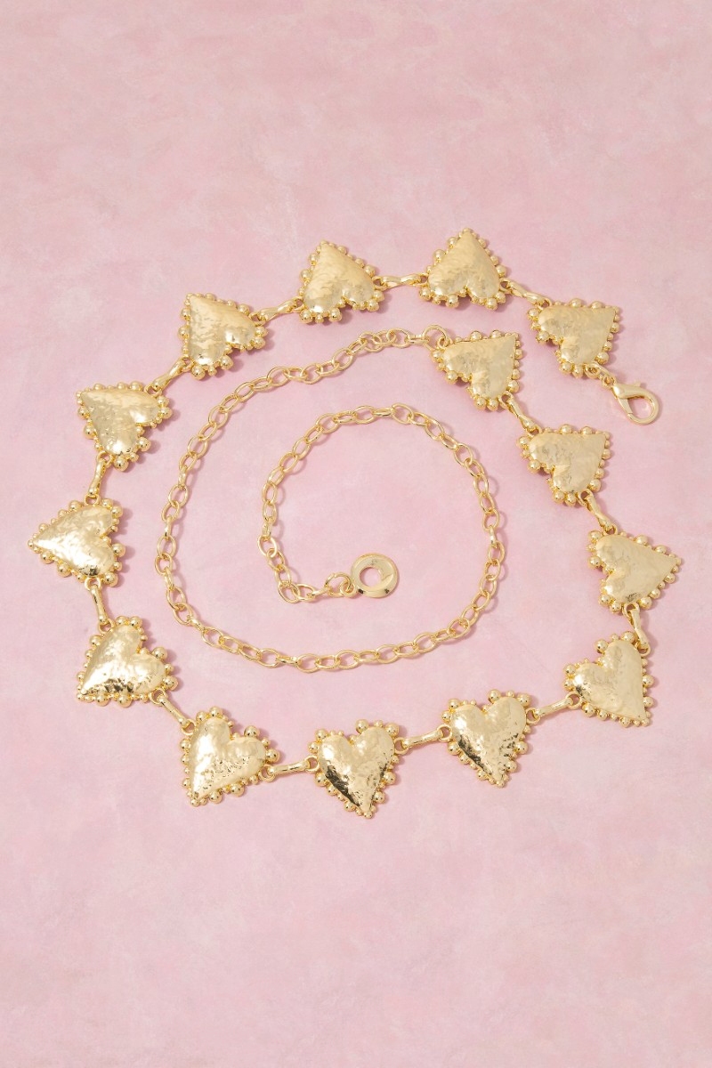 - This chain belt brings a luxurious gold hammered heart link style. Experience the joy of accessorizing with this piece that effortlessly combines versatility and charm.