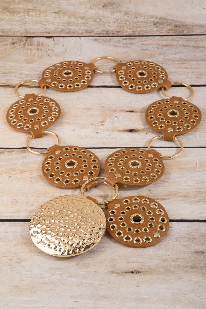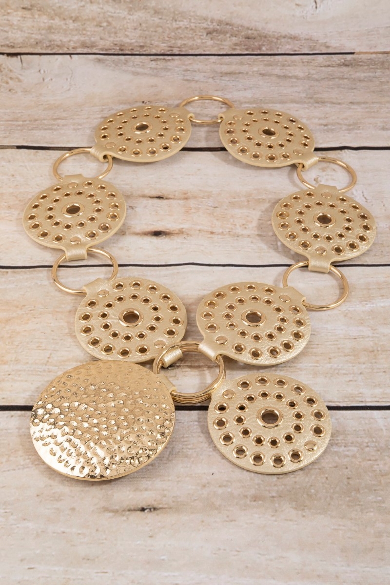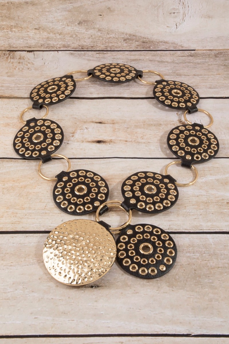 - This belt adds a modern hammered medallion chain leather studded disc style. Embark on a journey of sartorial refinement as this belt effortlessly complements your fashion sense.