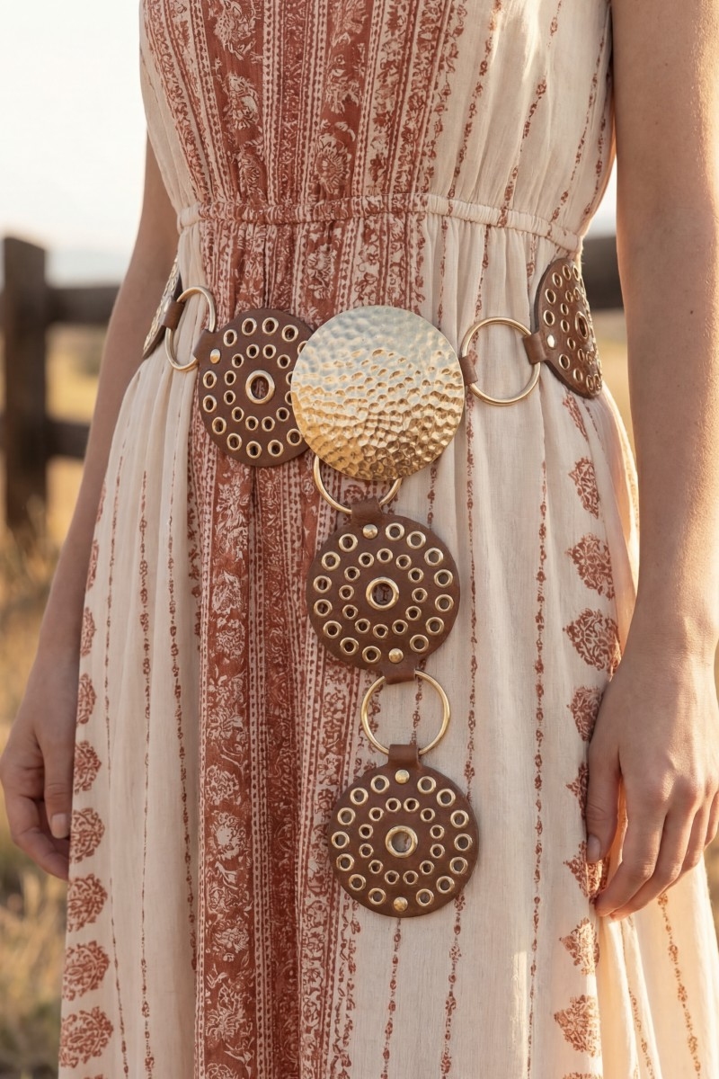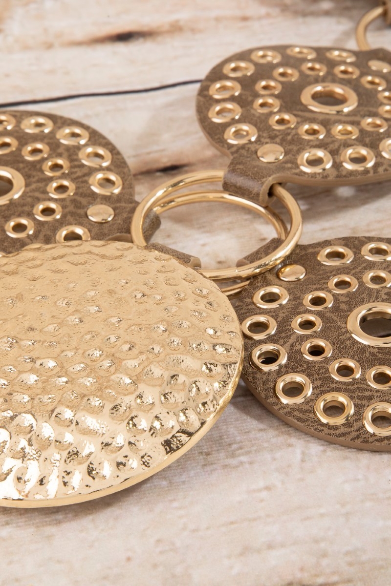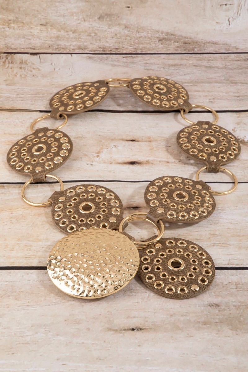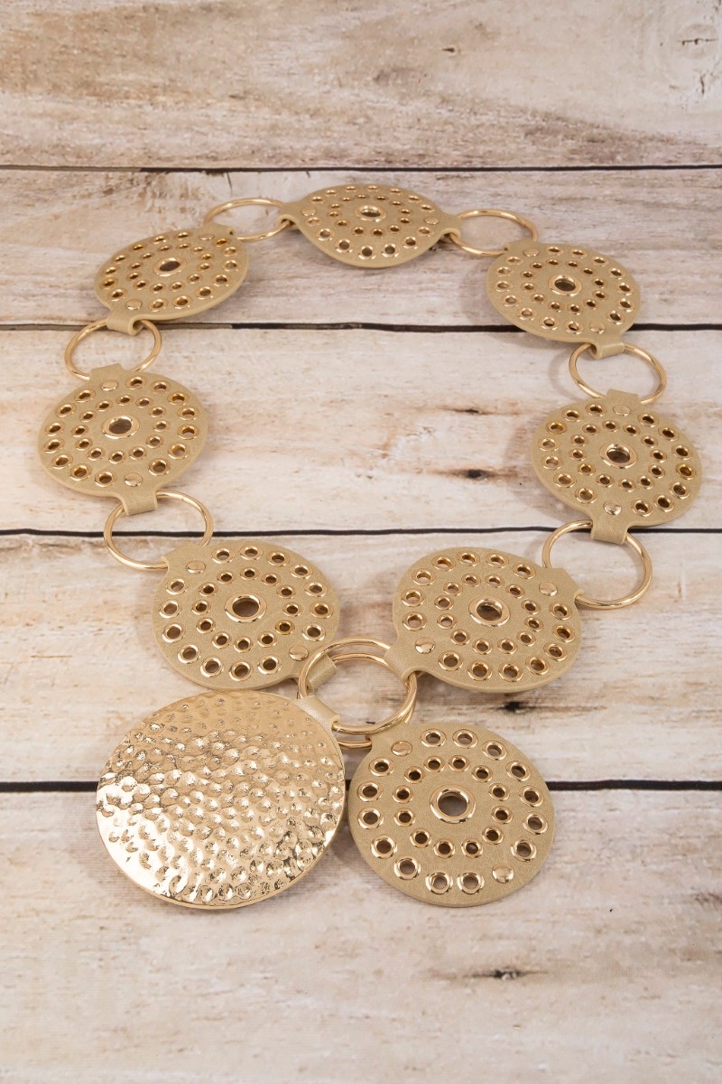 - This belt adds a modern hammered medallion chain leather studded disc style. Embark on a journey of sartorial refinement as this belt effortlessly complements your fashion sense.