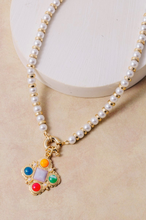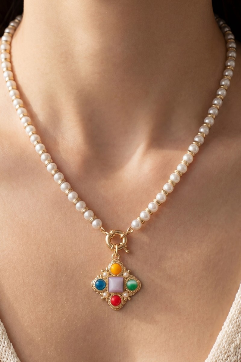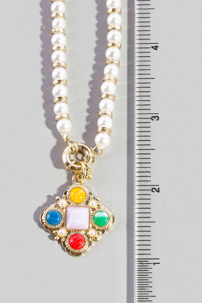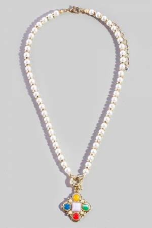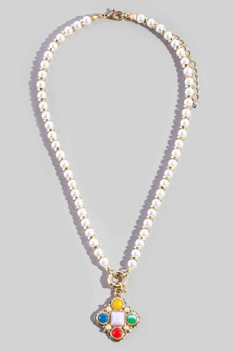 - This pendant necklace displays a vibrant pearl beaded gemstone clover style. Elevate your ensemble with this pendant necklace that effortlessly captures the essence of refined fashion.