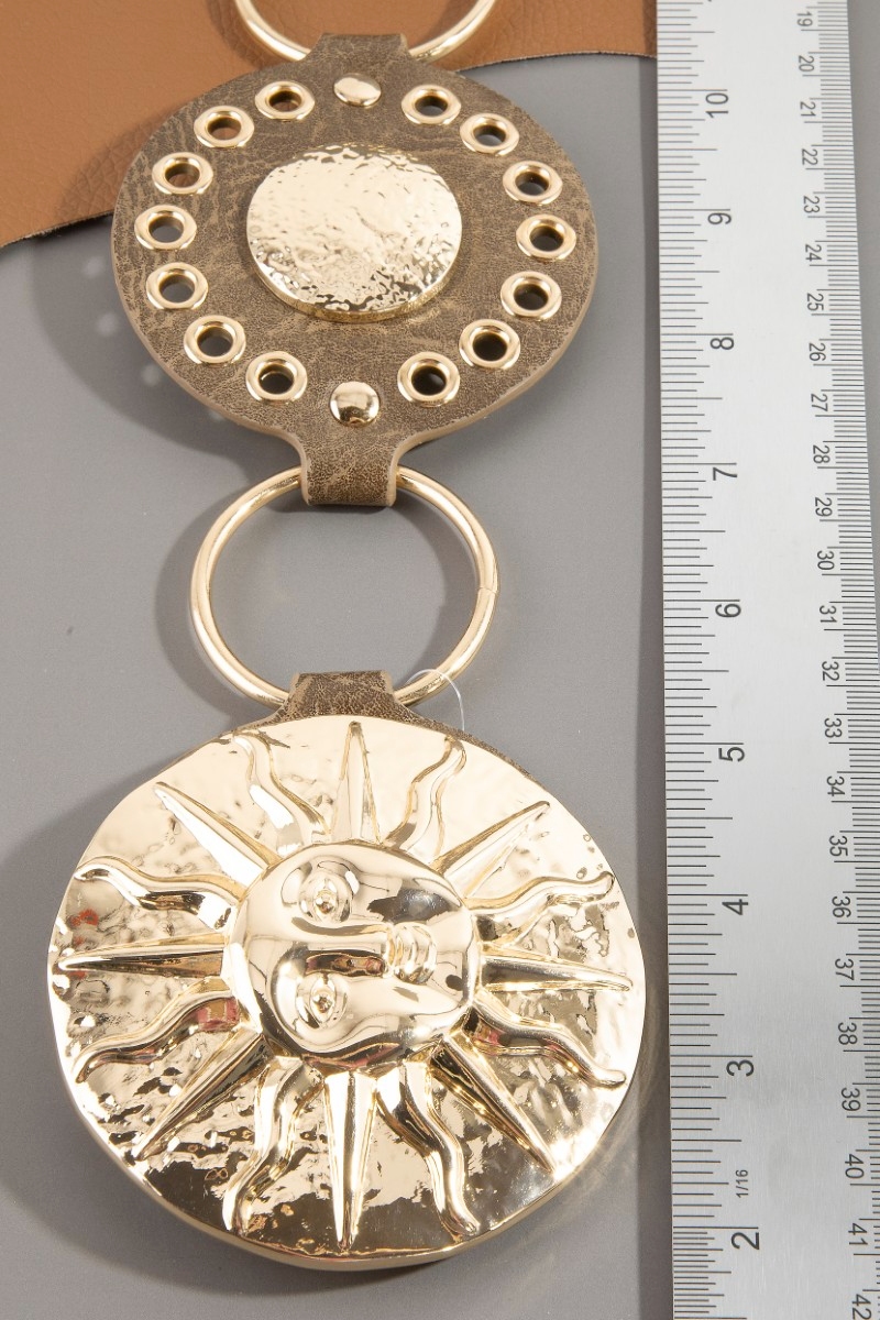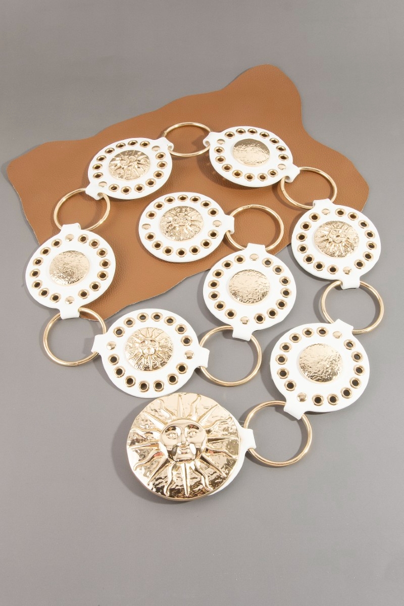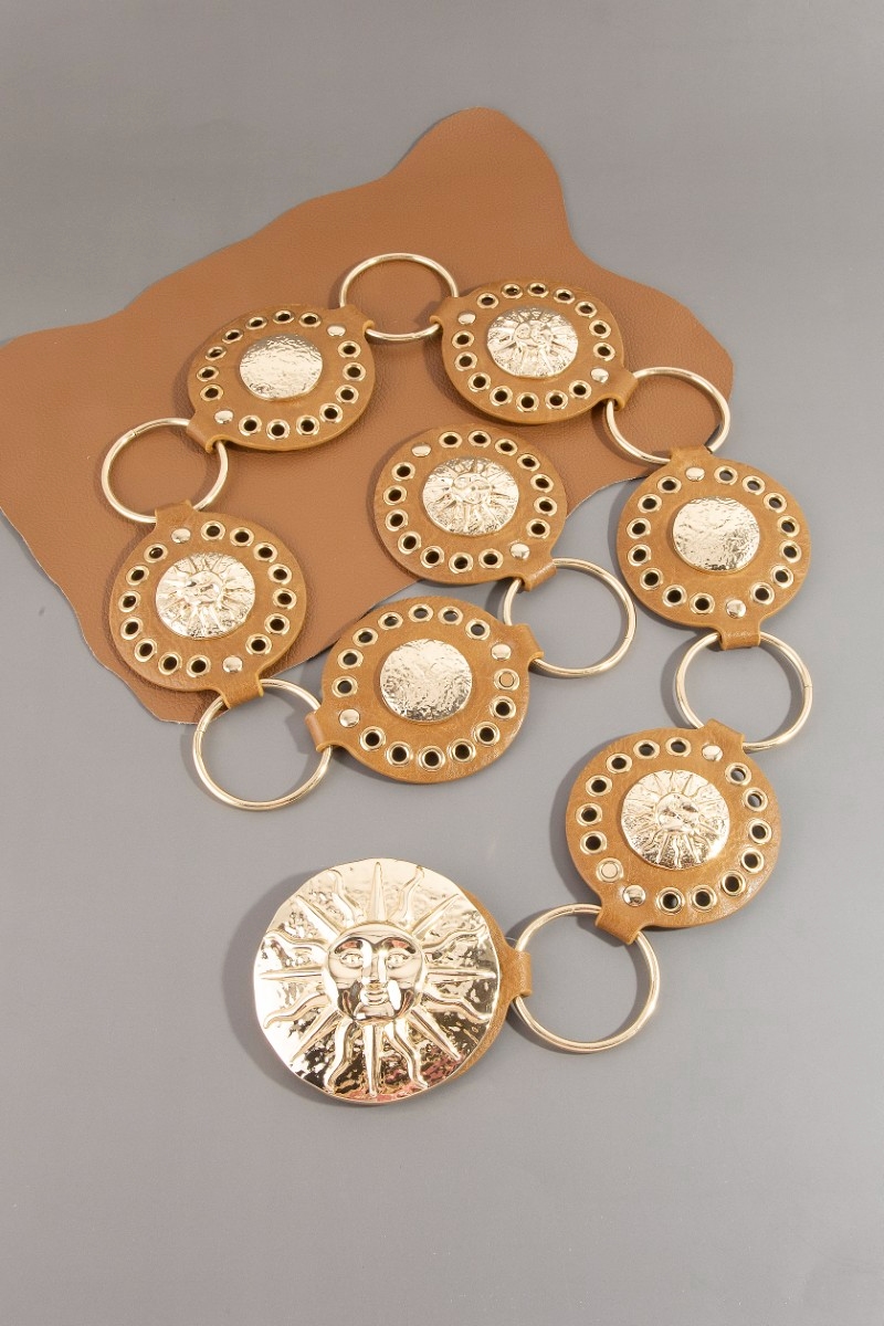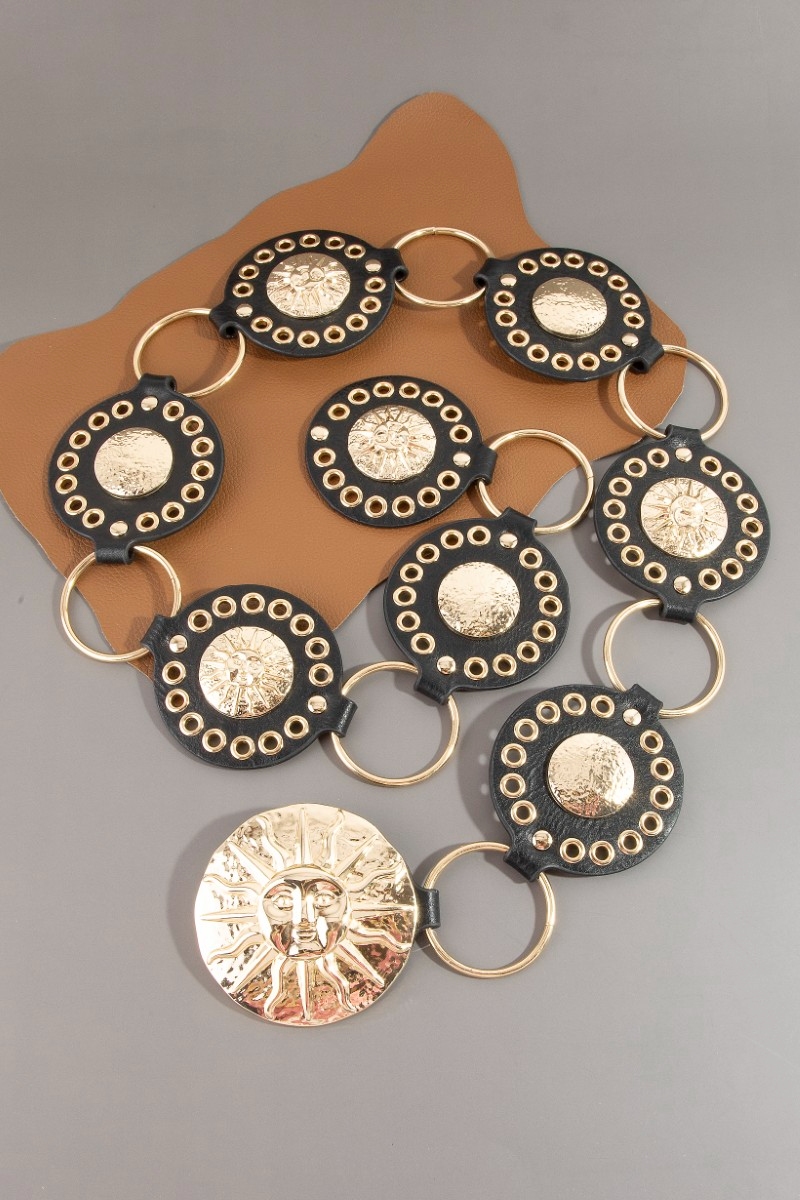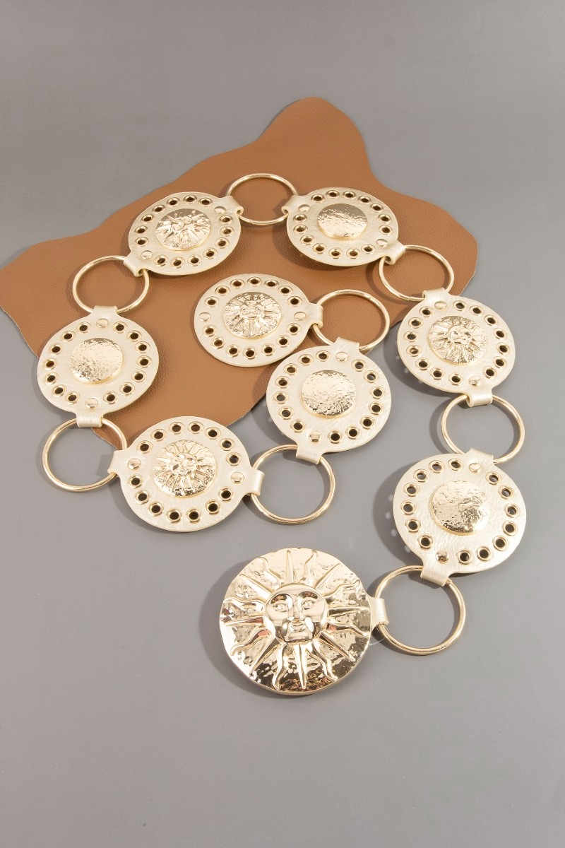 • This chain belt showcases a timeless gold sun concho ring style. Discover the perfect balance of subtlety and flair as this chain belt effortlessly completes your look.