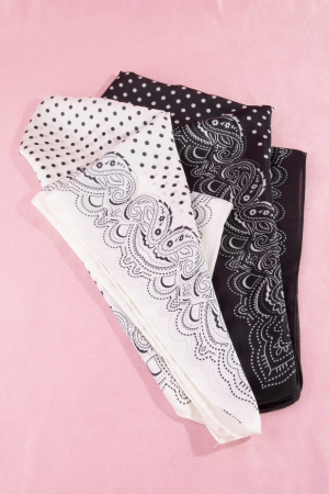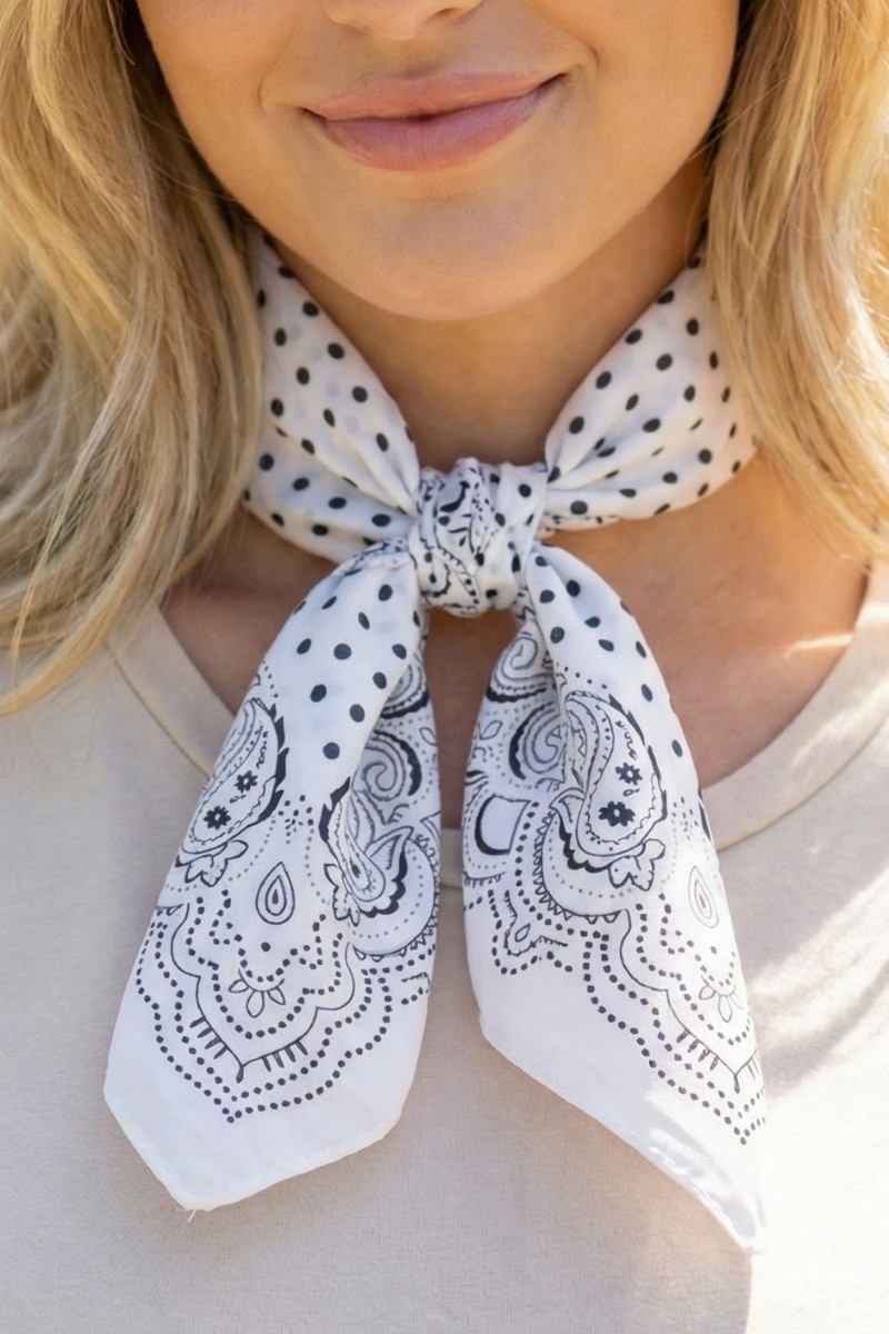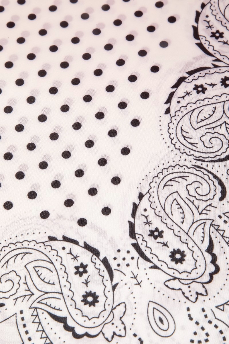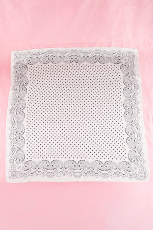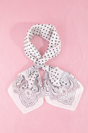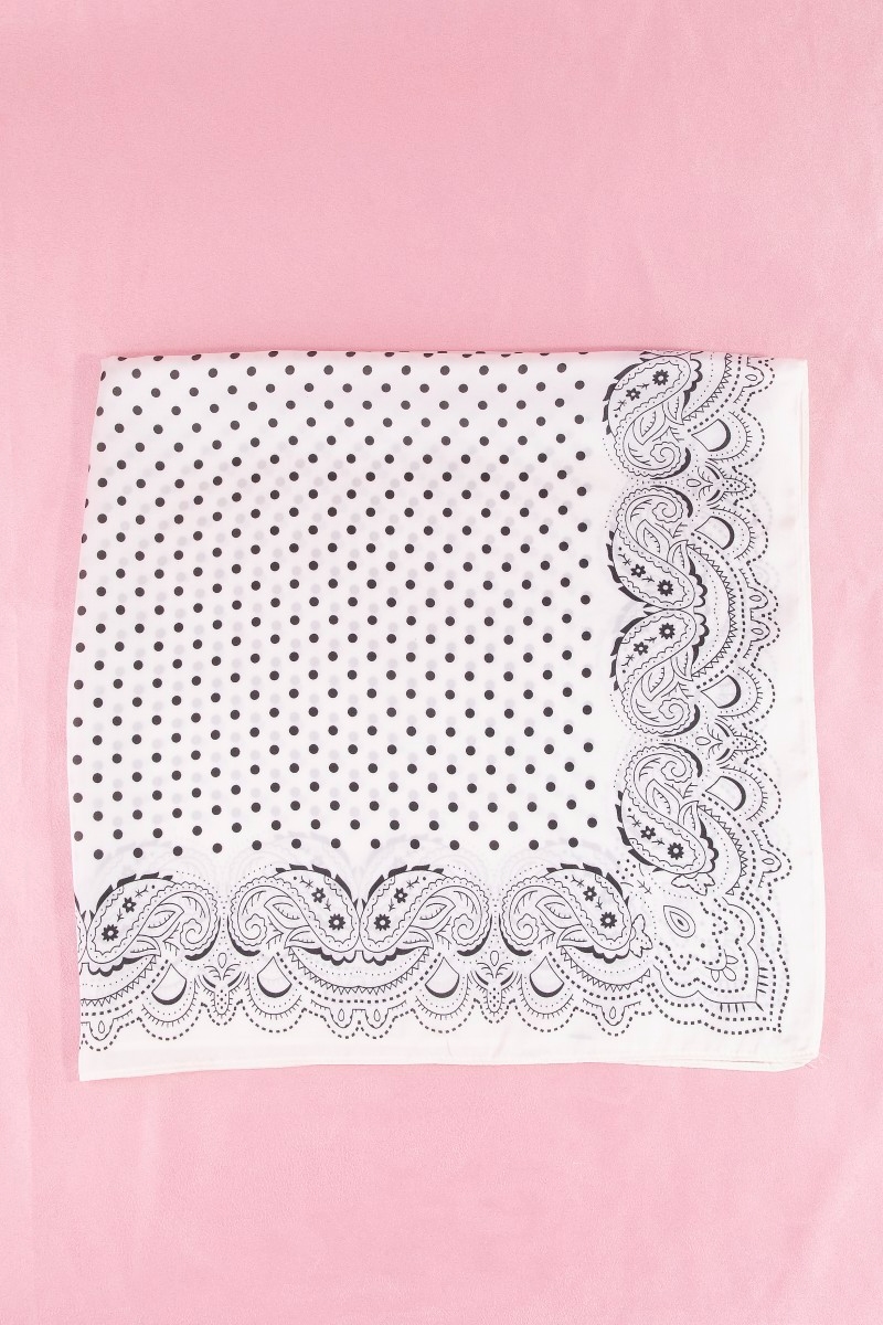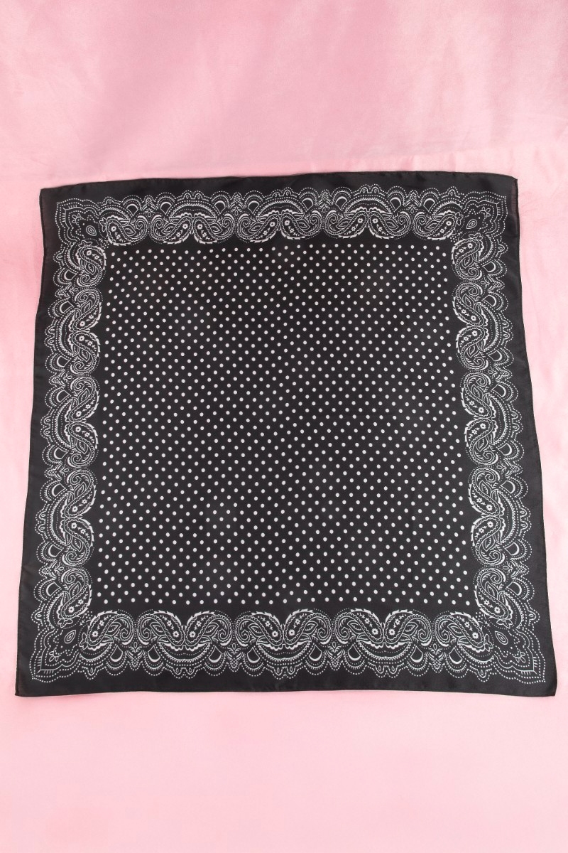- This scarf showcases a unique polka dot & paisley border print satin square style. Discover the perfect balance of subtlety and flair as this scarf effortlessly completes your look.
