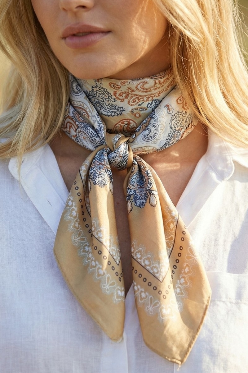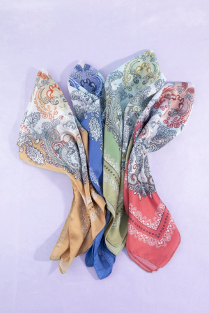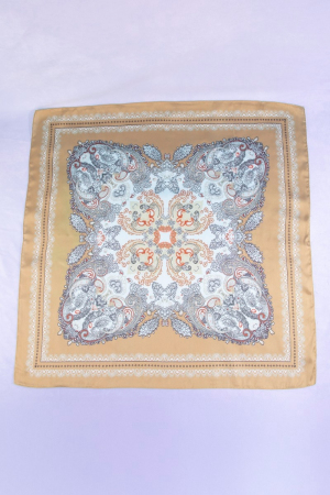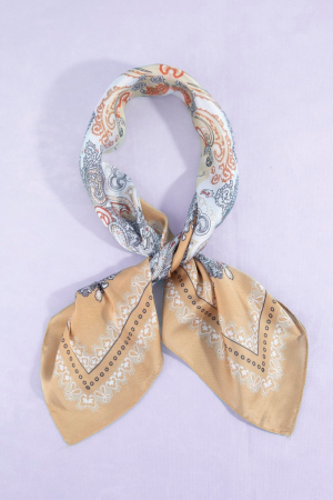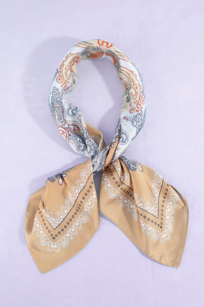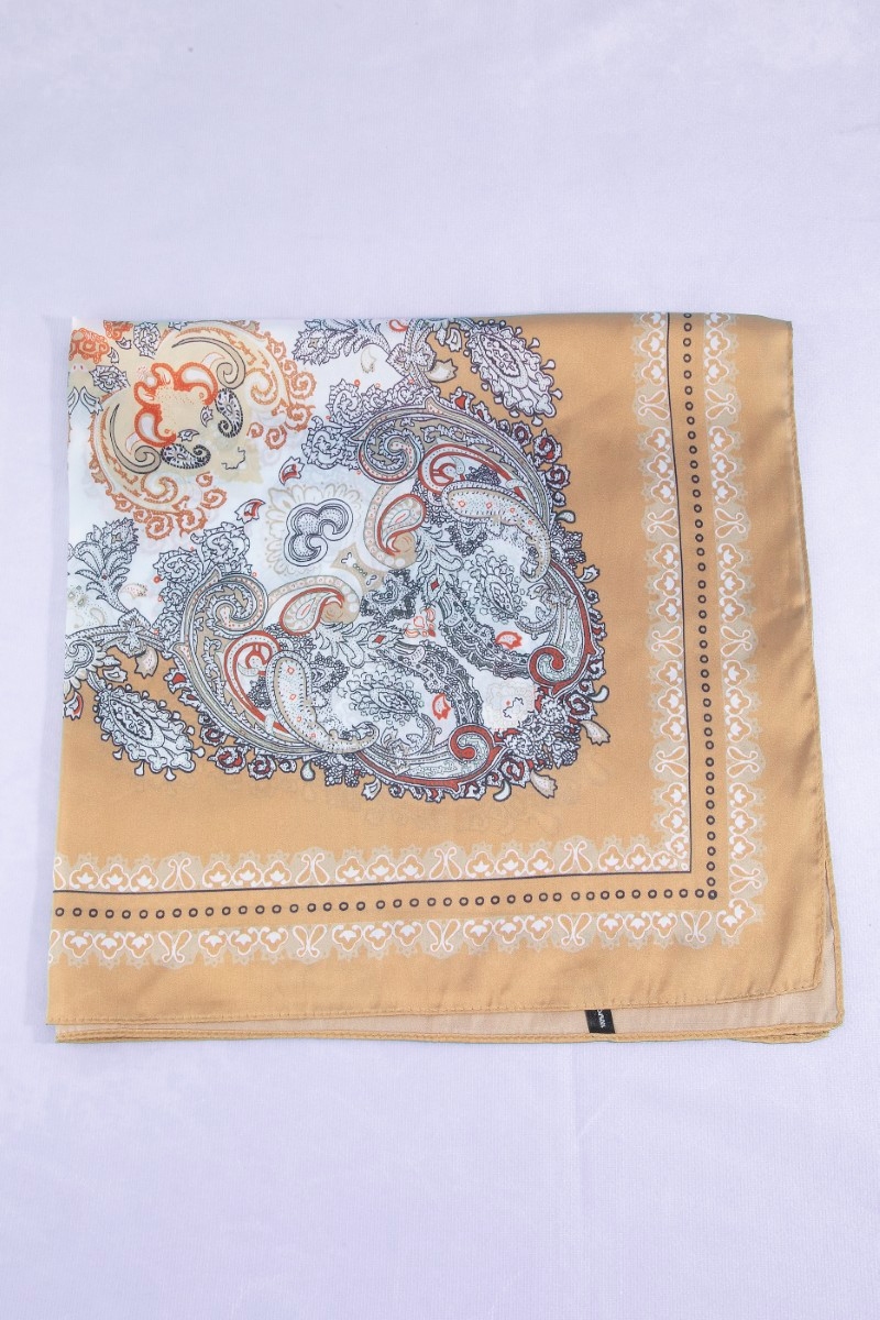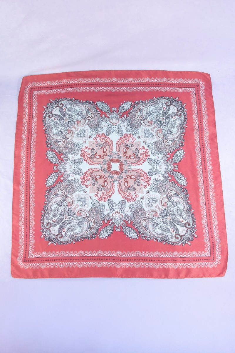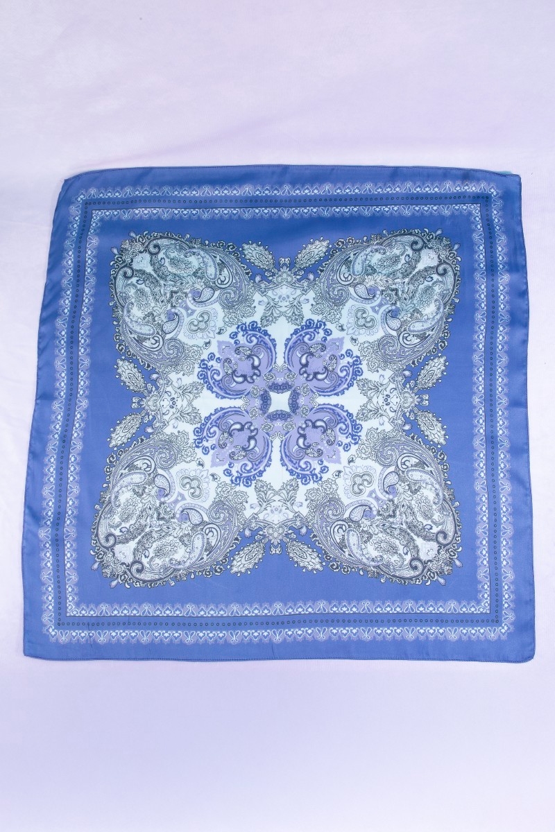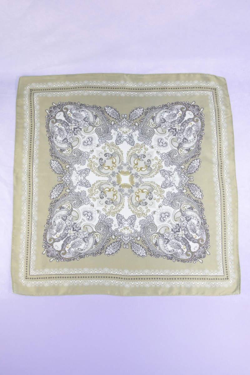 - This scarf features a fashionable ornate paisley medallion print satin square style. Step into a world of refined taste as this scarf effortlessly refines the details of your outfit.