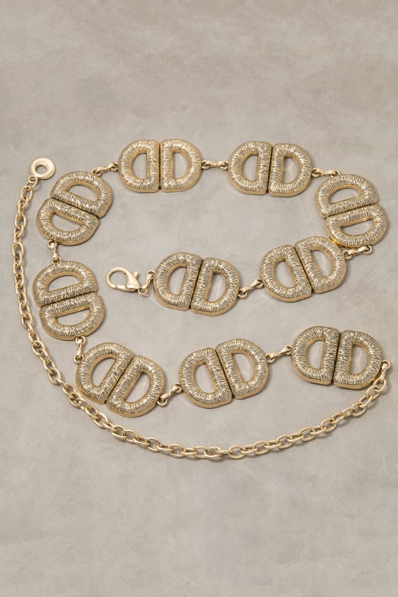 • This chain belt brings a luxurious textured double oval mariner link style. Unveil a new dimension of sophistication as this chain belt effortlessly enhances the elegance of your ensemble.