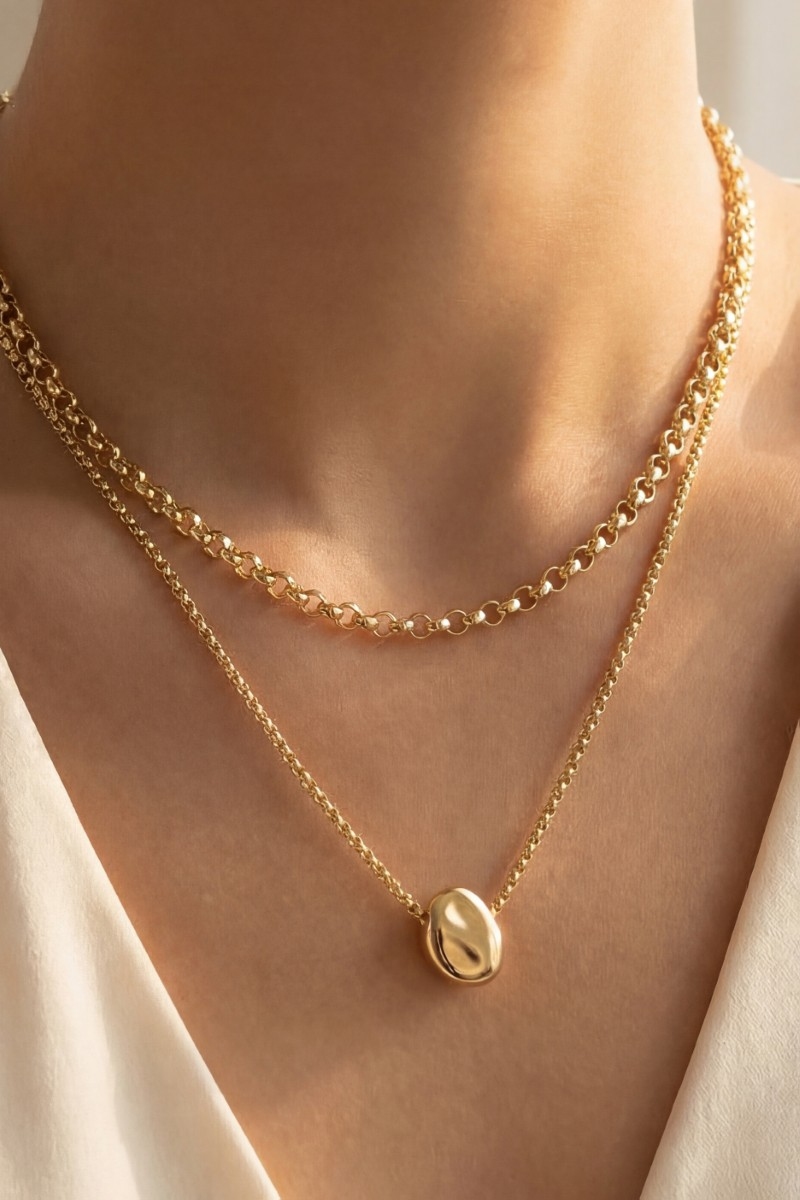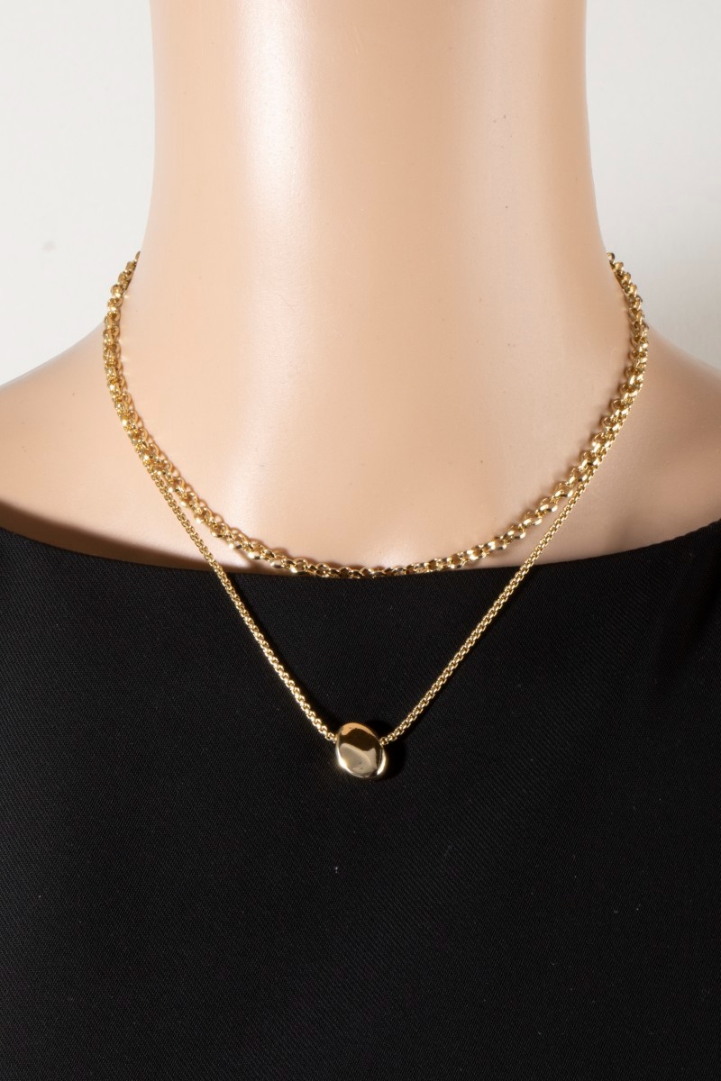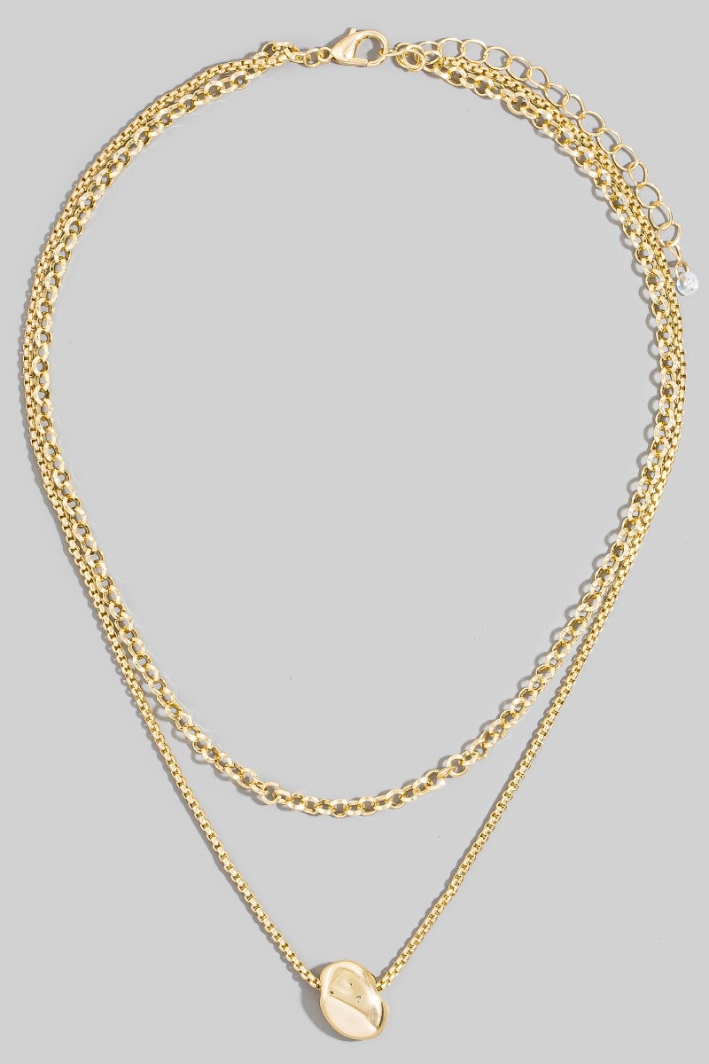 • This pendant necklace showcases a timeless double layer gold coin style. Embark on a journey of sartorial refinement as this pendant necklace effortlessly complements your fashion sense.