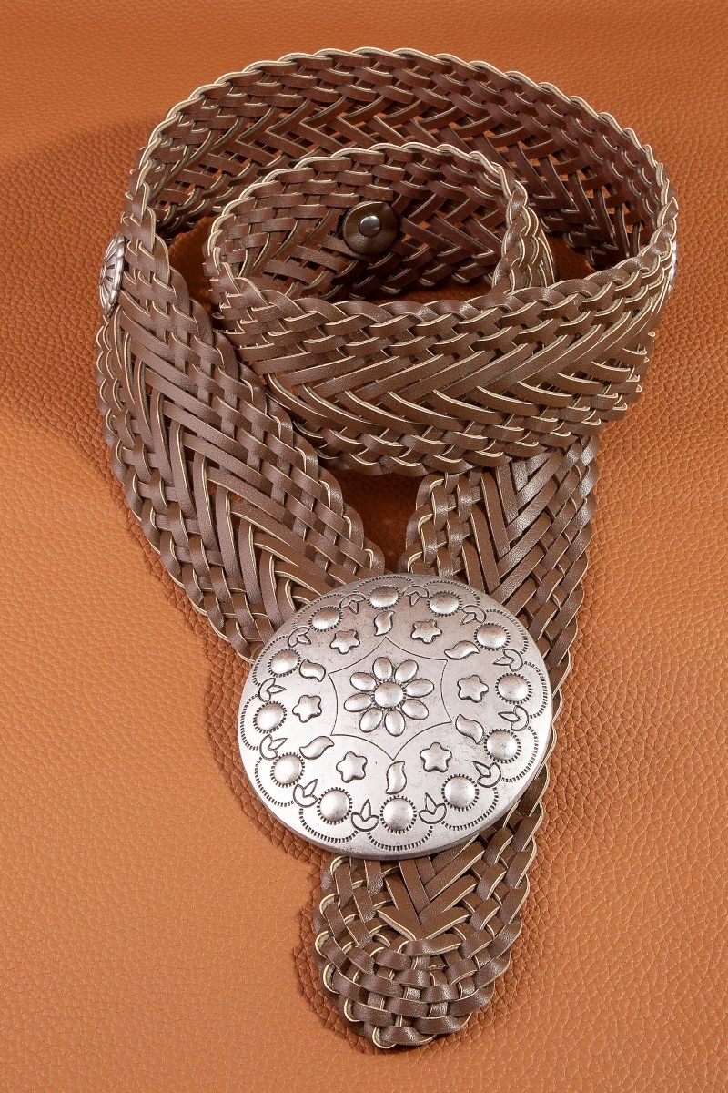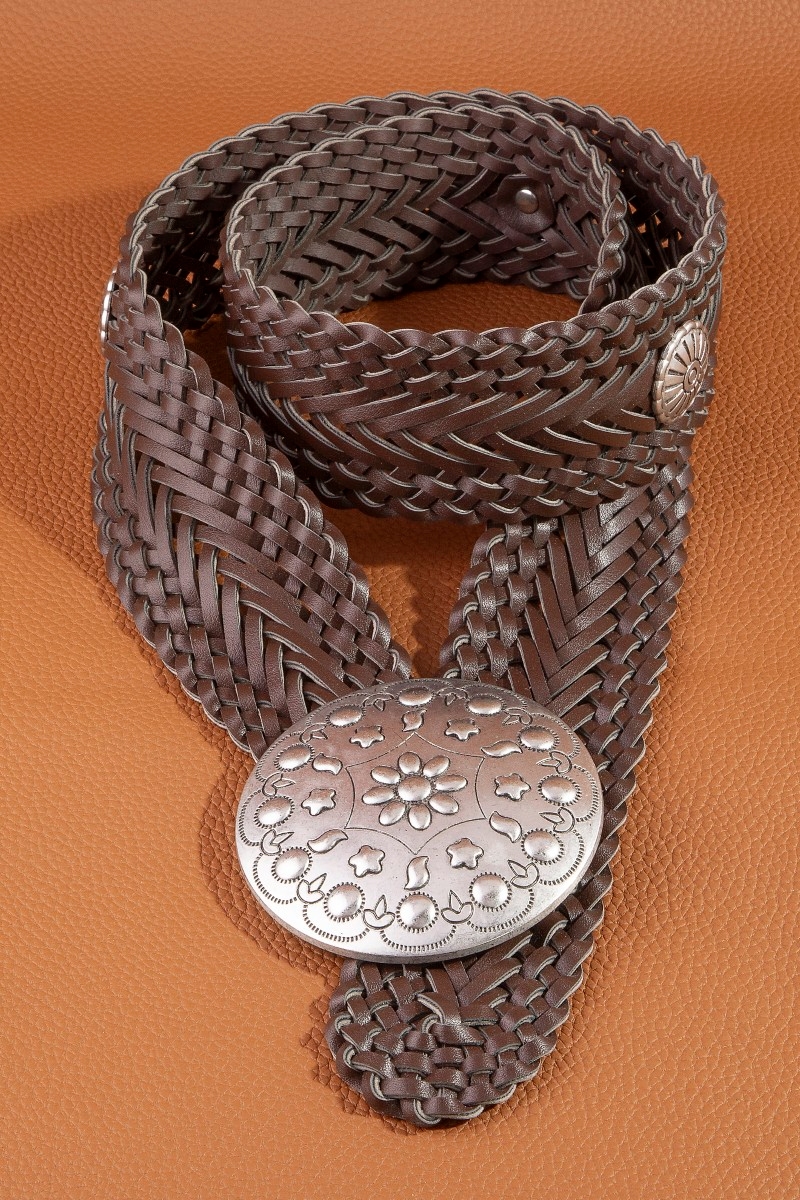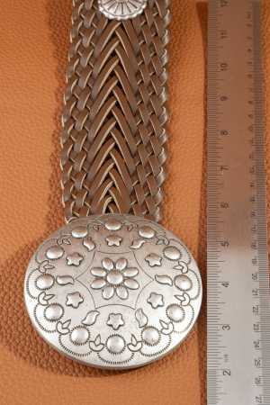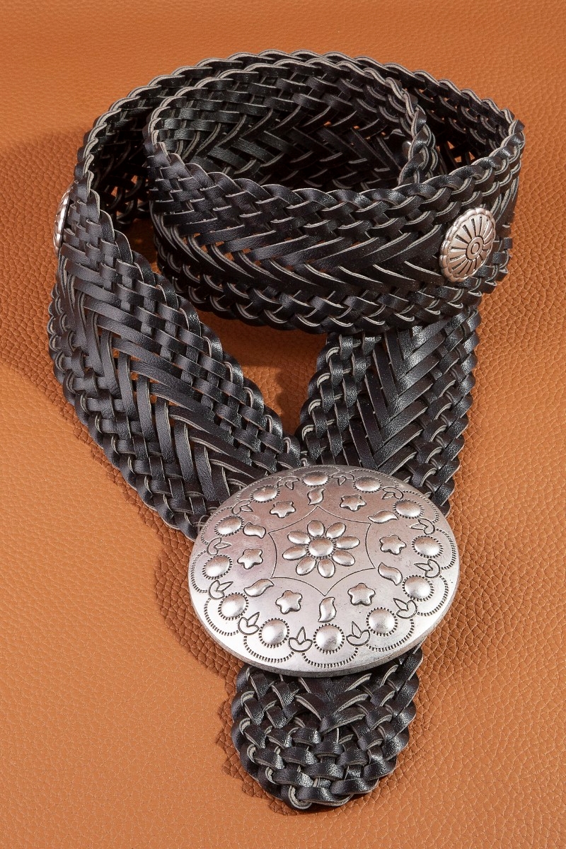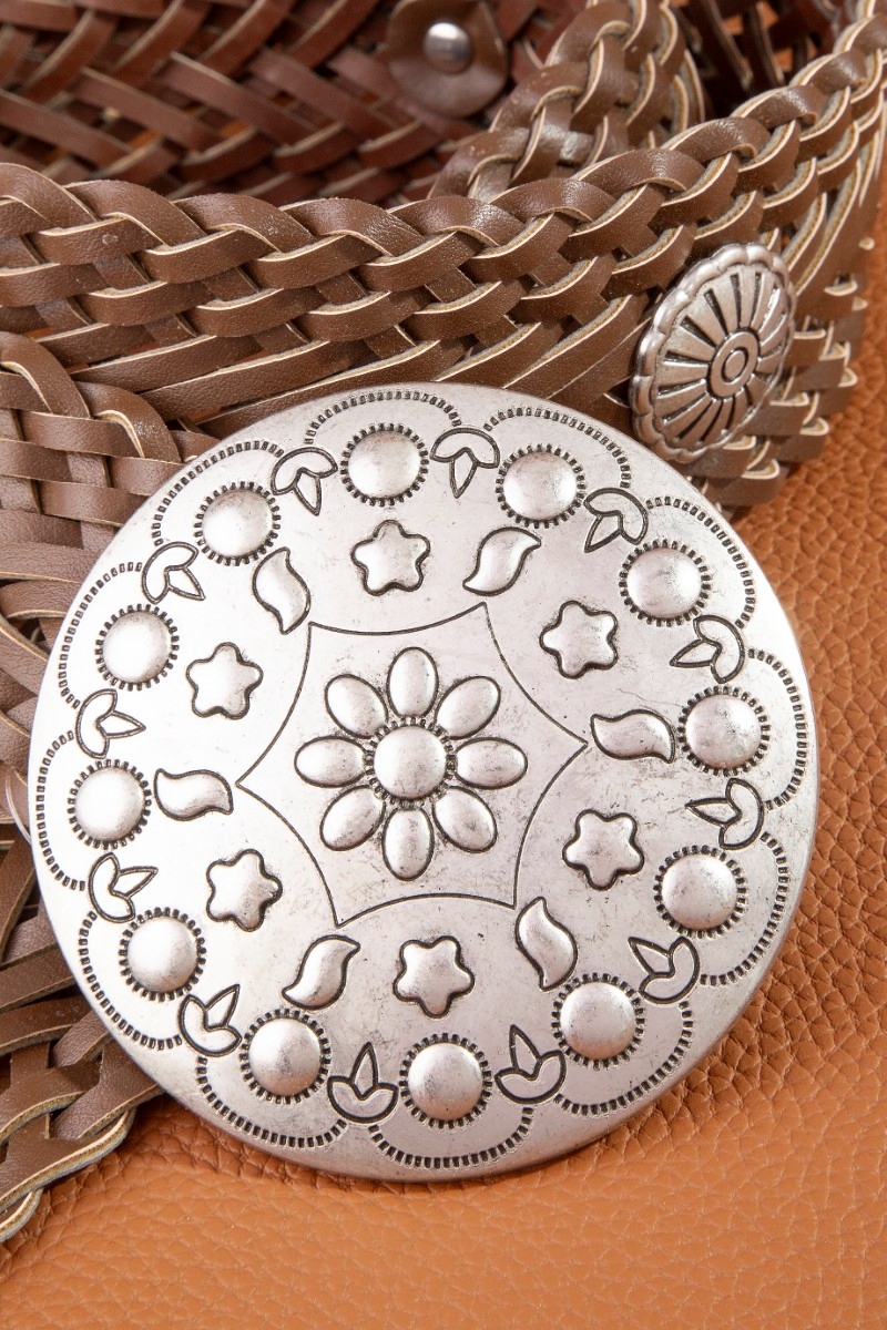 • This belt showcases a unique braided vegan leather floral concho style. Discover the perfect balance of functionality and fashion.