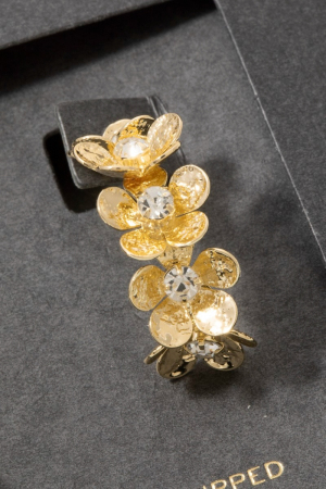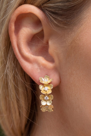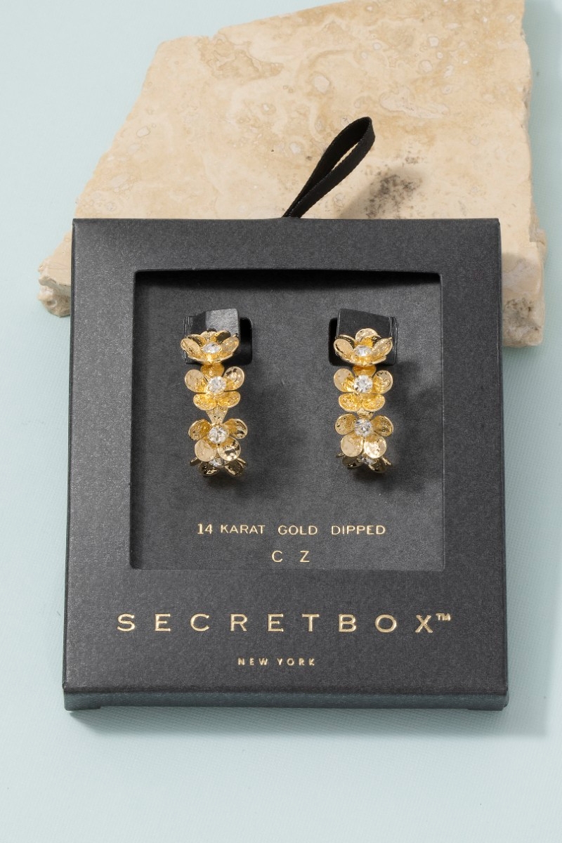 • This pair of hoop earrings brings a luxurious 14k gold dipped cubic zirconia flower cluster style. Experience refined sophistication with this understated yet stylish piece.