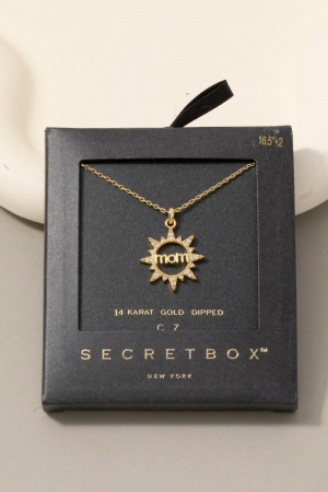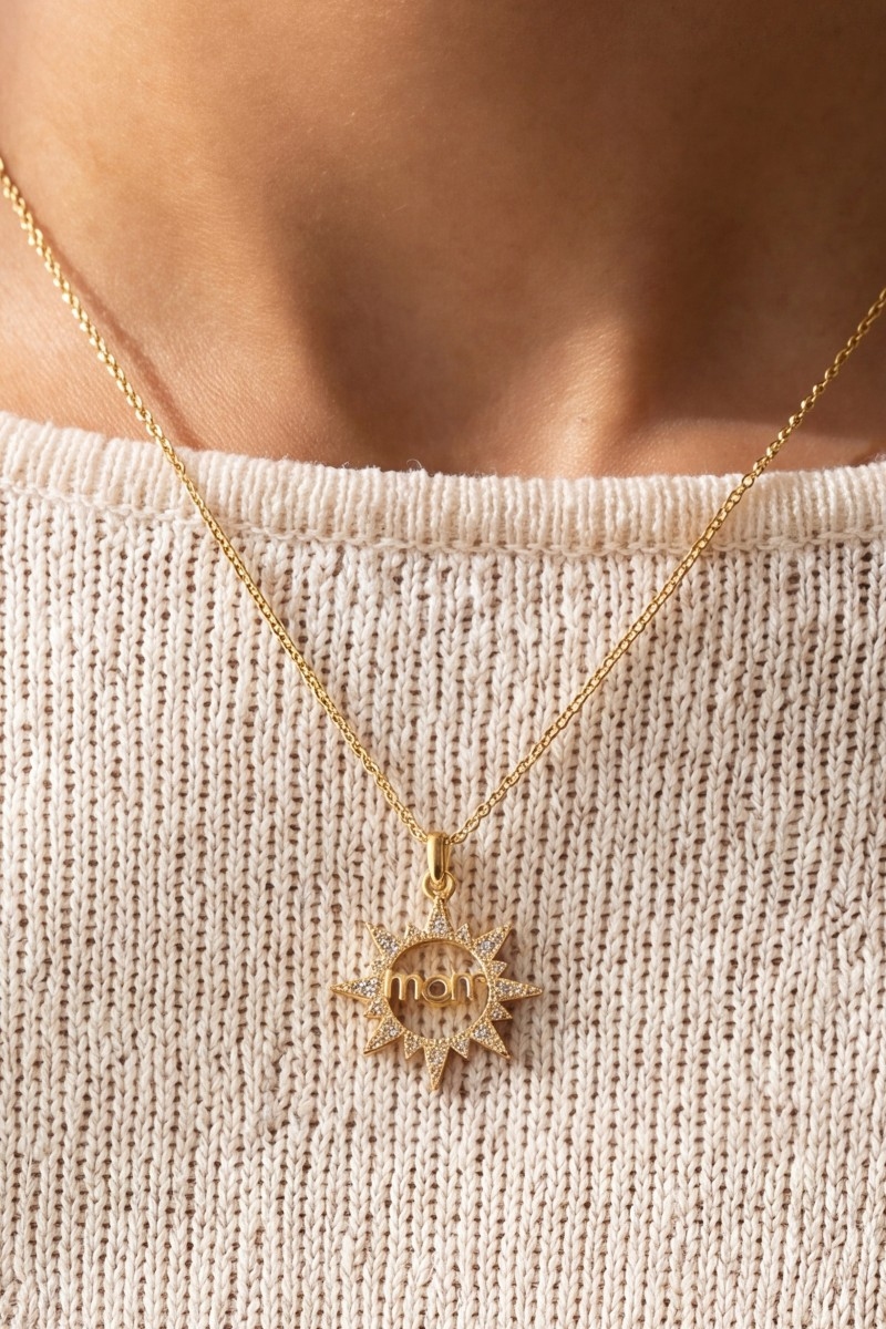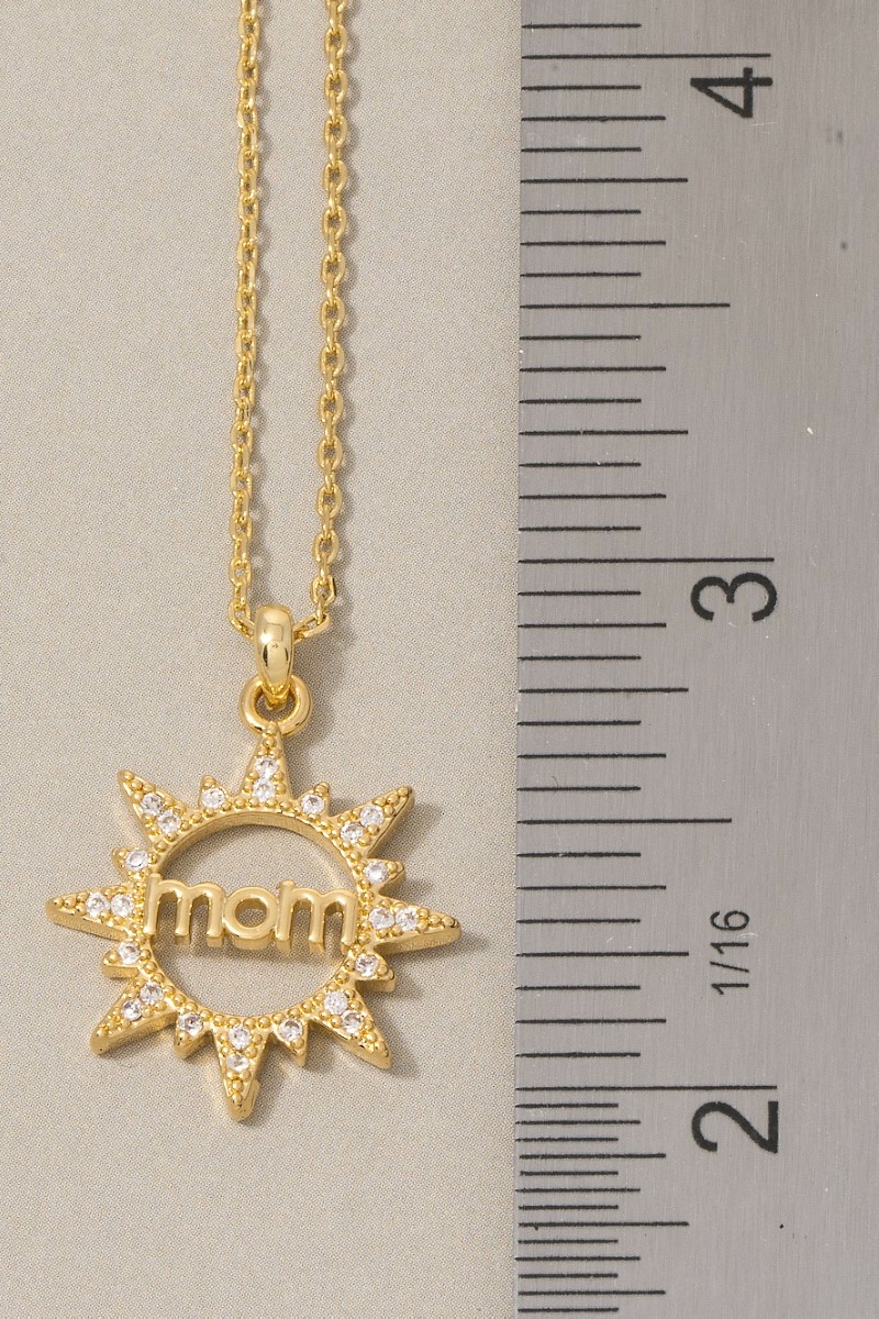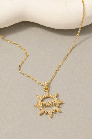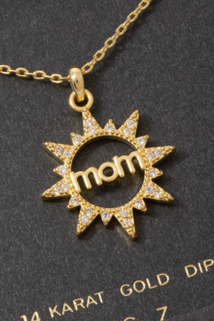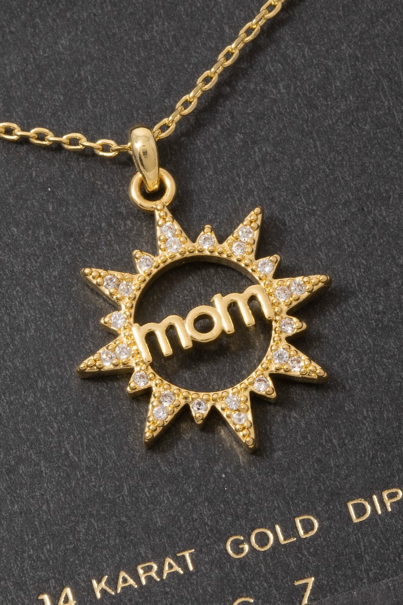 • This necklace brings a luxurious 14k gold dipped cubic zirconia mom sunburst style. Indulge in the artistry of accessorizing with this unique piece.
