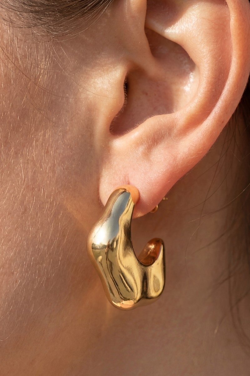 • This pair of hoop earrings displays a fashionable gold hammered abstract chunky style. Embark on a journey of sartorial refinement as this pair of hoop earrings effortlessly complements your fashion sense.