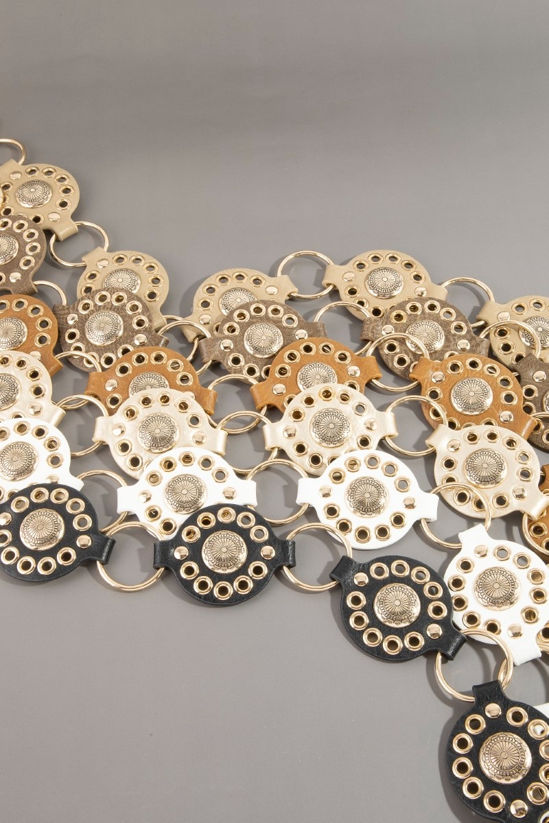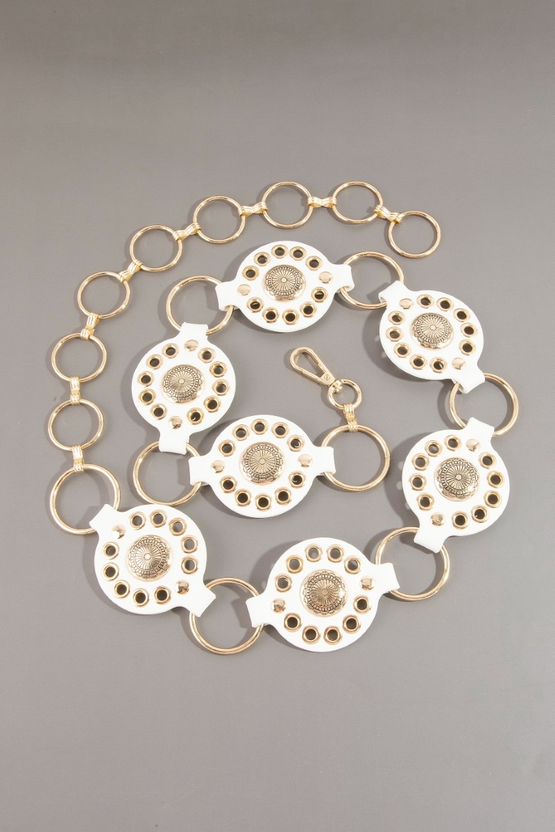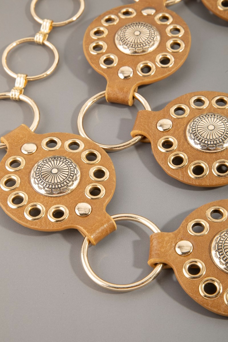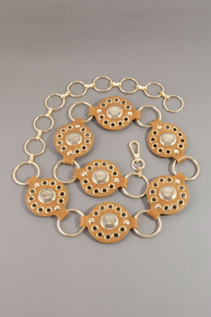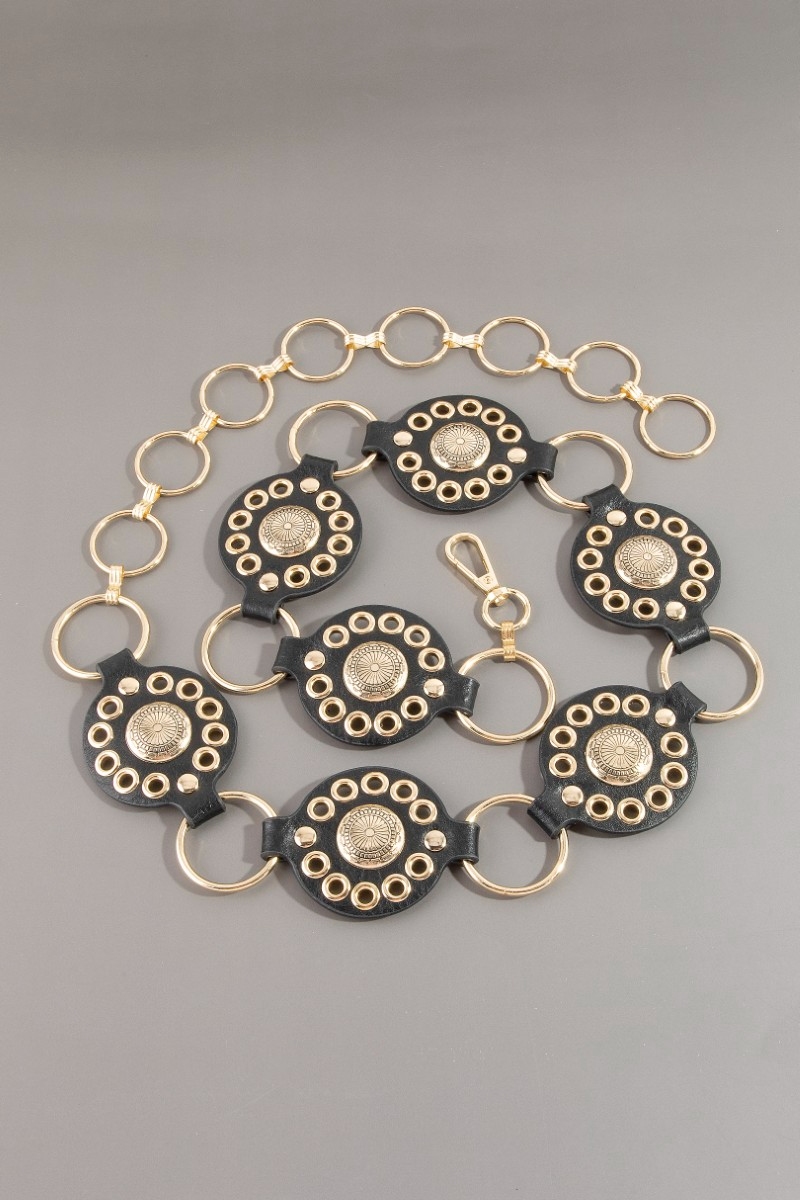 • This chain belt introduces a unique gold concho ring leather style. Discover the perfect balance of functionality and fashion.