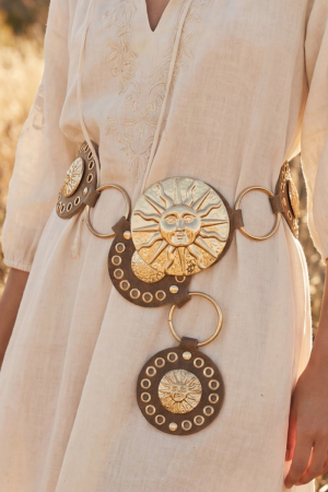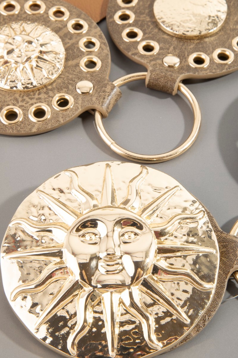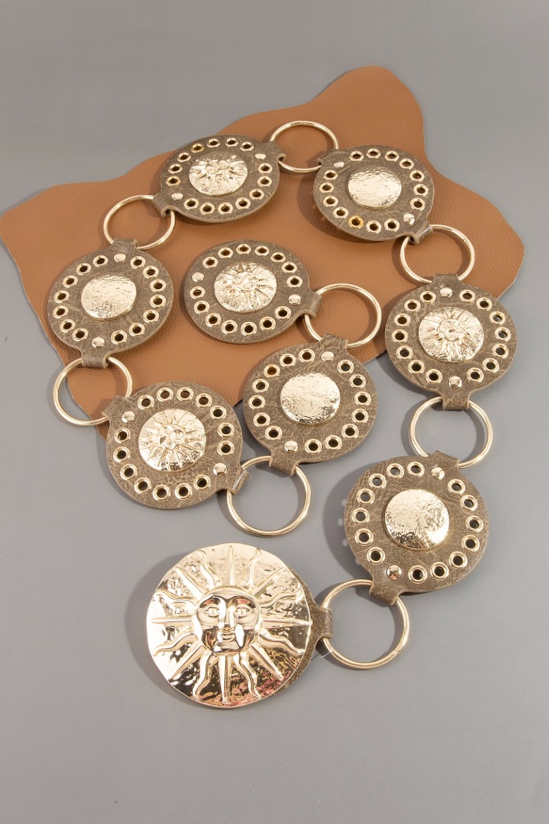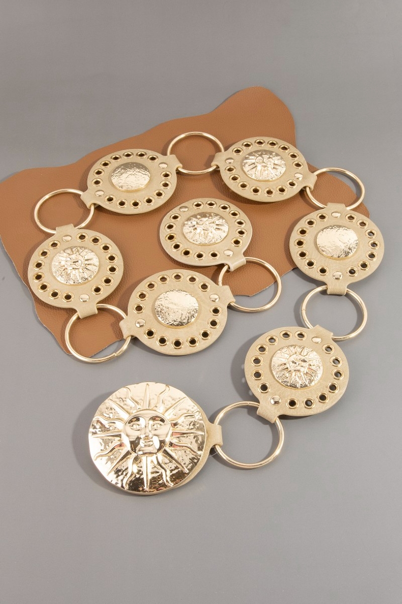 • This chain belt showcases a timeless gold sun concho ring style. Discover the perfect balance of subtlety and flair as this chain belt effortlessly completes your look.