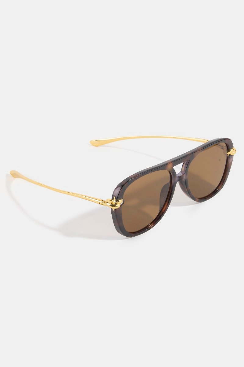 - This set of sunglasses showcases a unique gold knot hardware oversized aviator sunglasses style. Celebrate the art of accessorizing with this piece that effortlessly encapsulates modern trends.