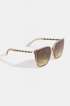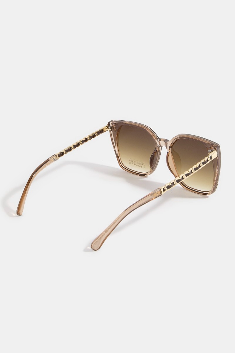 - This set of sunglasses showcases a unique wide square cat eye gold chain bar sunglasses style. Celebrate individual style with this versatile, eye-catching addition.