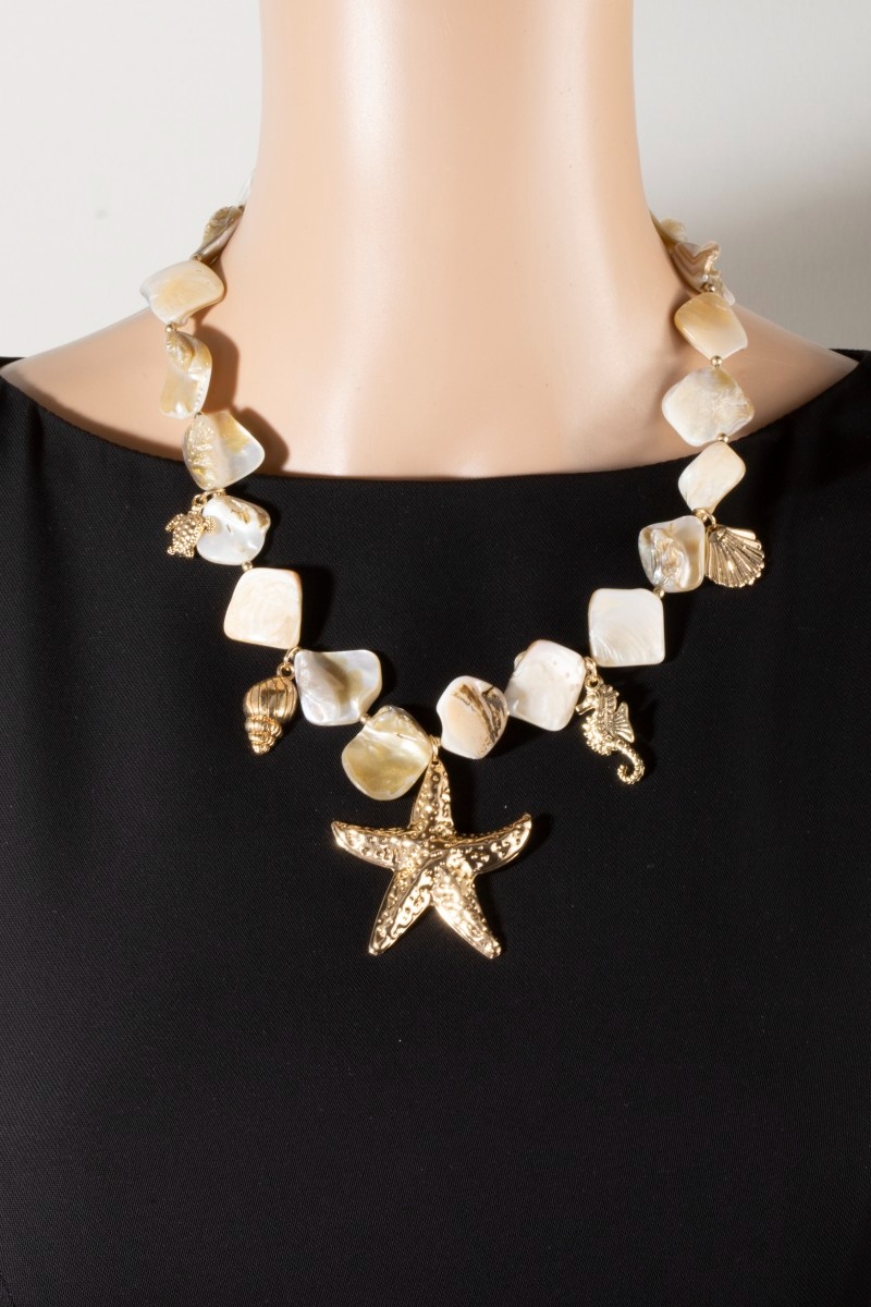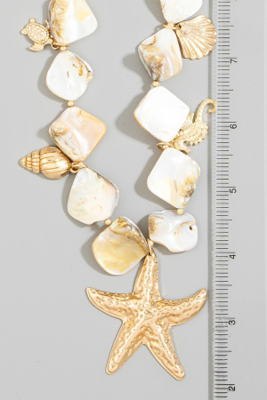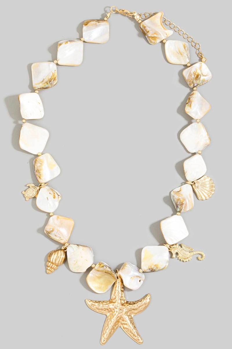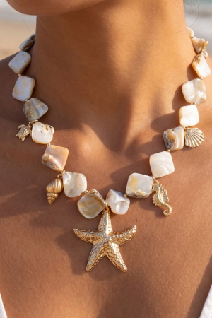 • This necklace introduces a unique gold starfish & coastal charms shell stone style. Step into a world of refined taste as this necklace effortlessly refines the details of your outfit.