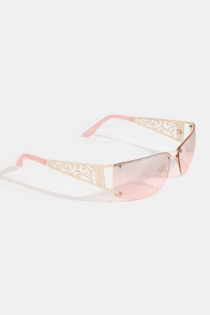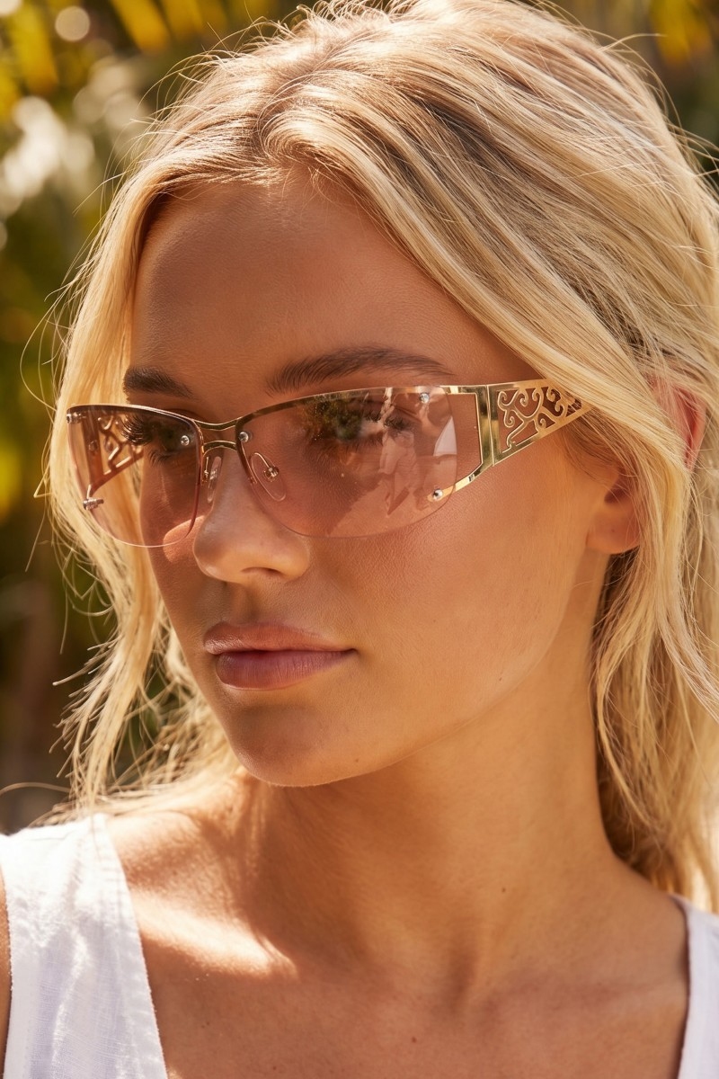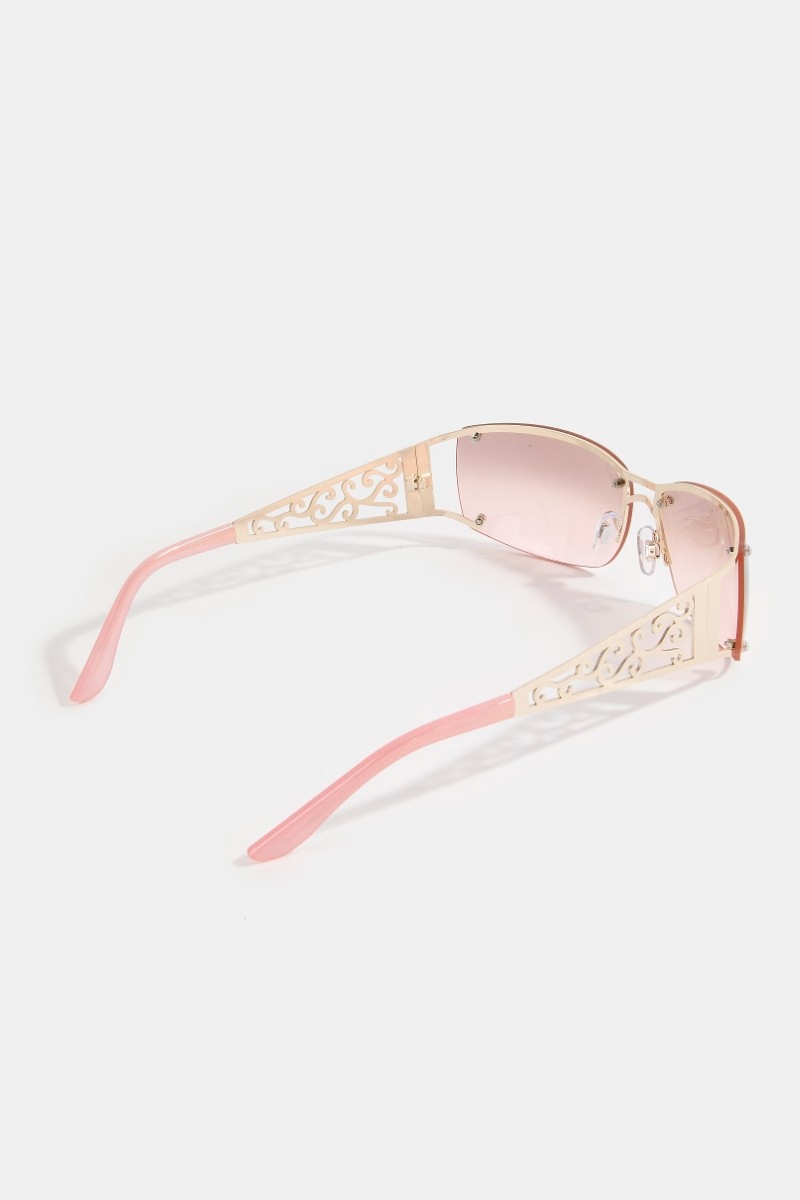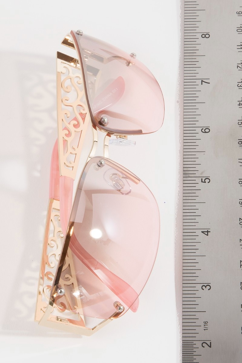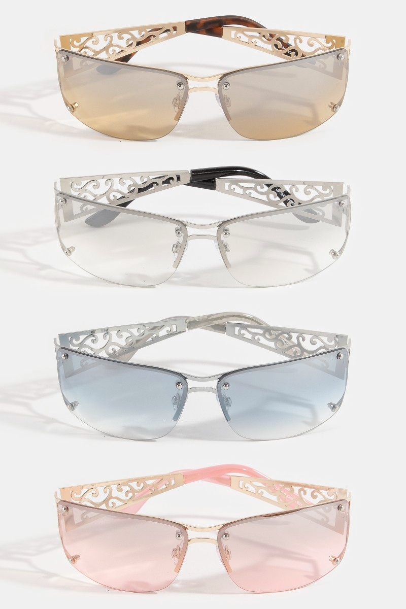 - This set of sunglasses introduces a stunning filigree scrollwork frame shield sunglasses style. Unveil modern elegance with this subtly intricate set of sunglasses.