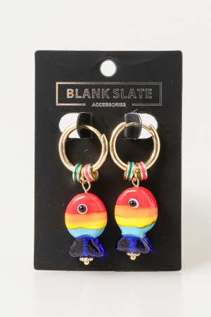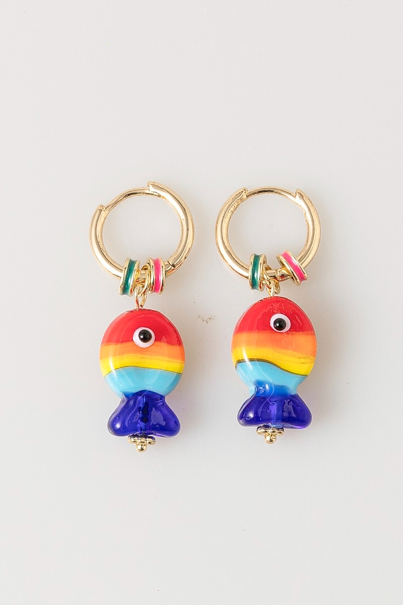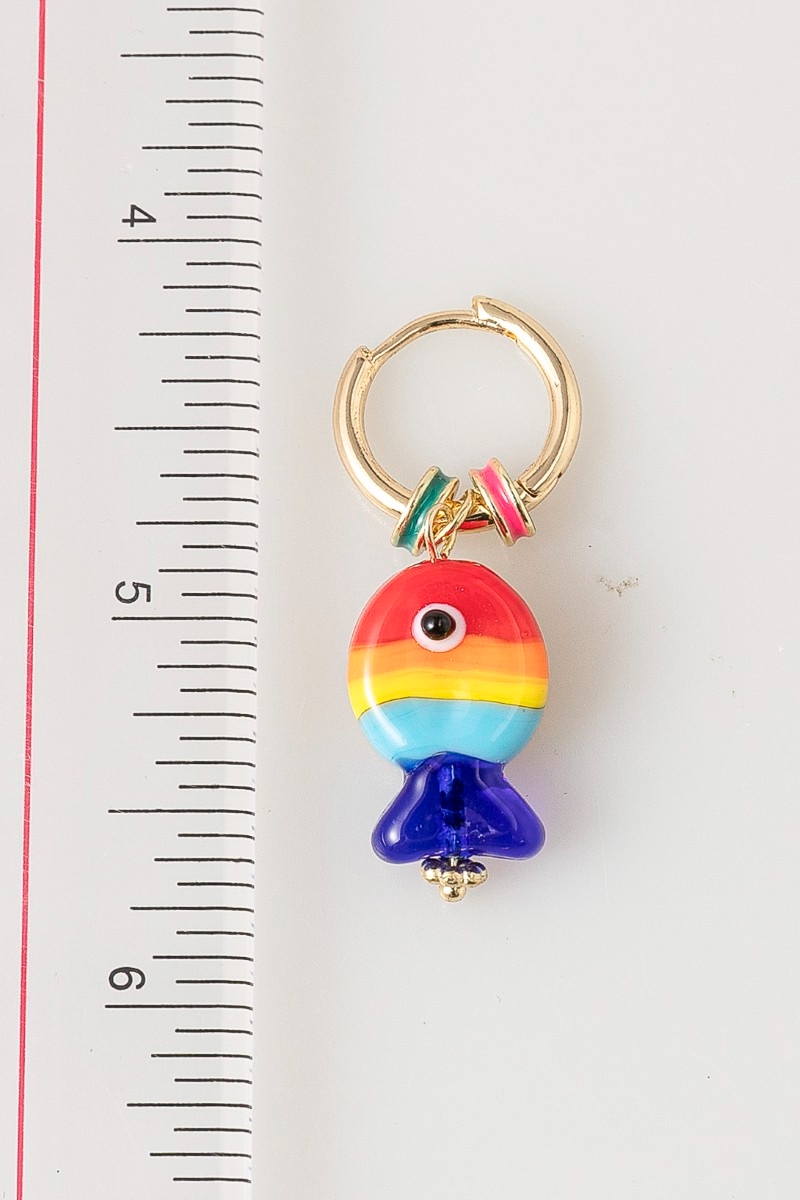 - This pair of hoop earrings showcases a unique rainbow fish and ring charms style. Elevate your ensemble with this chic, timeless pair of hoop earrings.