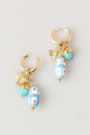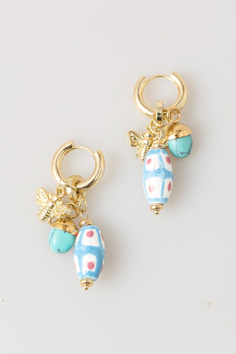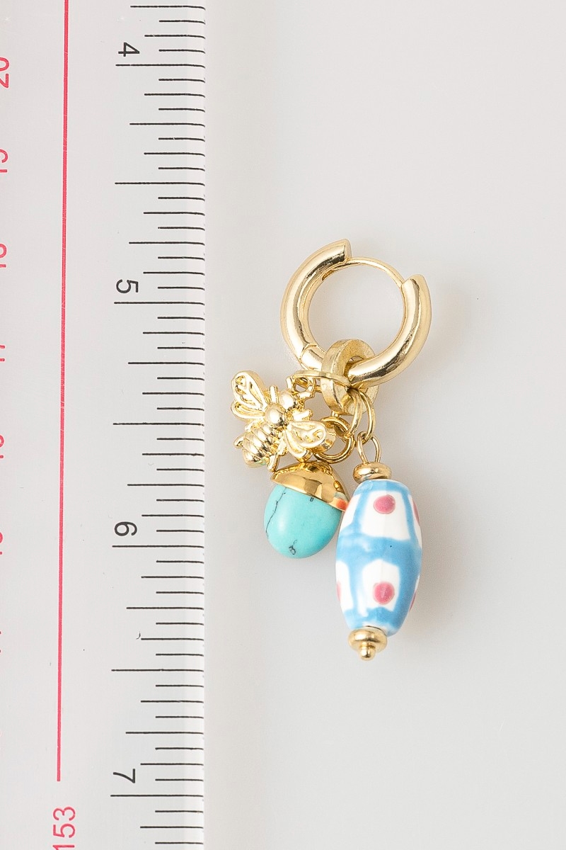 - This pair of hoop earrings introduces a stunning bee and turquoise stone charm style. Experience the joy of accessorizing with this piece that effortlessly combines versatility and charm.