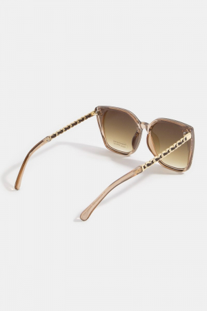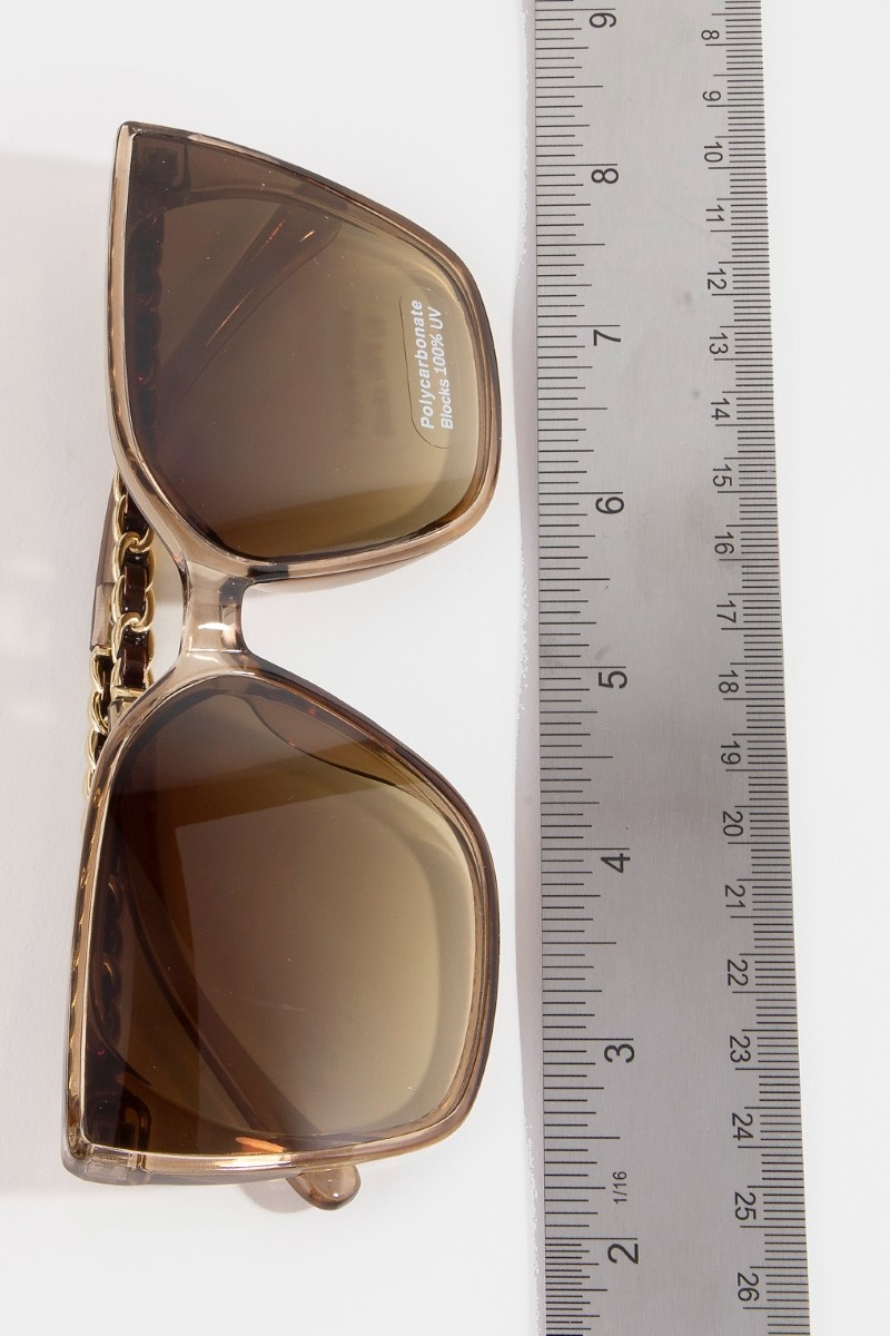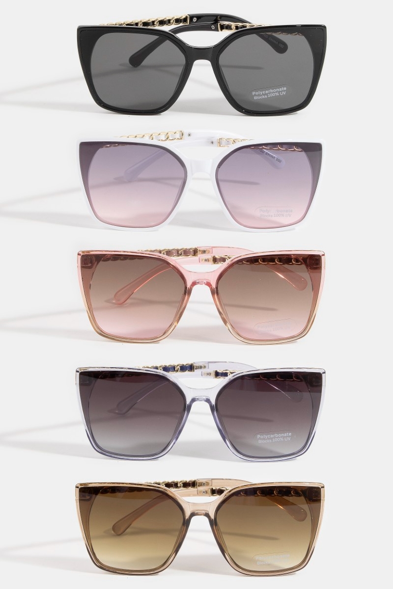 - This set of sunglasses showcases a unique wide square cat eye gold chain bar sunglasses style. Celebrate individual style with this versatile, eye-catching addition.
