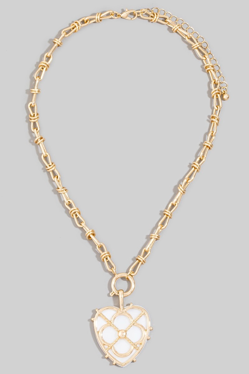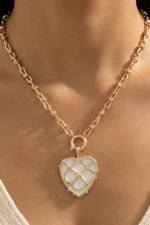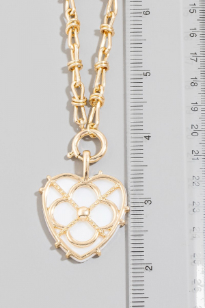 • This pendant necklace adds a modern mother of pearl heart clover style. Indulge in the artistry of accessorizing with this unique piece.