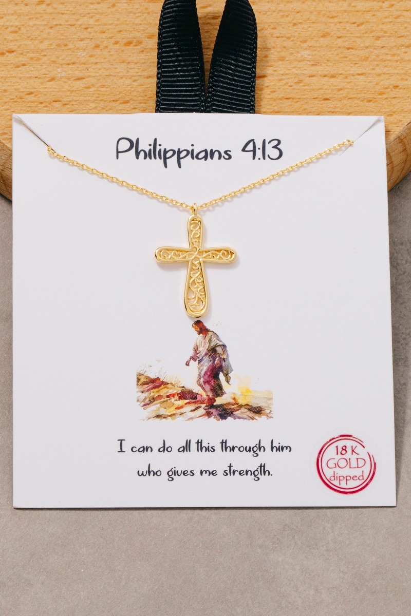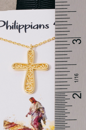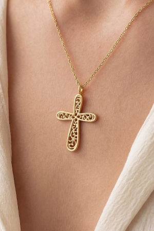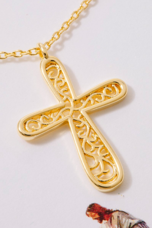 • This pendant necklace introduces a unique gold dipped filigree cross style. Celebrate the art of accessorizing with this piece that effortlessly encapsulates modern trends.