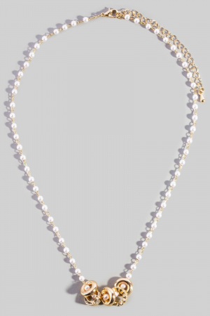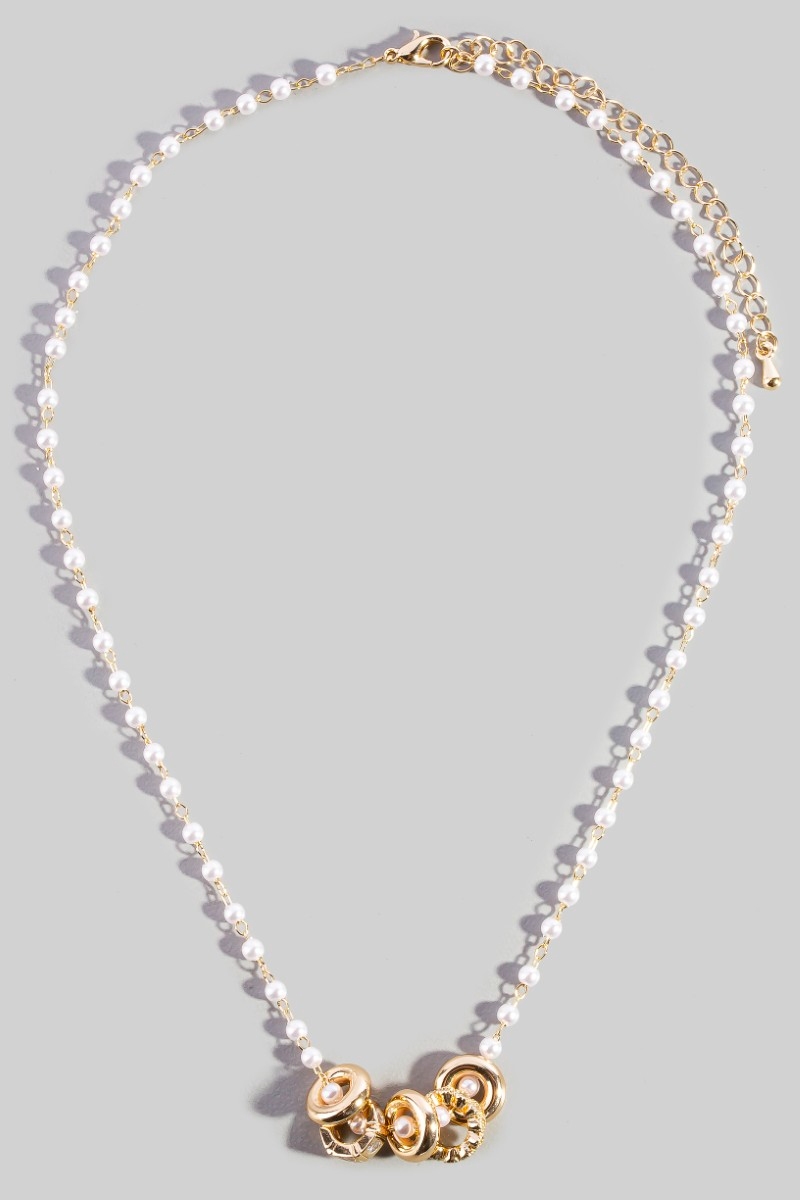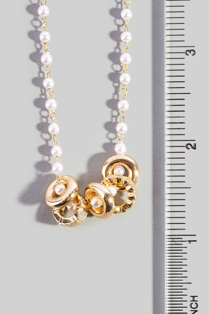 • This necklace showcases a unique pearl chain ring cluster charm style. Celebrate the art of accessorizing with this piece that effortlessly encapsulates modern trends.