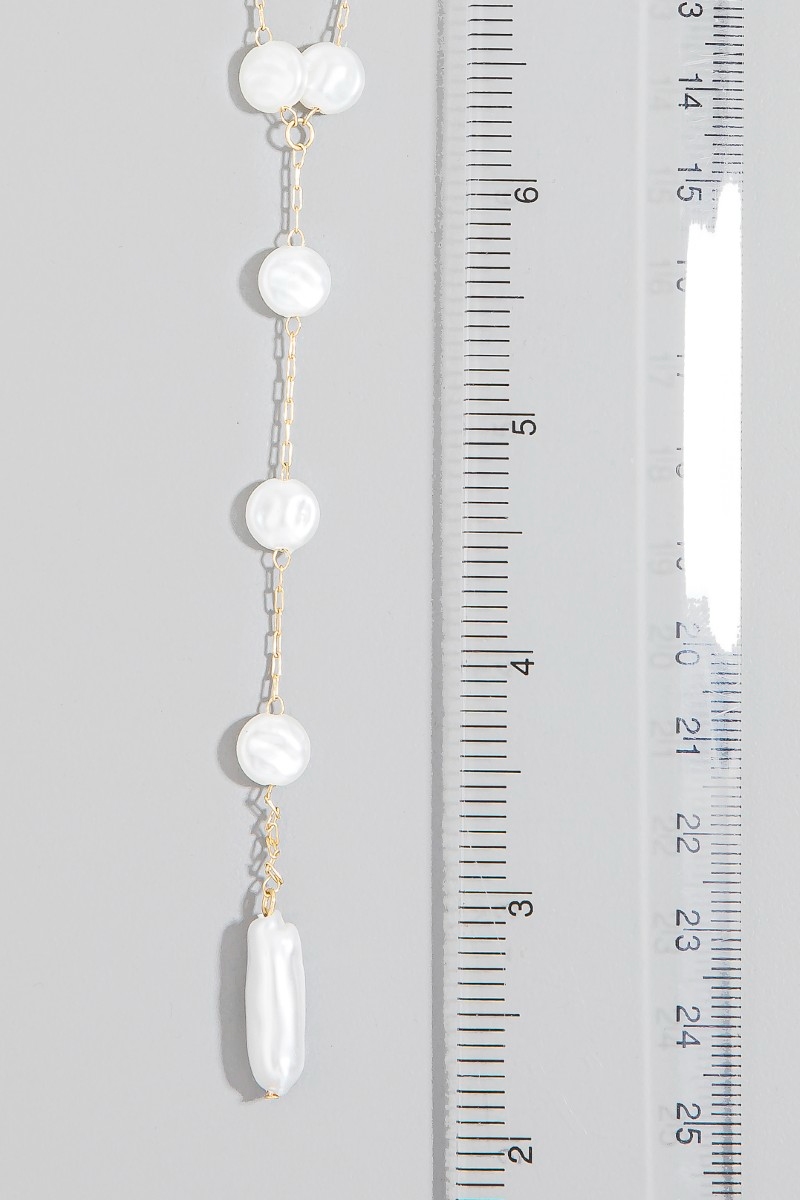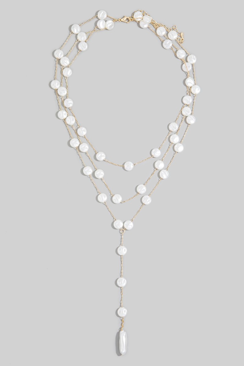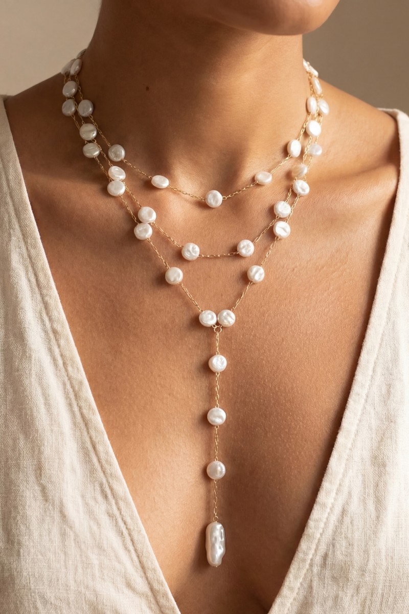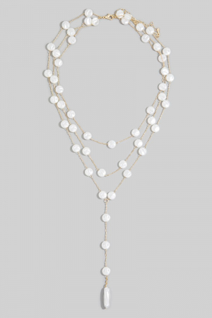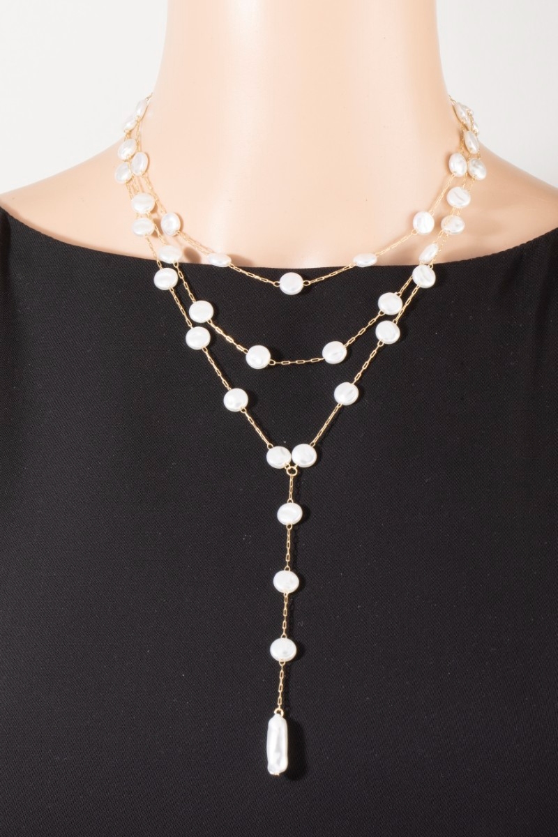 • This introduces a stunning triple layer coin pearl lariat necklace style. Immerse yourself in the world of understated glamour as this effortlessly exudes timeless appeal.