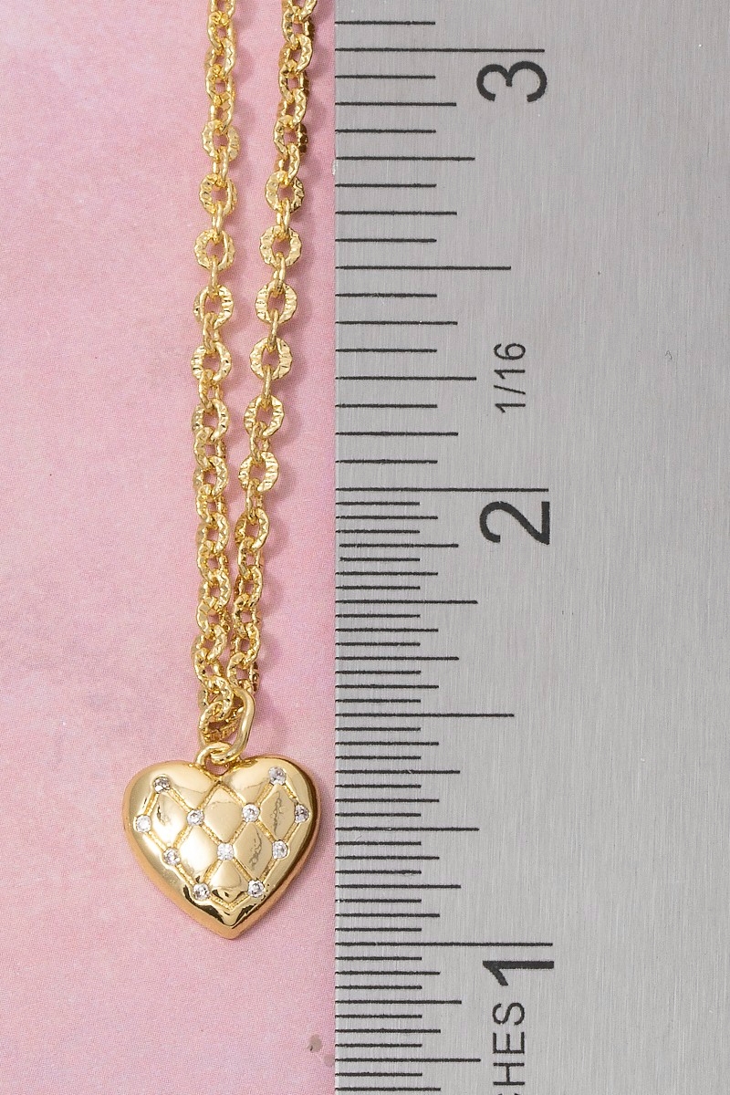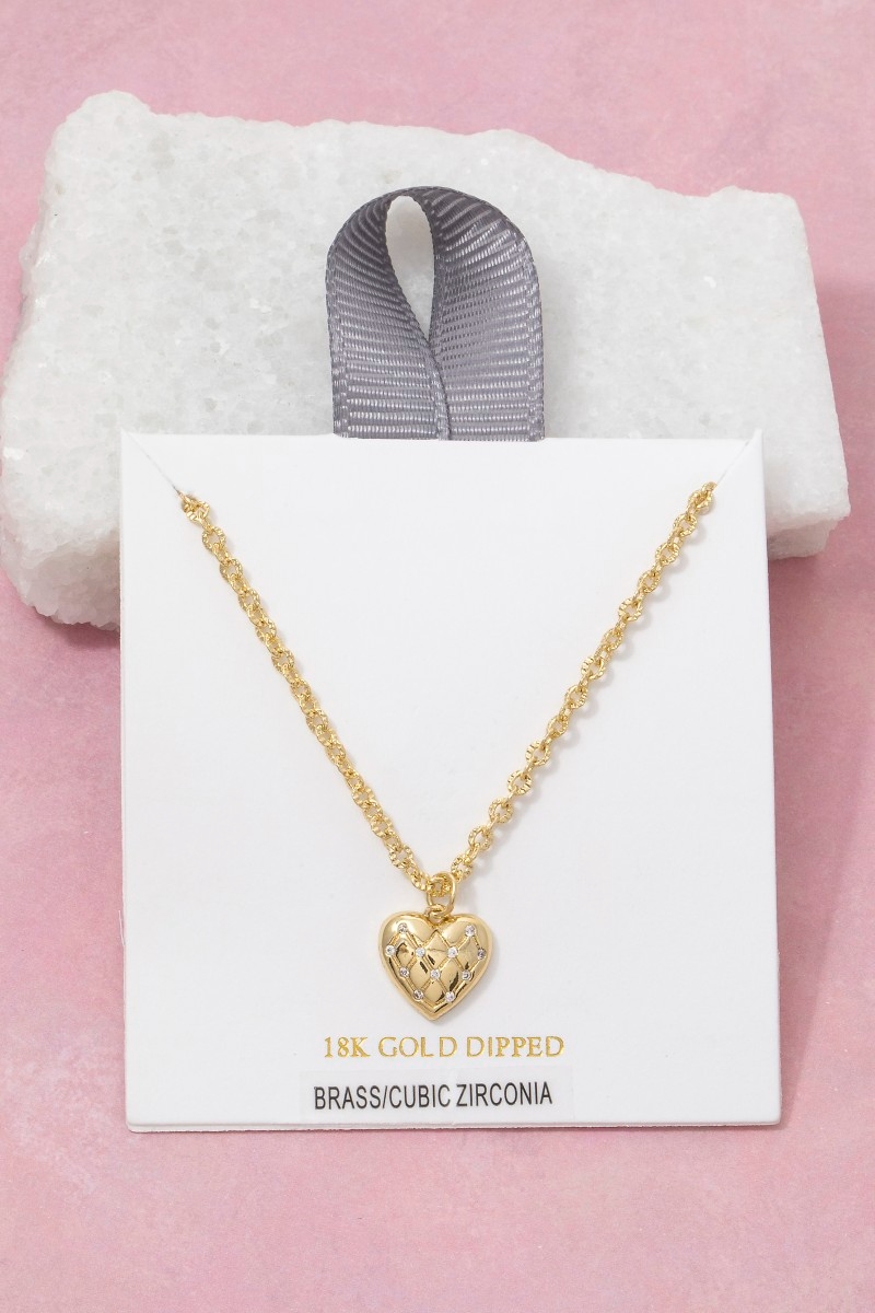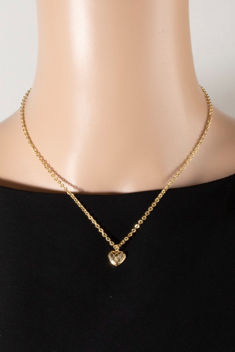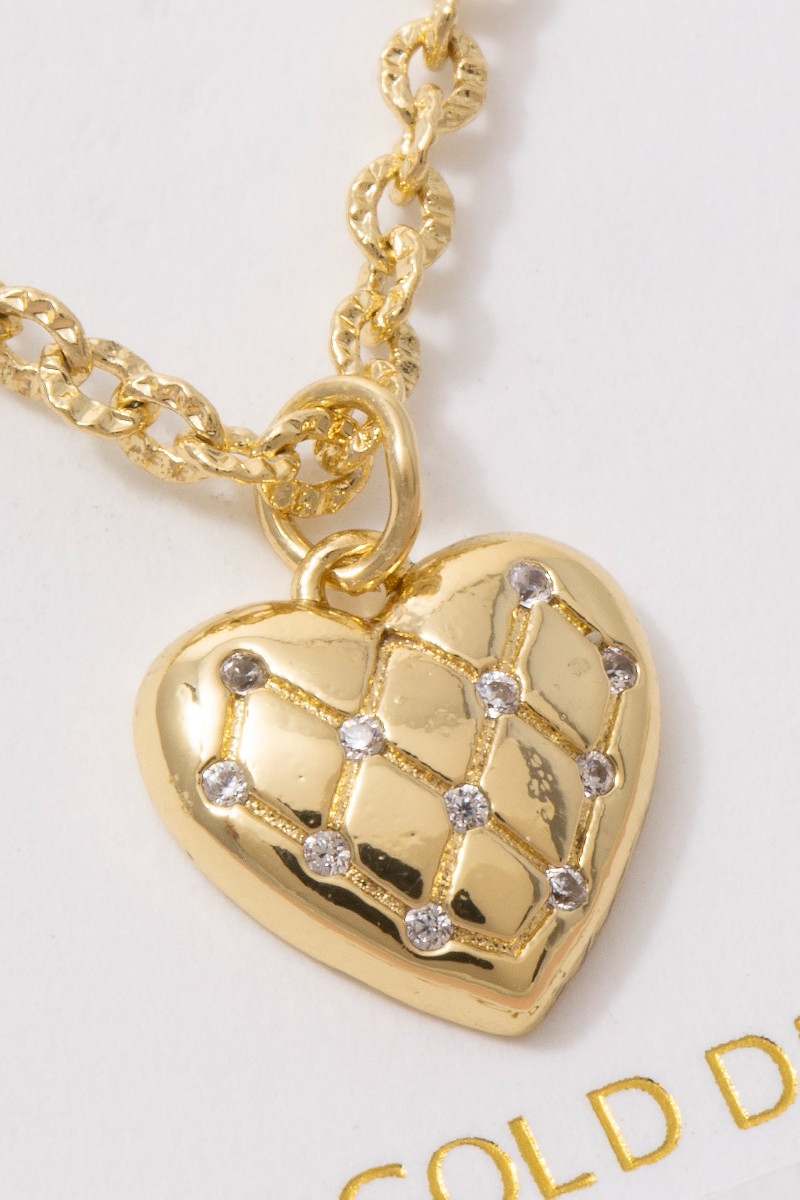 - This pendant necklace showcases a timeless 18k gold dipped quilted heart style. Step into a world of refined taste as this pendant necklace effortlessly refines the details of your outfit.