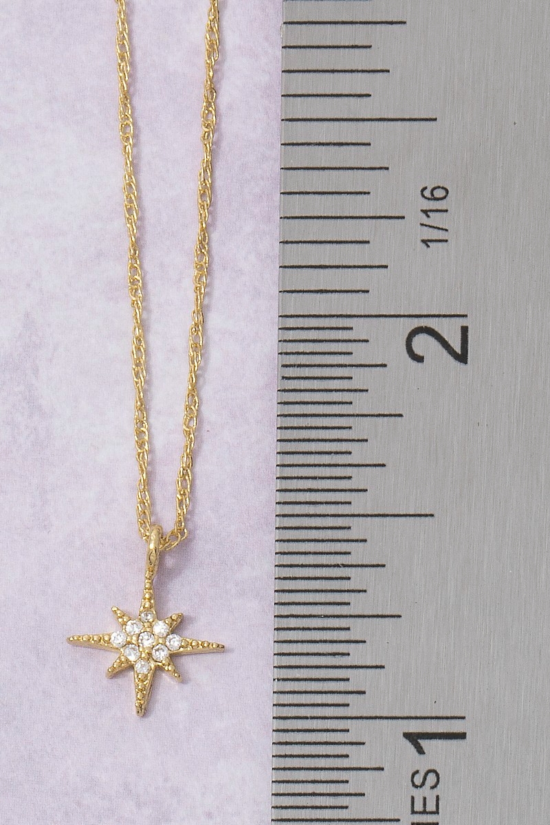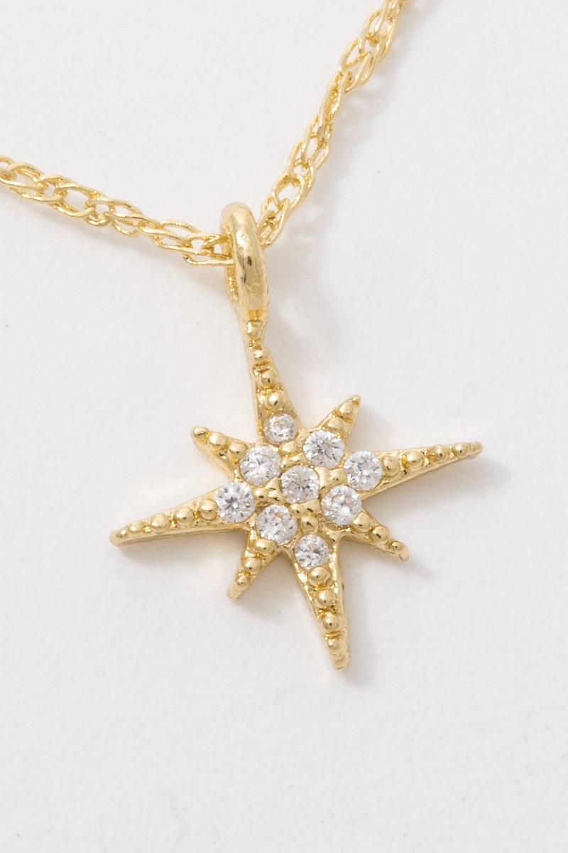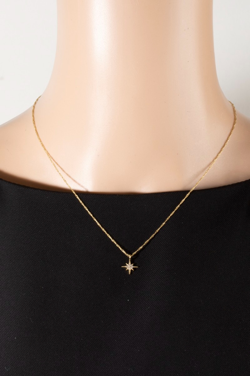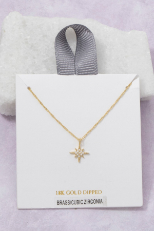 • This pendant necklace features a fashionable 18k gold dipped north star cubic zirconia style. Indulge in the allure of exquisite craftsmanship as this pendant necklace effortlessly adds a touch of luxury to your attire.