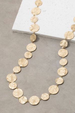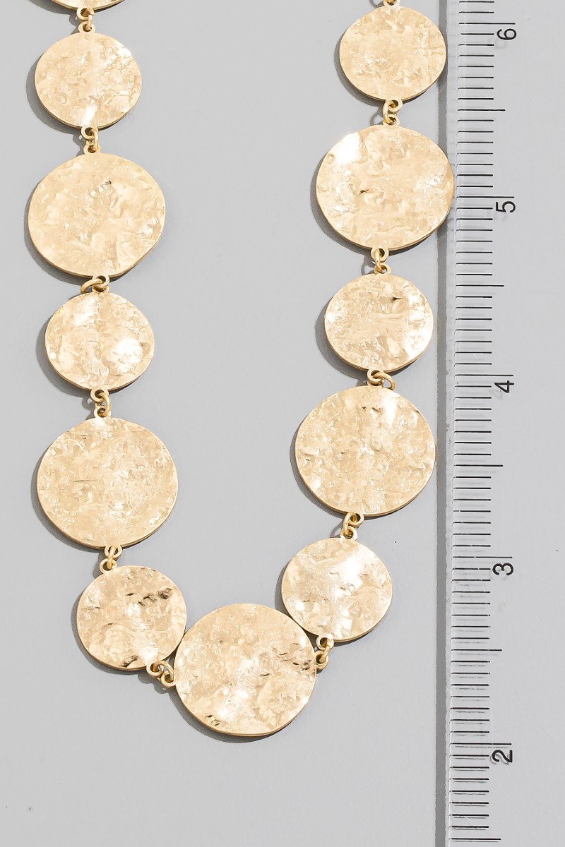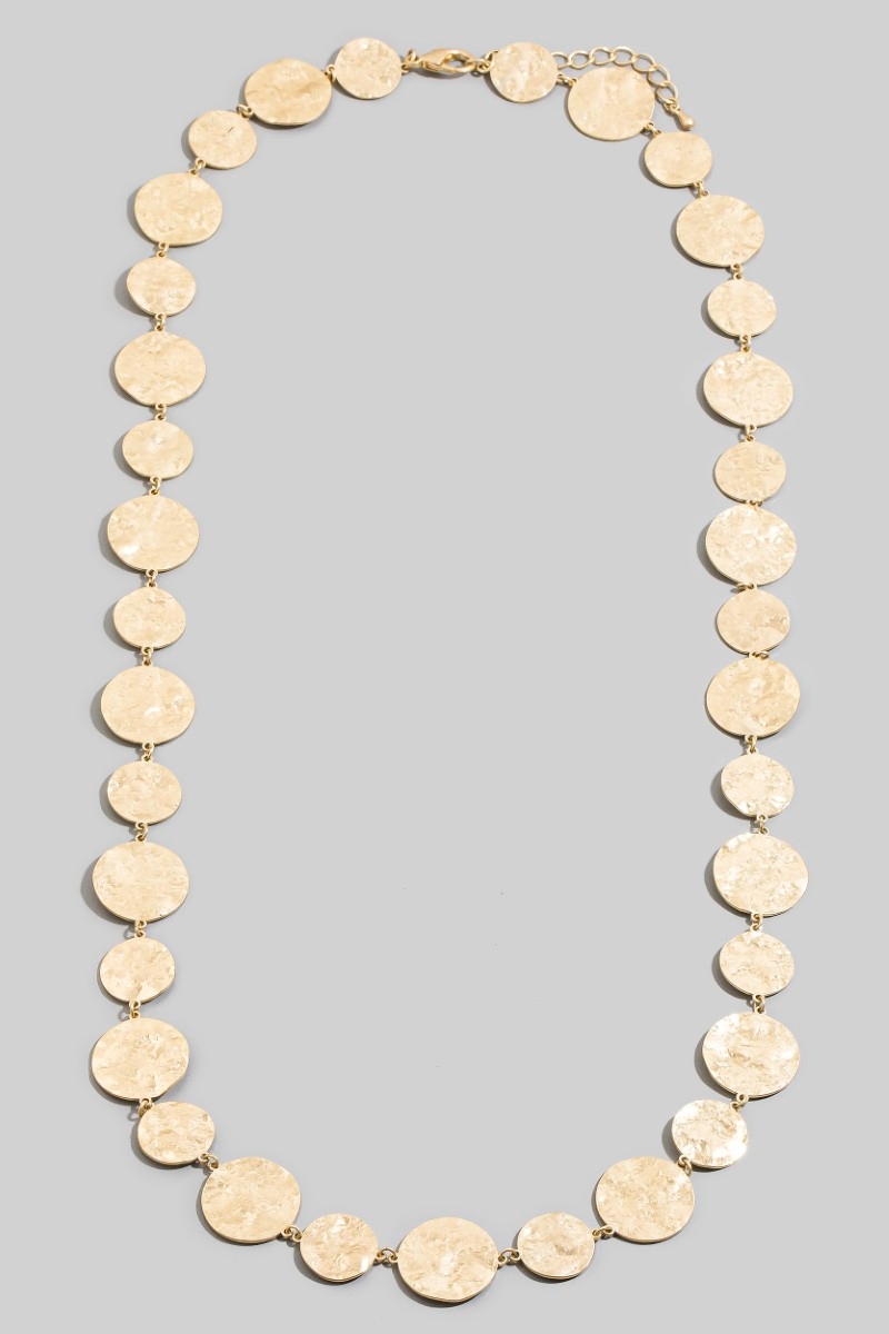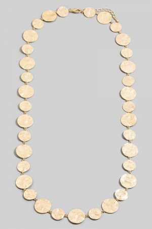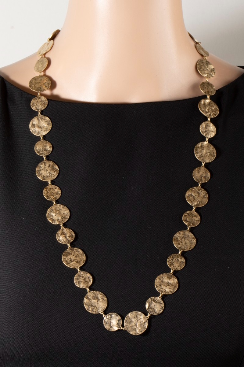 - This chain necklace showcases a timeless hammered gold disc style. Immerse yourself in the world of understated glamour as this chain necklace effortlessly exudes timeless appeal.