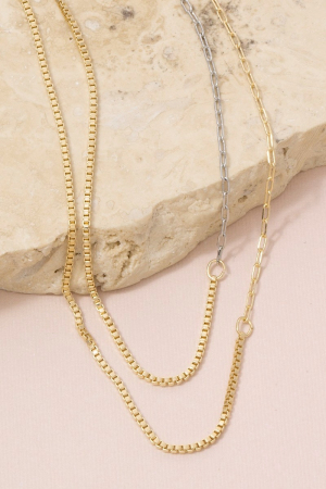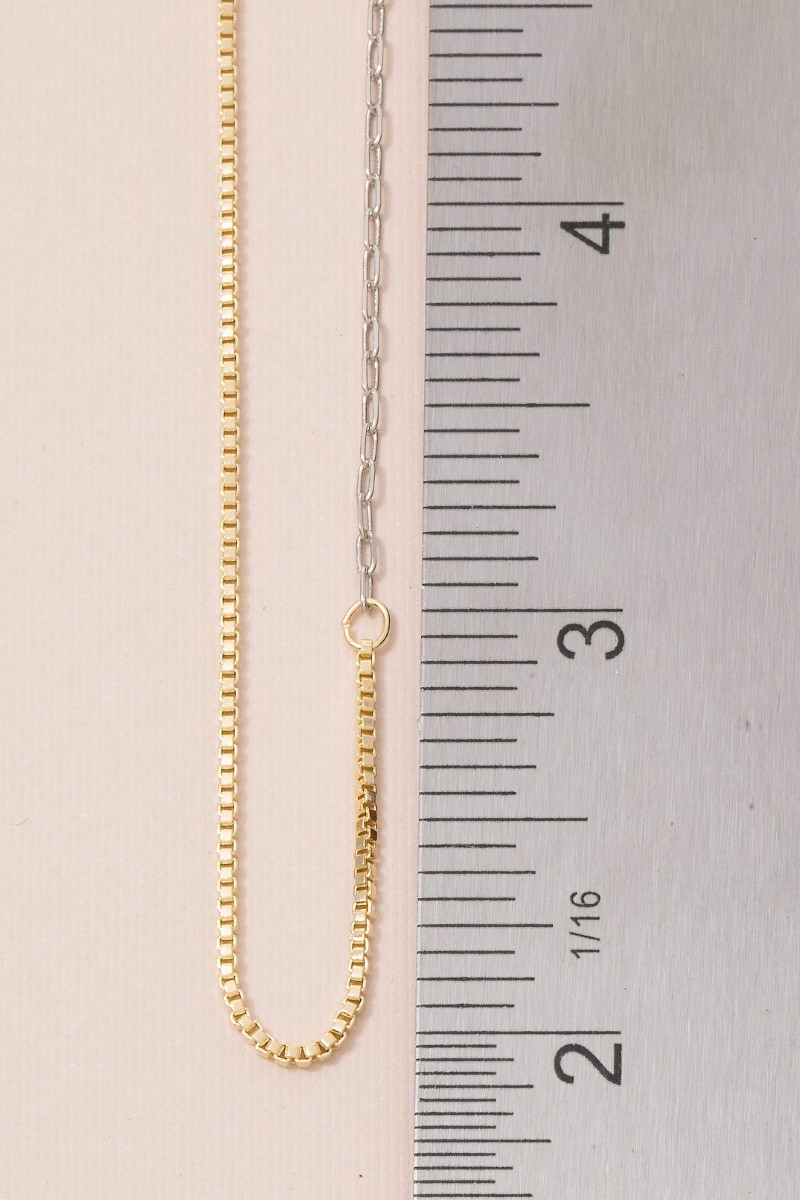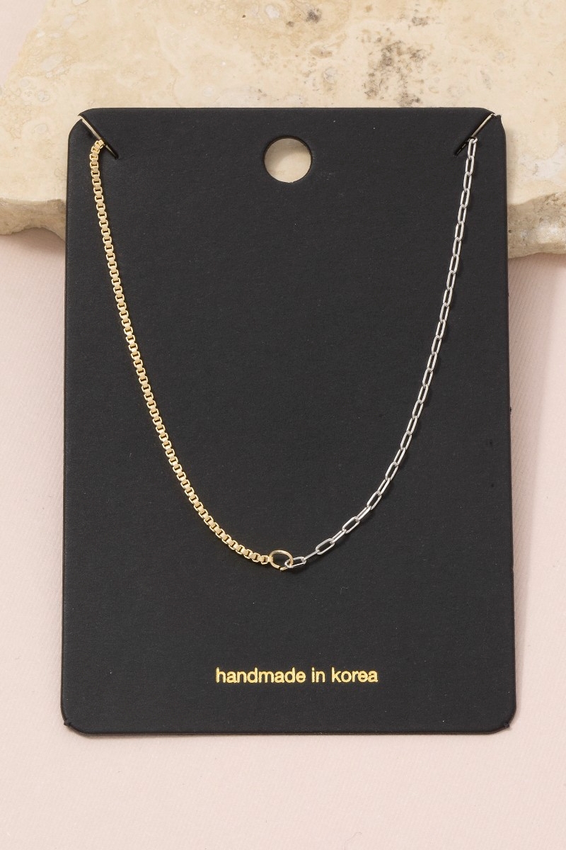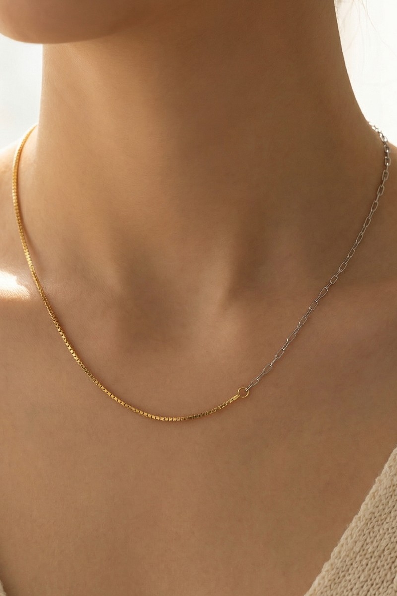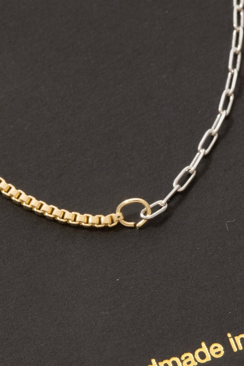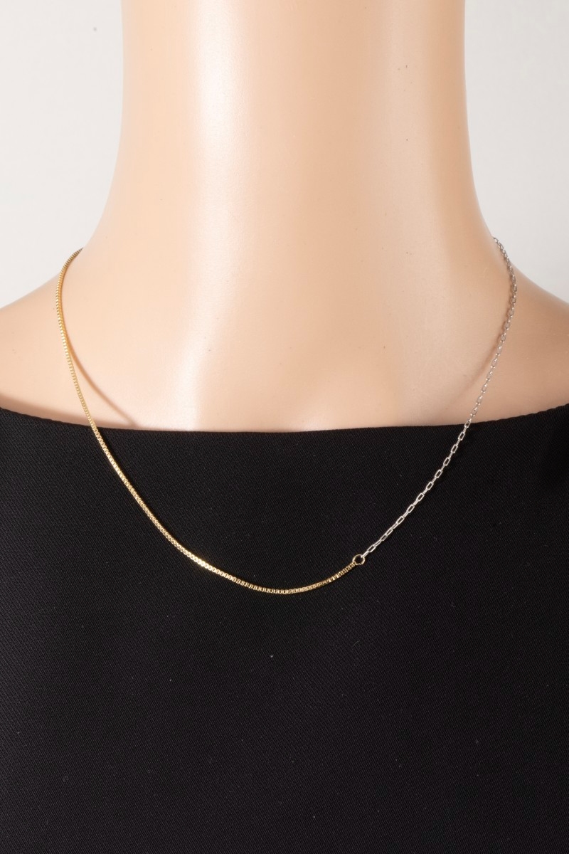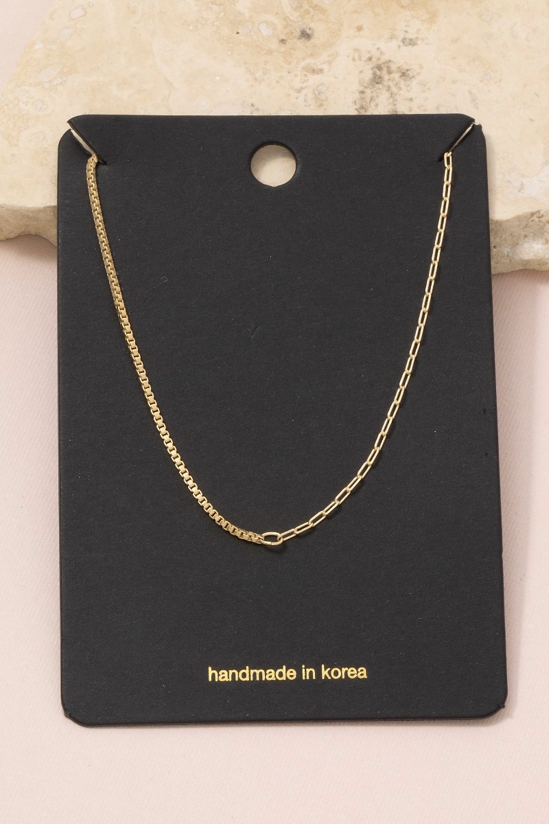 • This chain necklace introduces a stunning gold half box half paperclip style. Unveil modern elegance with this subtly intricate chain necklace.