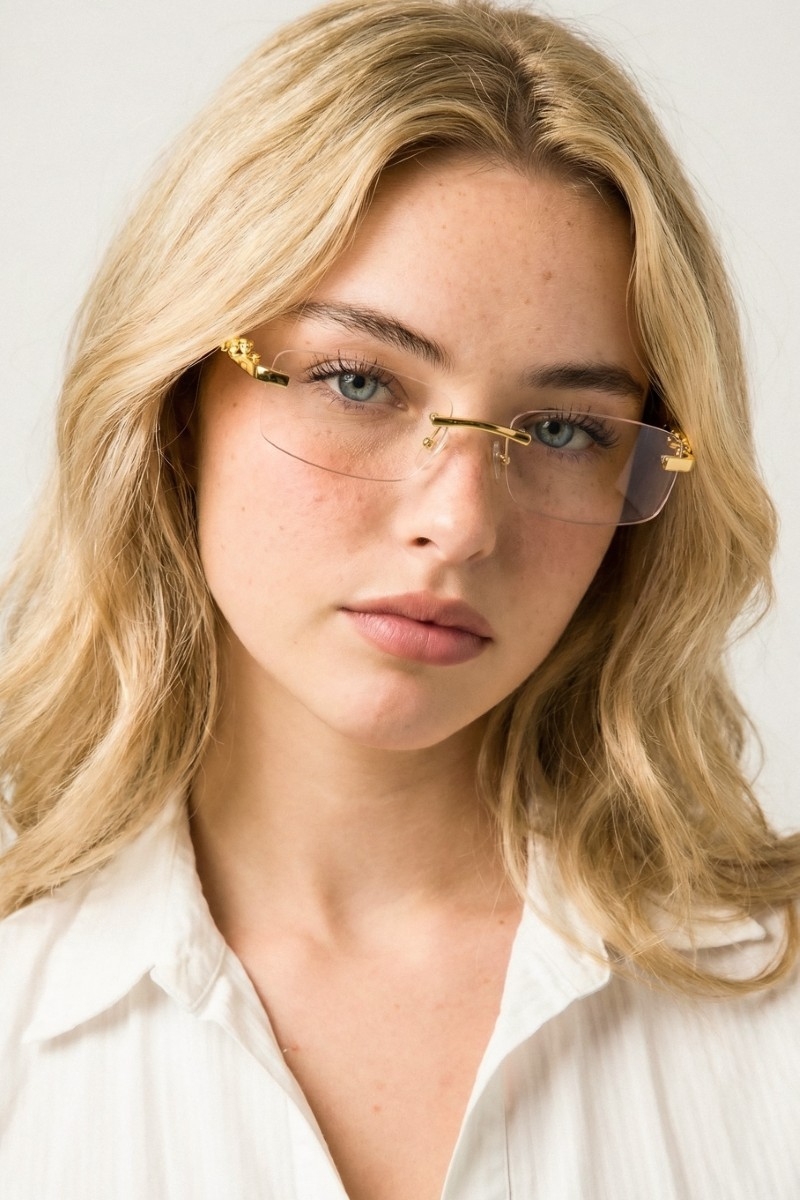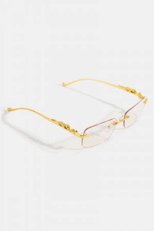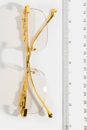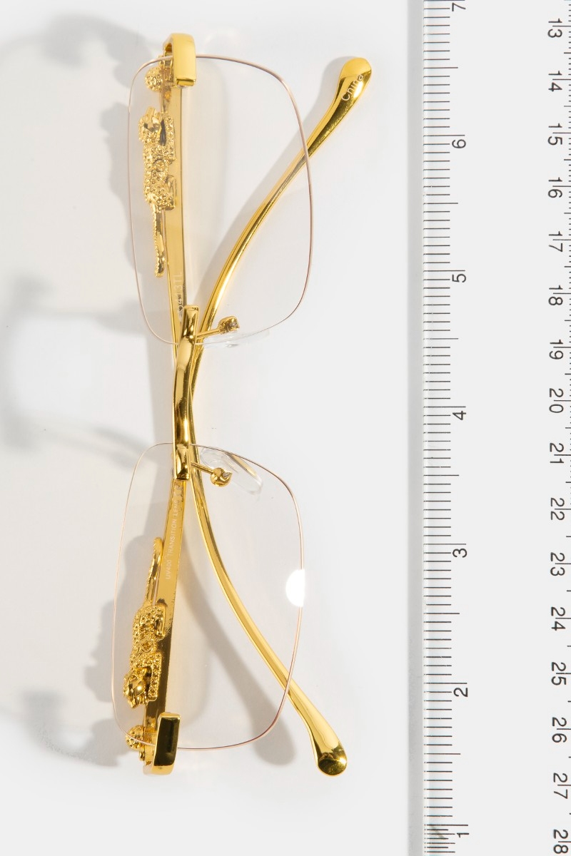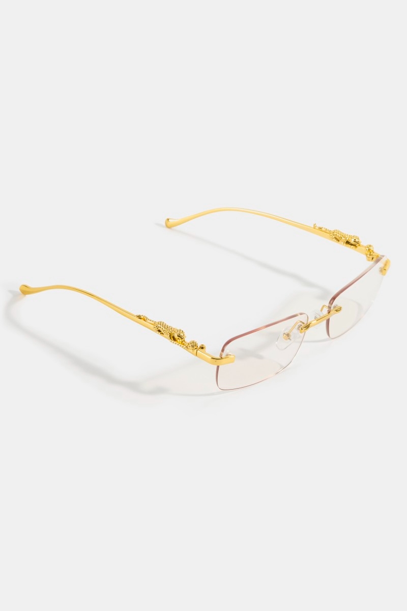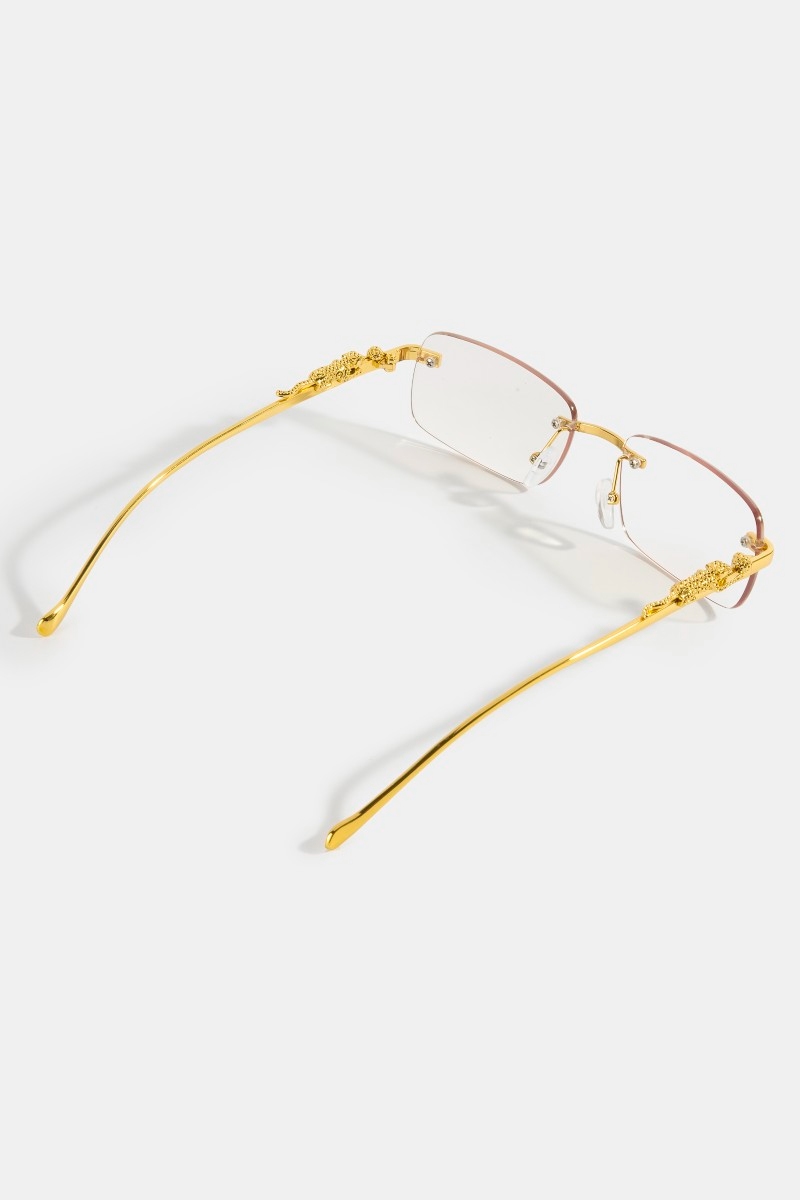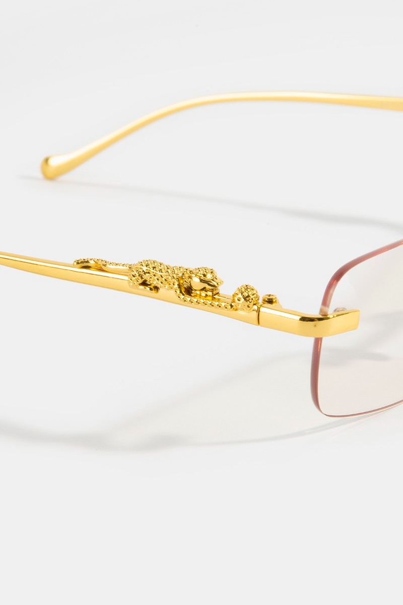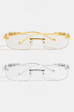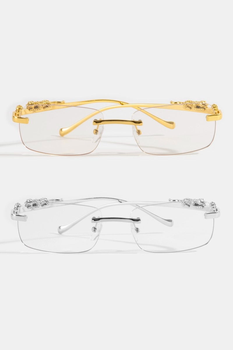 • This set of sunglasses introduces a unique rimless rectangle with ornate panther detail sunglasses set style. Elevate your ensemble with this chic, timeless set of sunglasses.