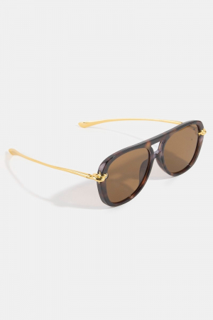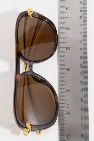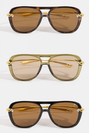 • This set of sunglasses showcases a unique gold knot hardware oversized aviator sunglasses style. Celebrate the art of accessorizing with this piece that effortlessly encapsulates modern trends.