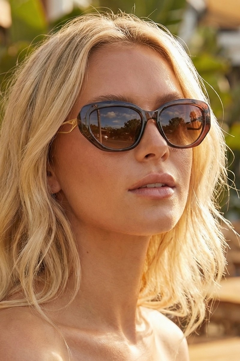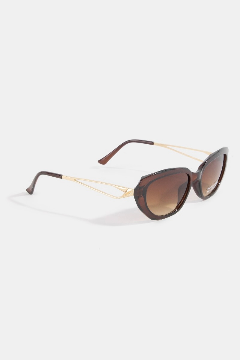 • This set of sunglasses displays a fashionable slim wrap cat-eye sunglasses style. Immerse yourself in fashion finesse with this statement set of sunglasses.