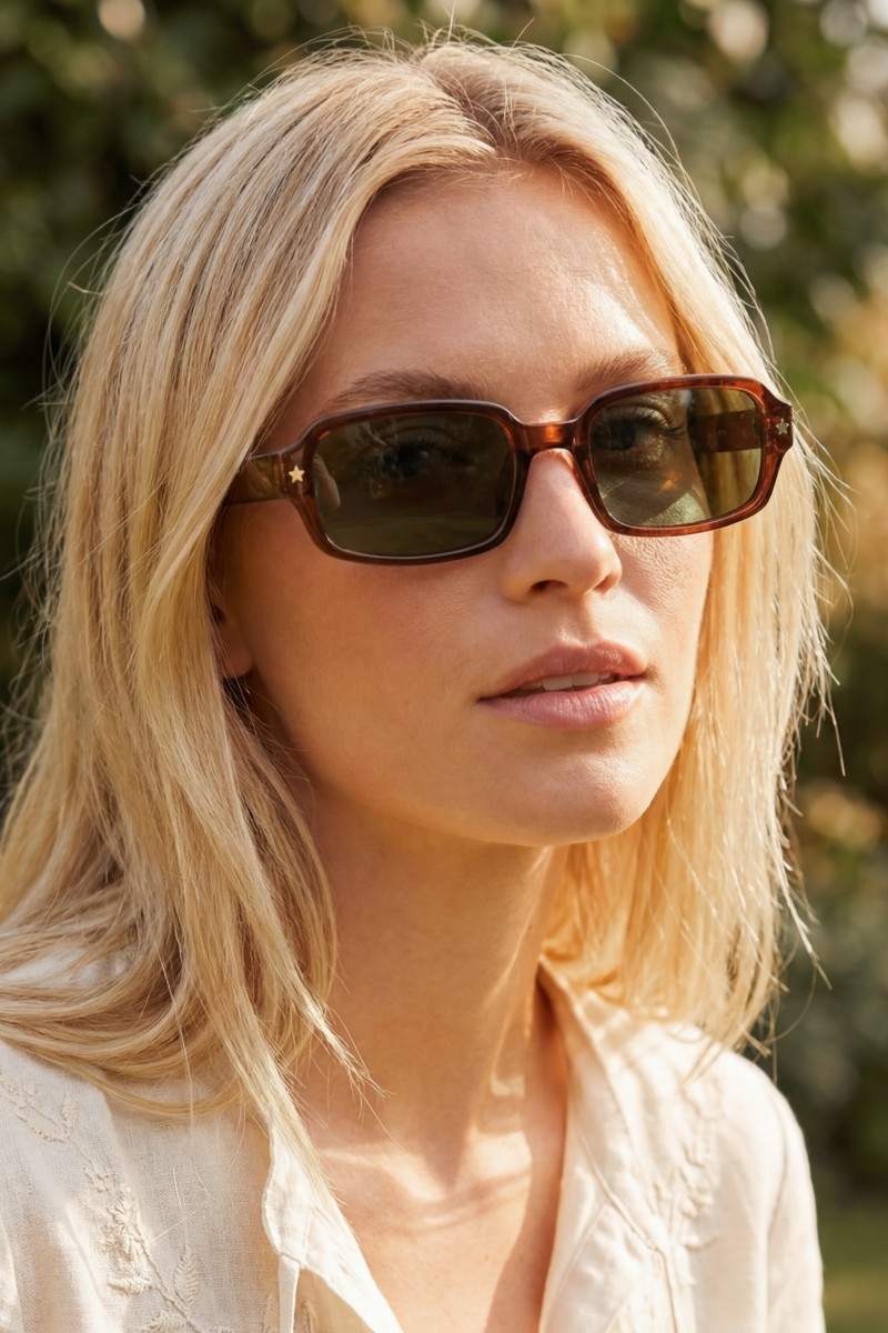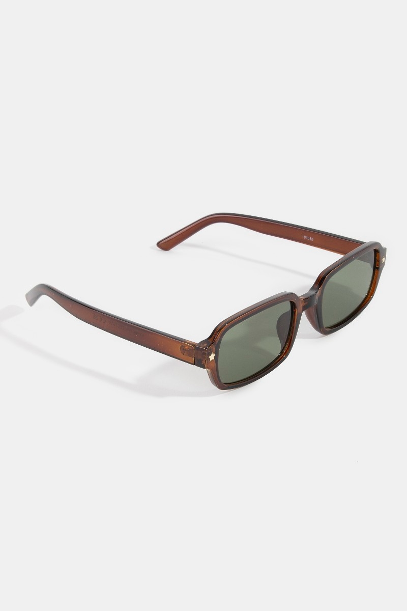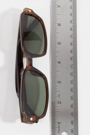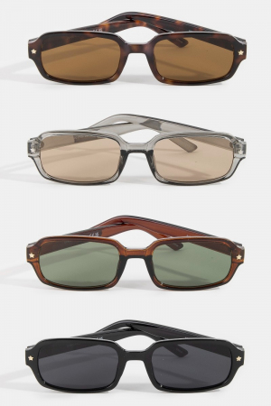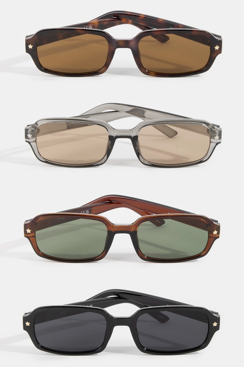 • This set of sunglasses features a fashionable star accent detail rectangle frame sunglasses style. Experience a burst of creativity in accessorizing as this piece effortlessly sets the tone for your unique style.