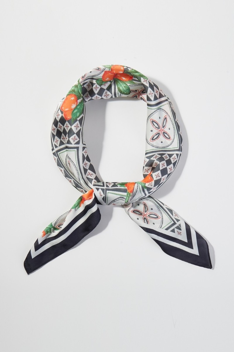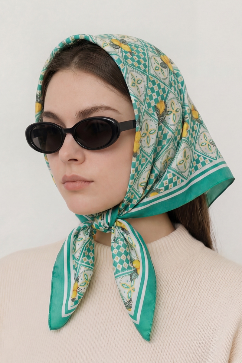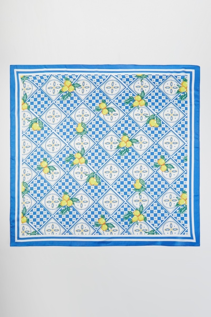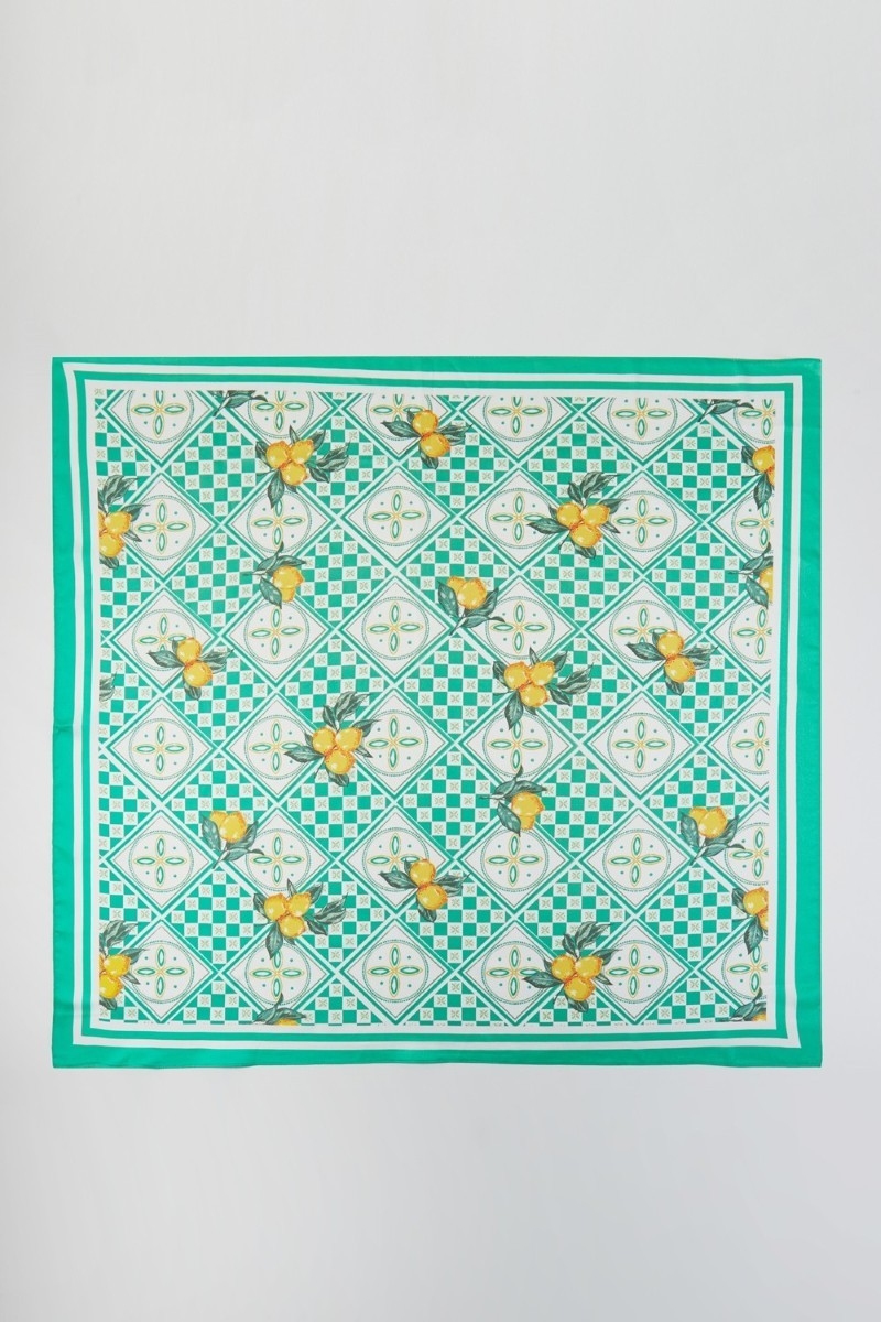 • This scarf brings a luxurious mosaic lemon print square bandana style. Savor the craftsmanship that goes beyond the ordinary, as this scarf effortlessly captivates attention.
